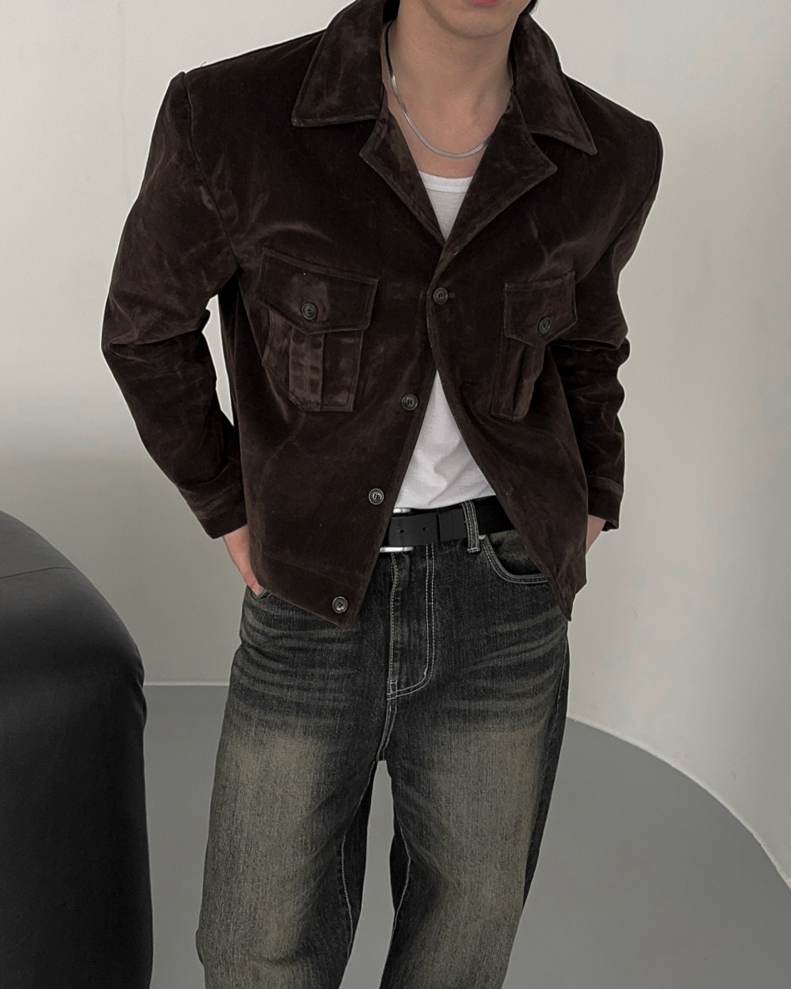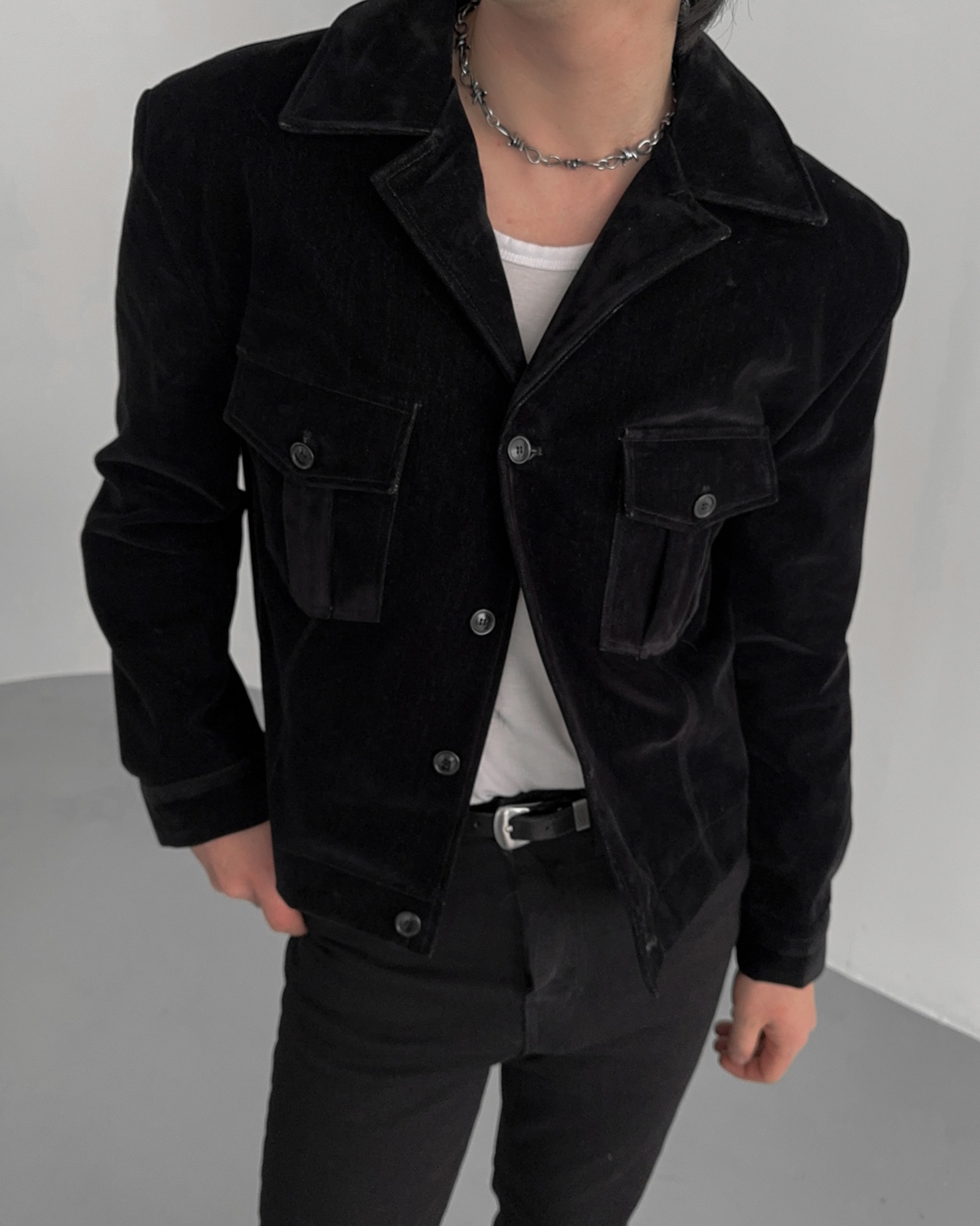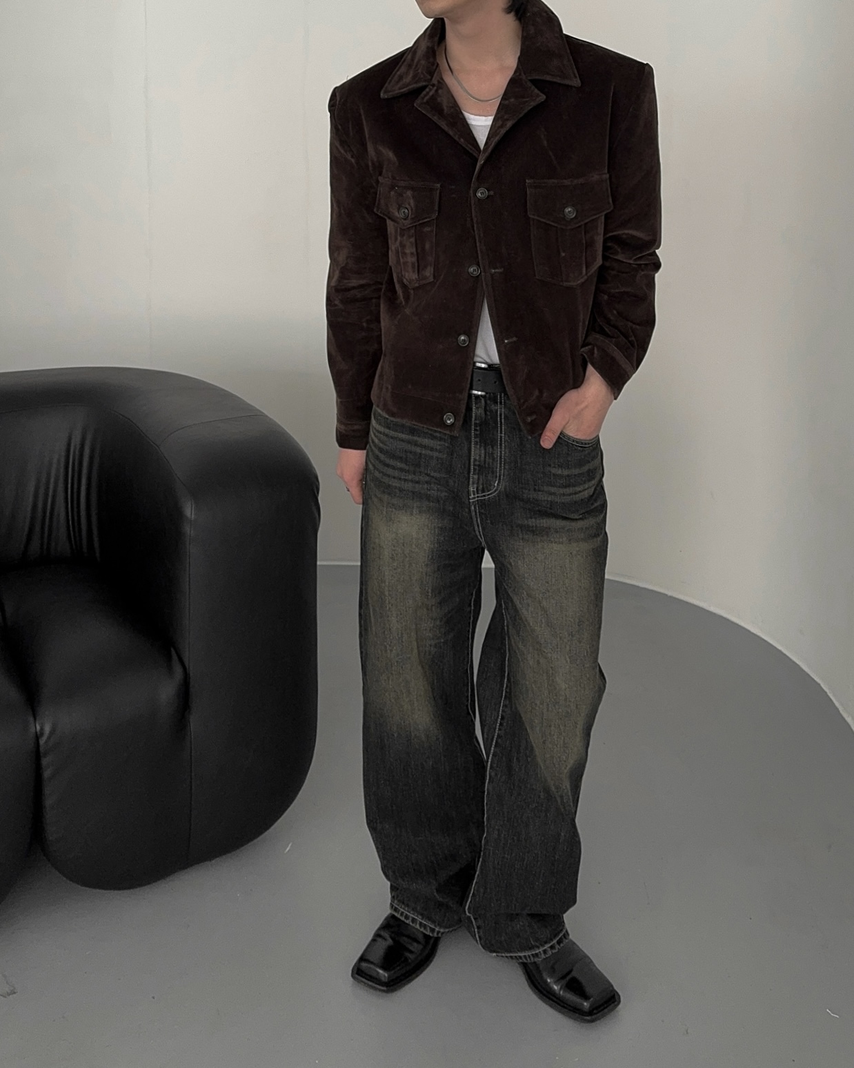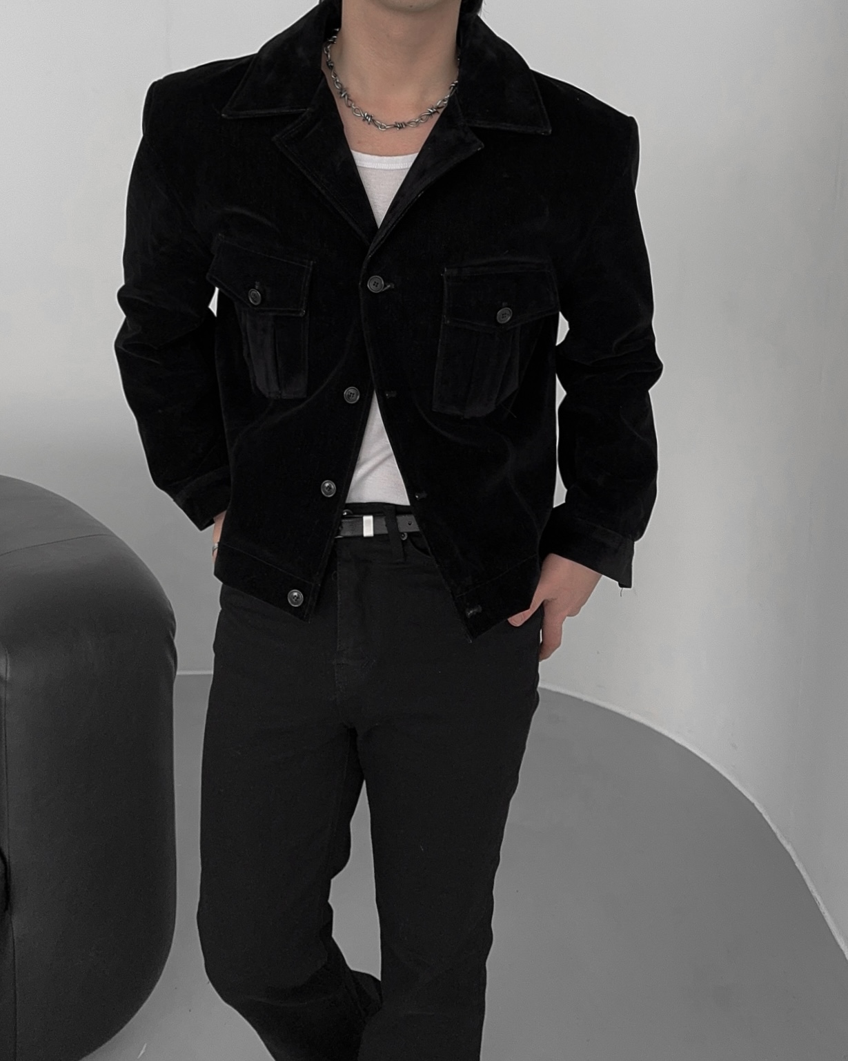 -탄탄한 데님 소재로 제작된 벨벳 질감의 자켓