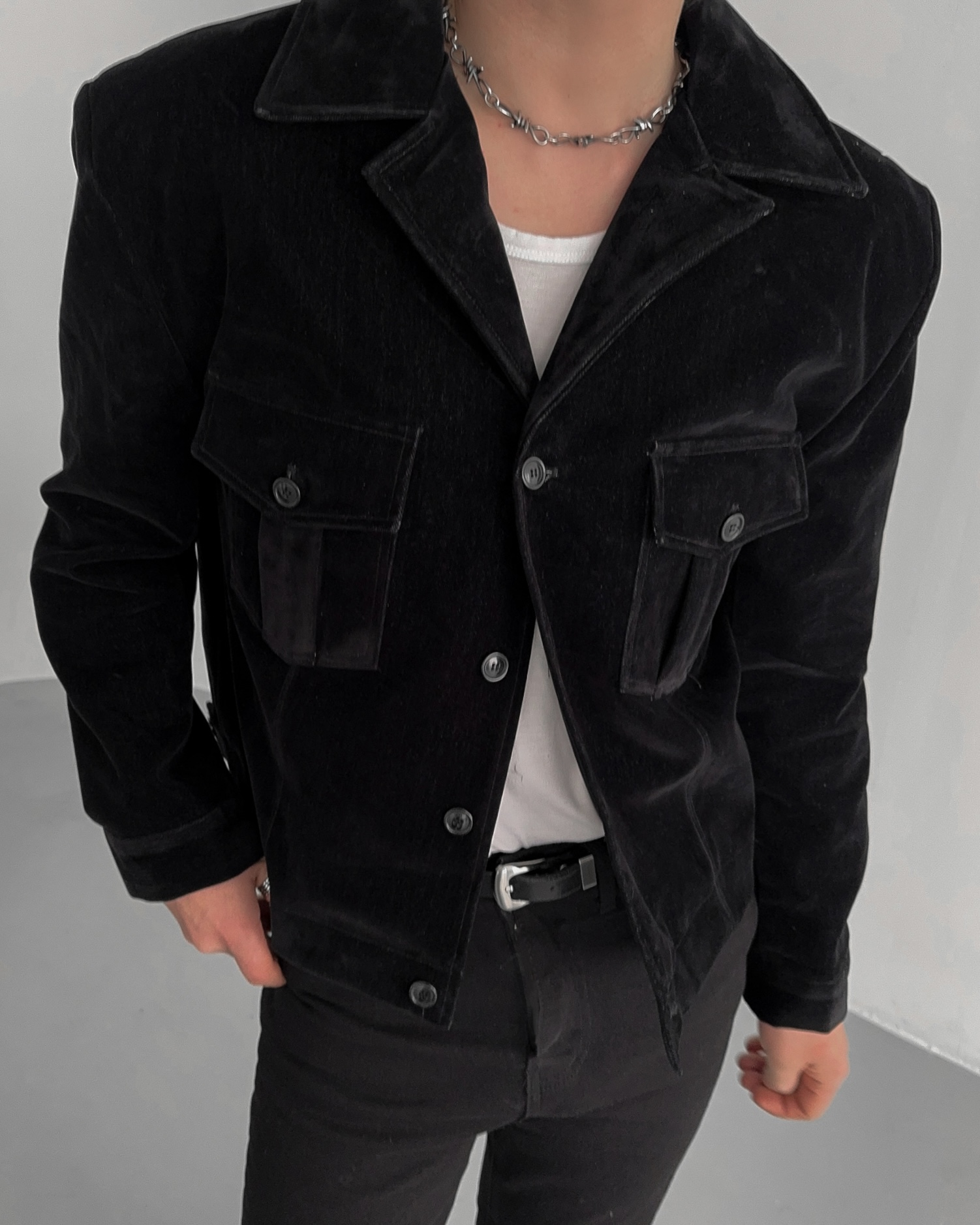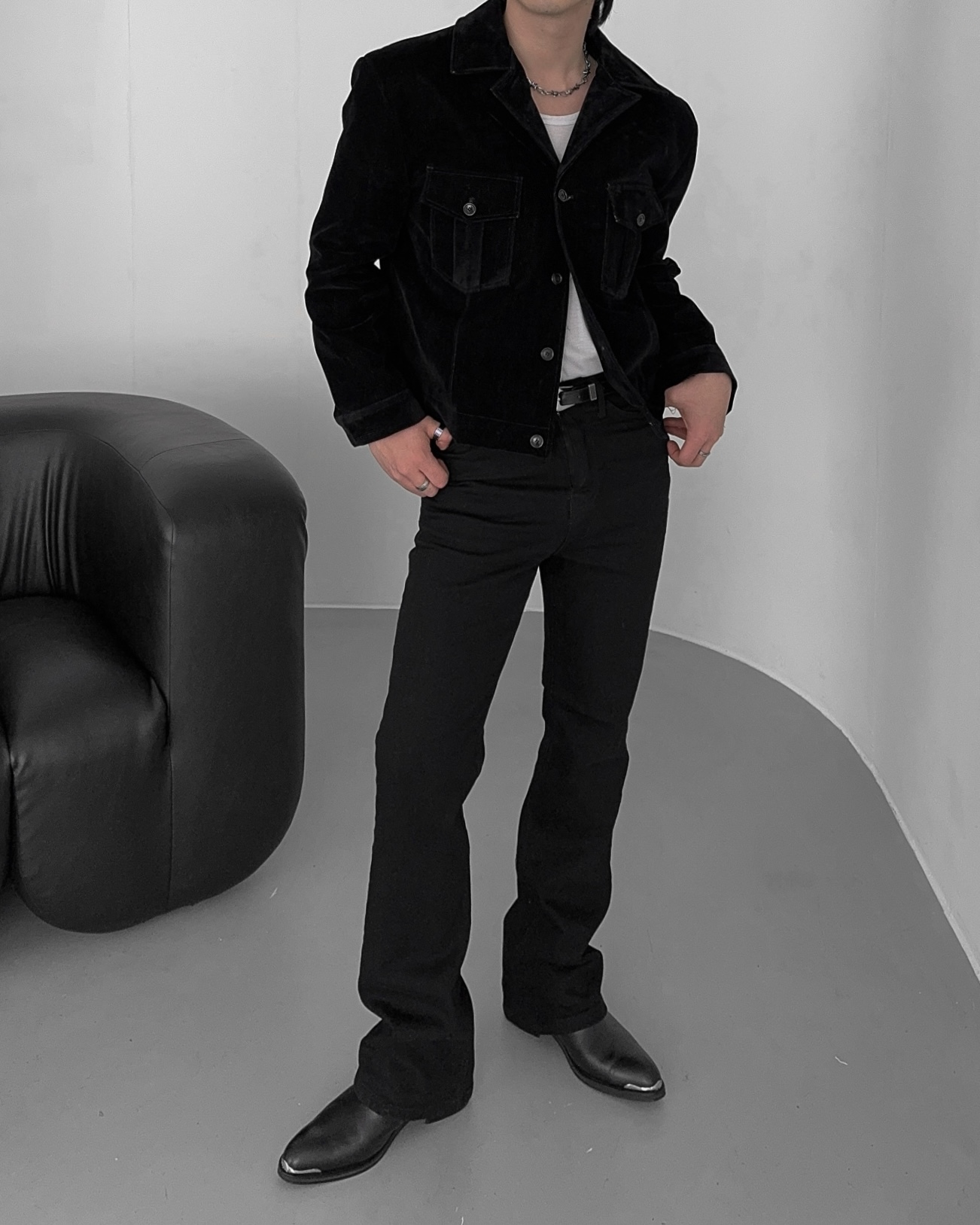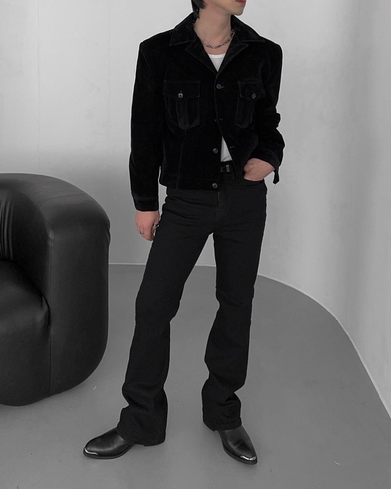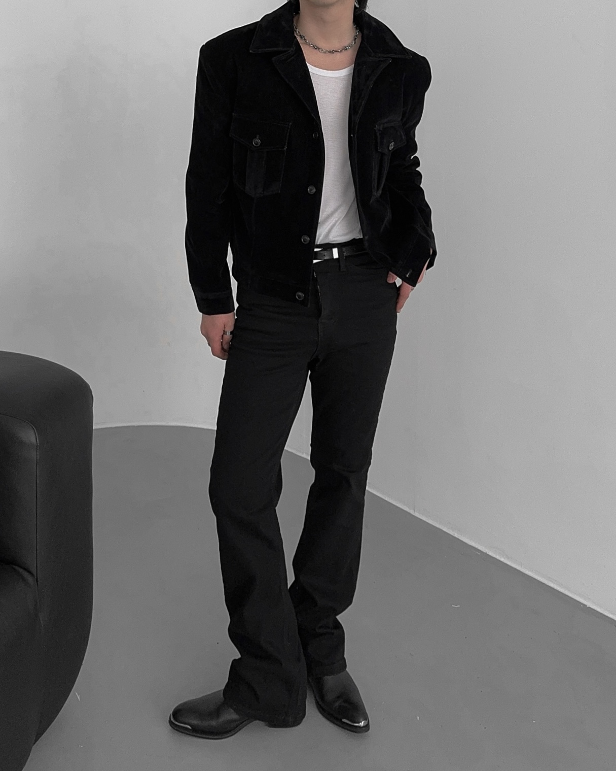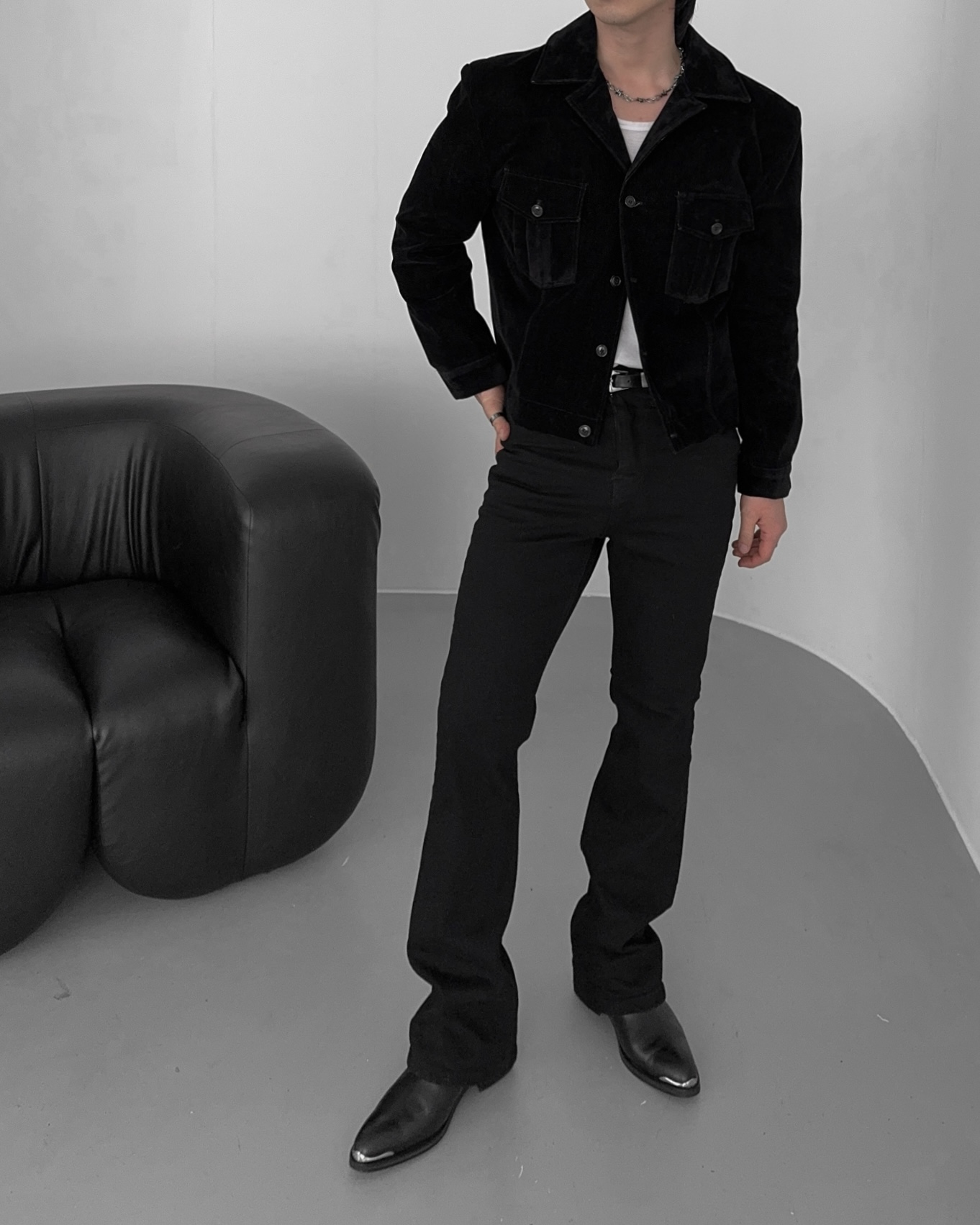 -탄탄한 데님 소재로 제작된 벨벳 질감의 자켓