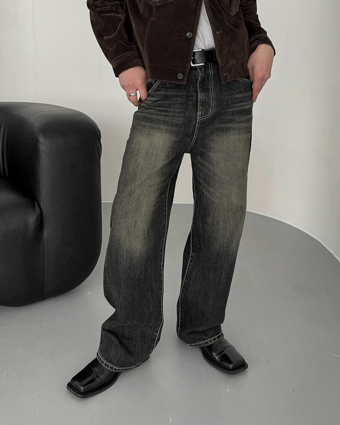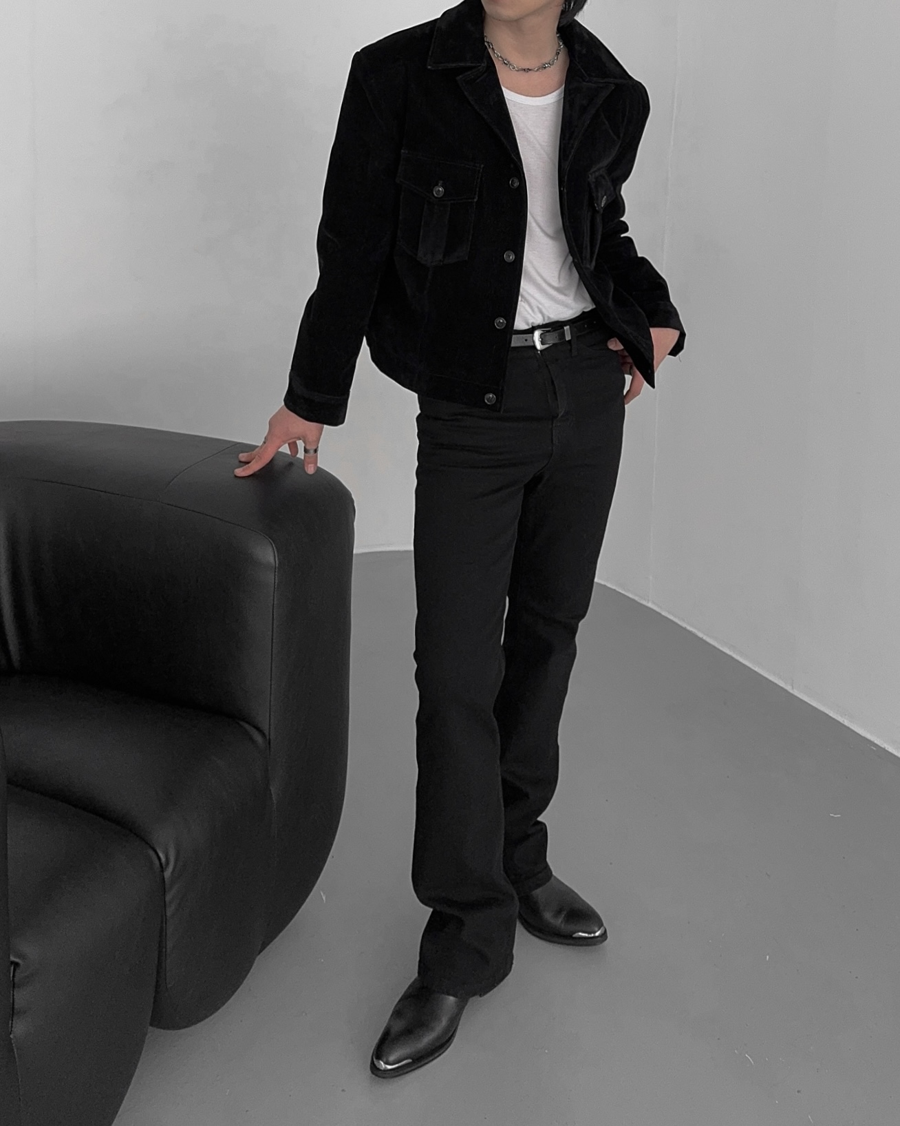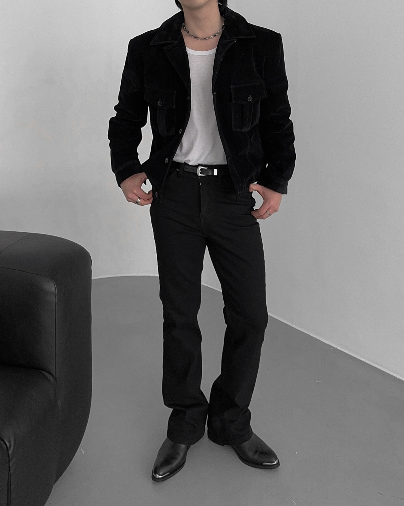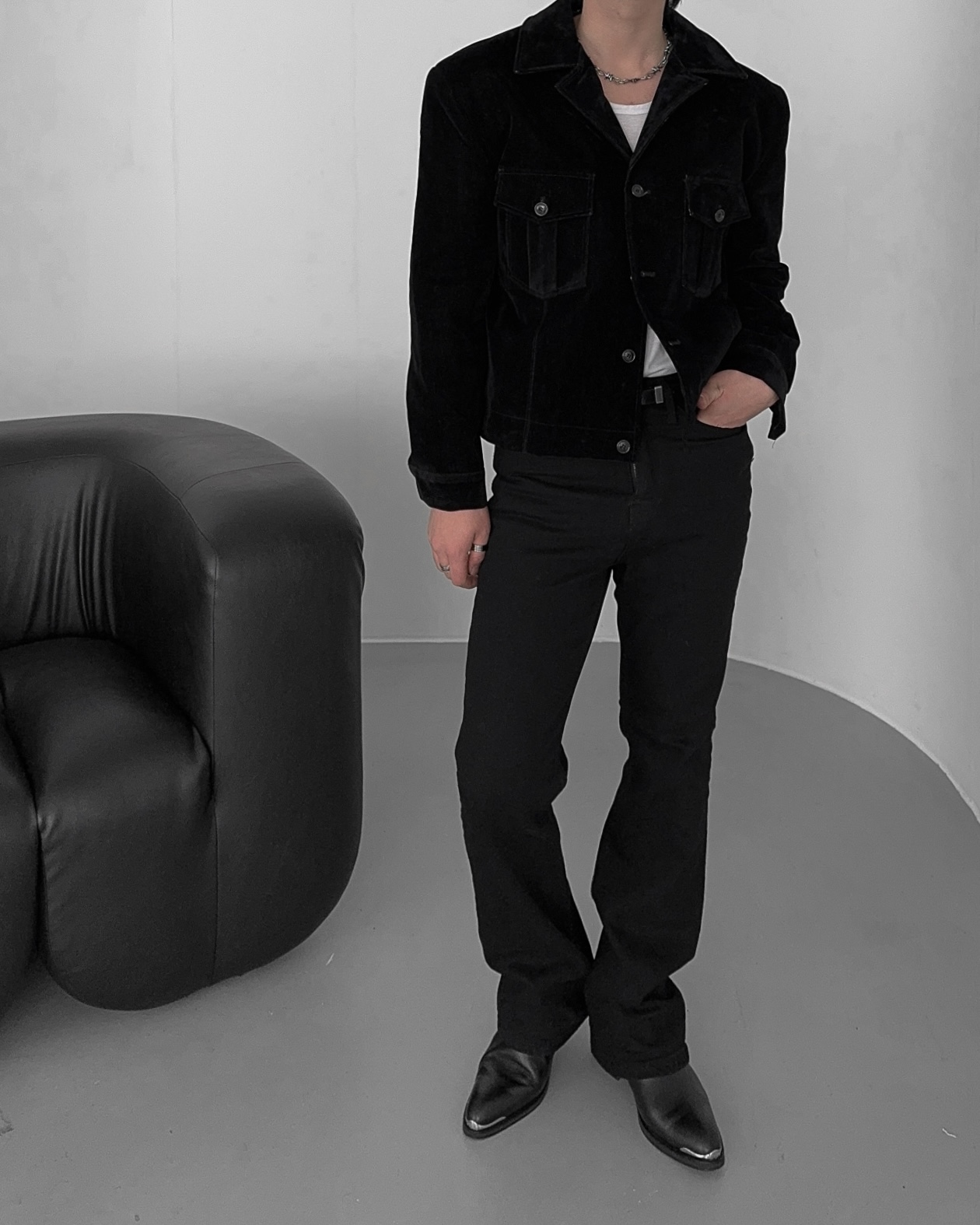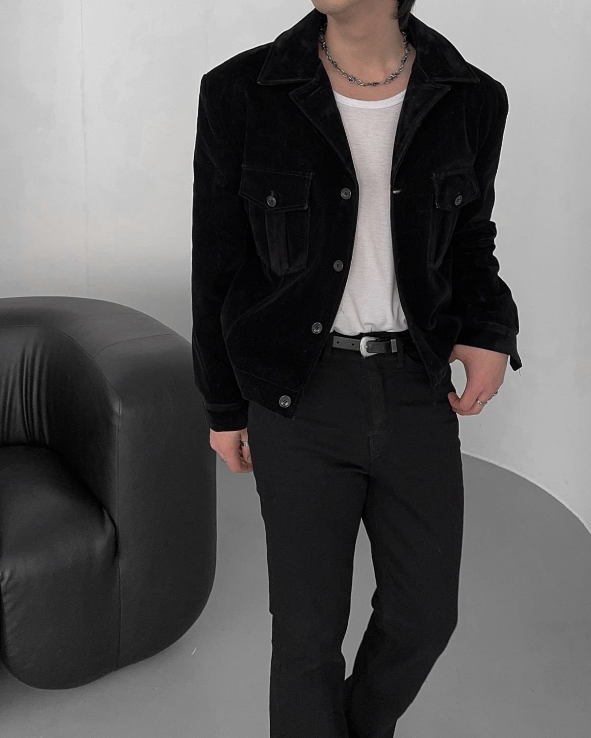 -탄탄한 데님 소재로 제작된 벨벳 질감의 자켓