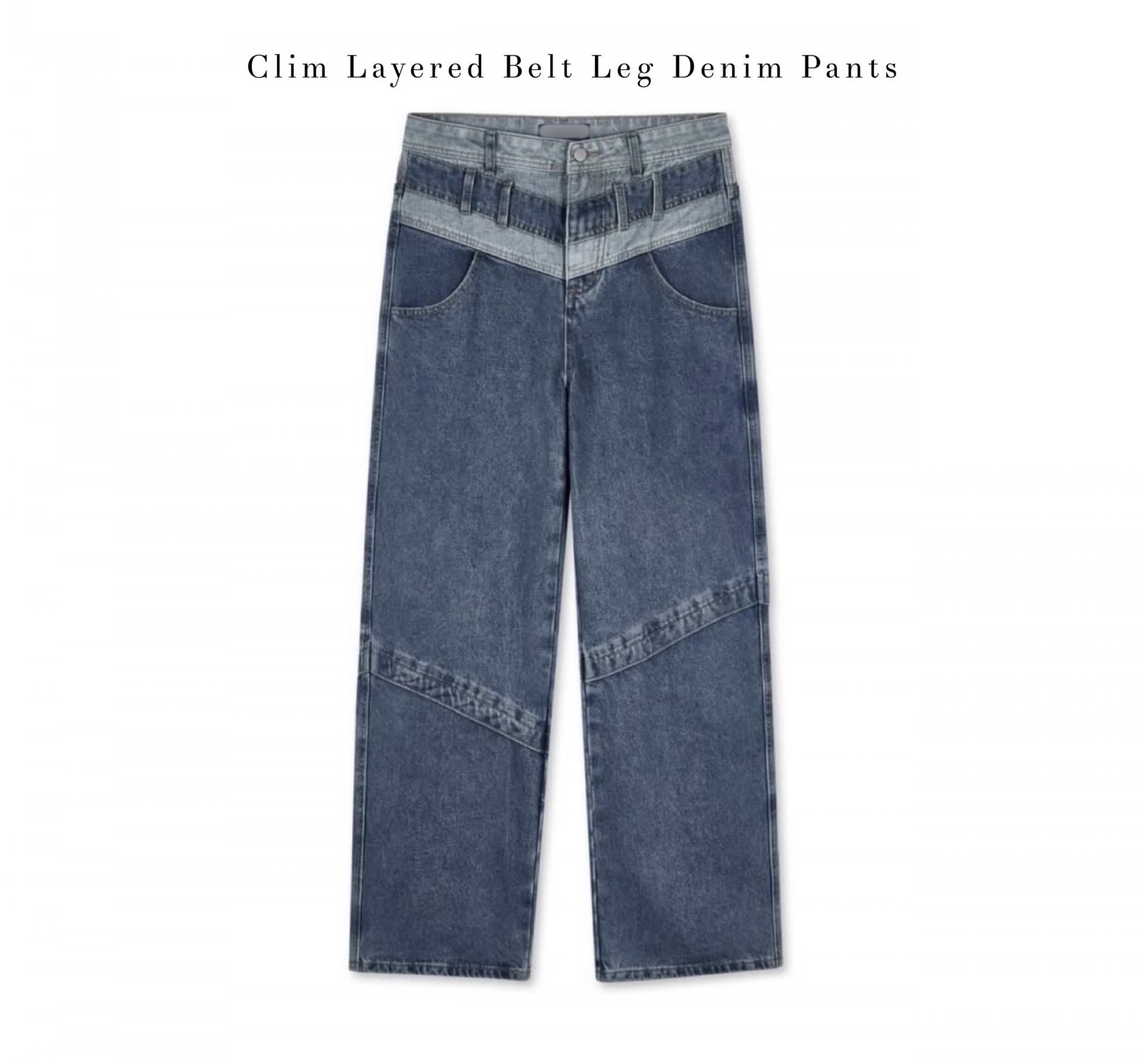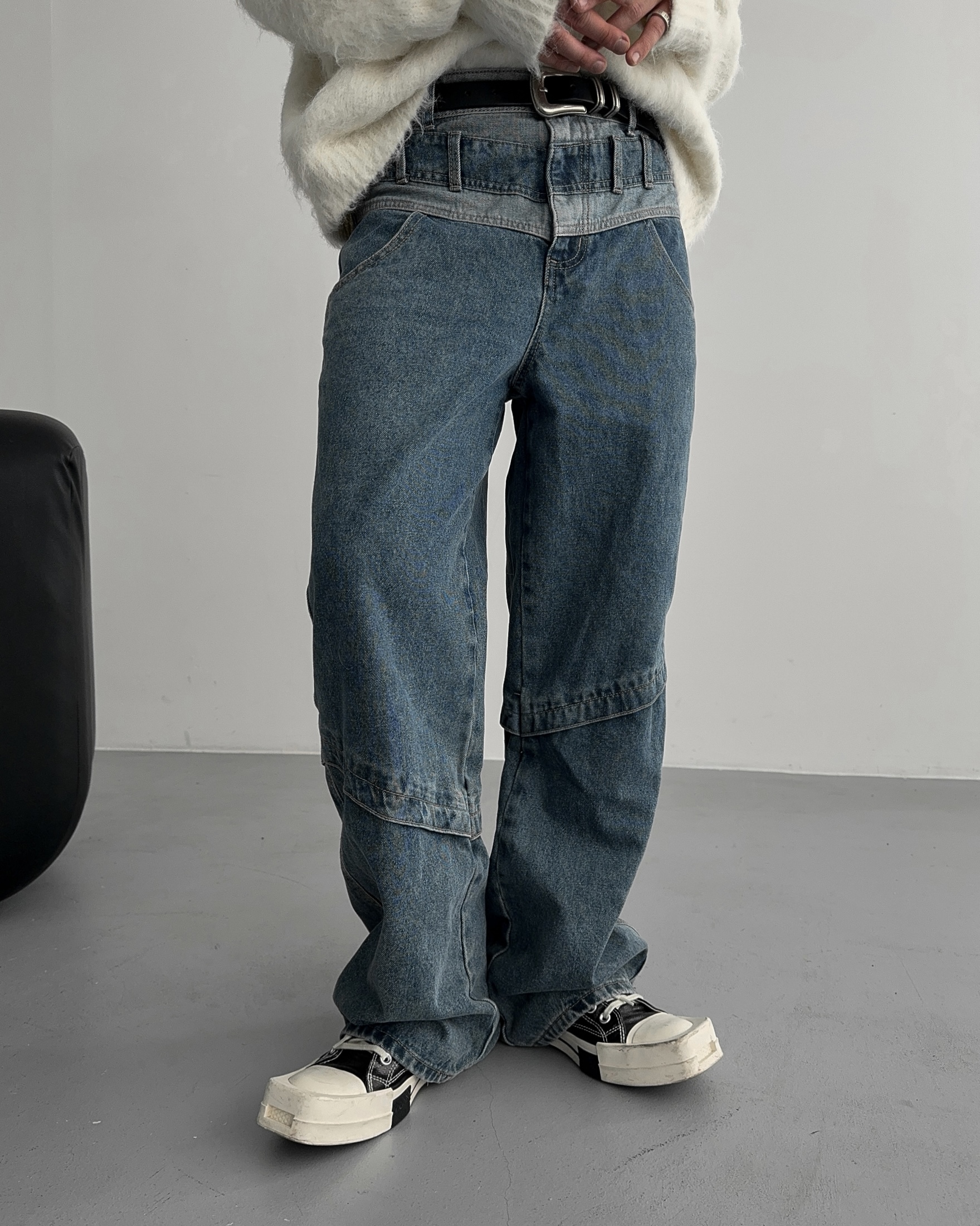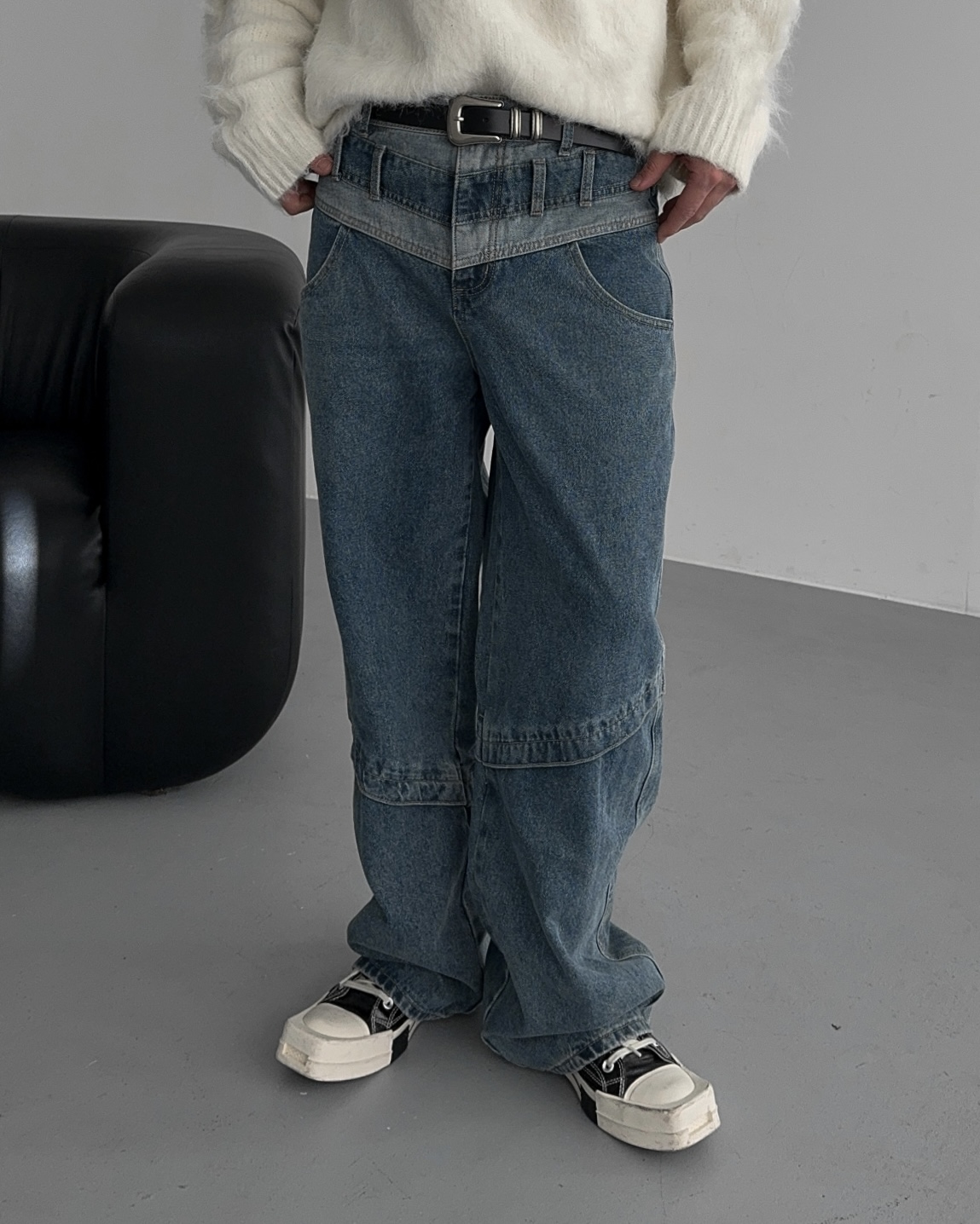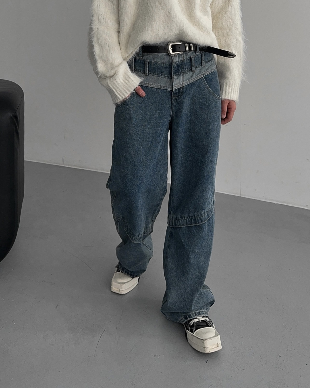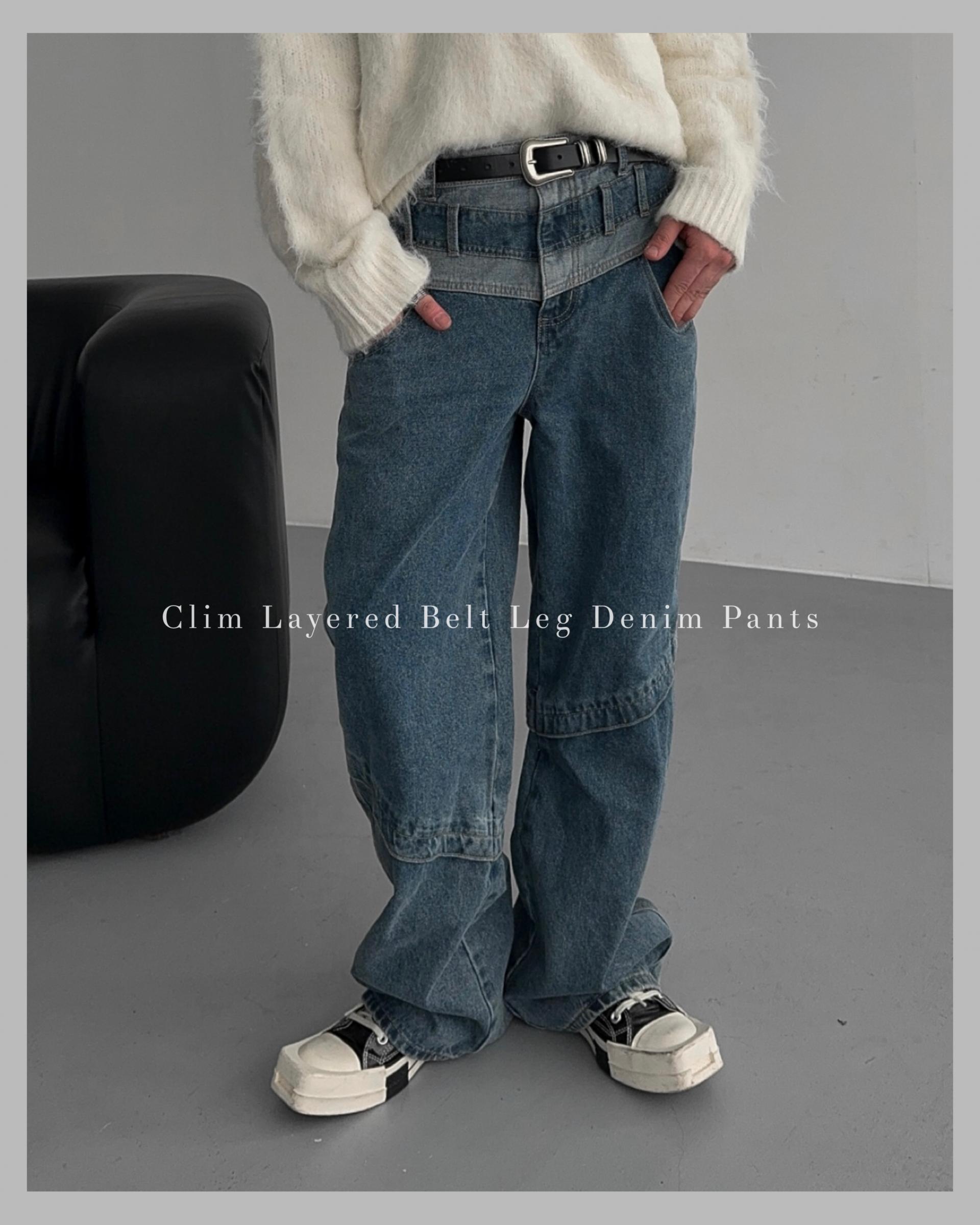 -벨트 레이어드 라인 연출의 데님 팬츠