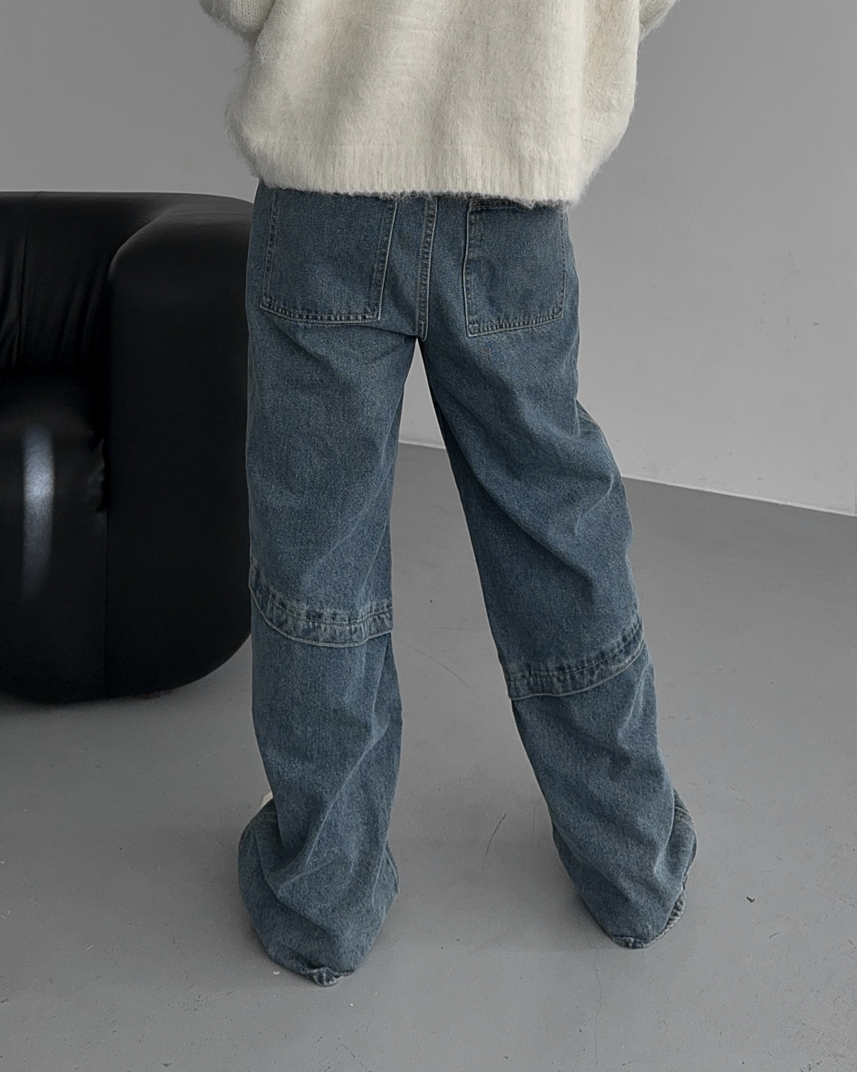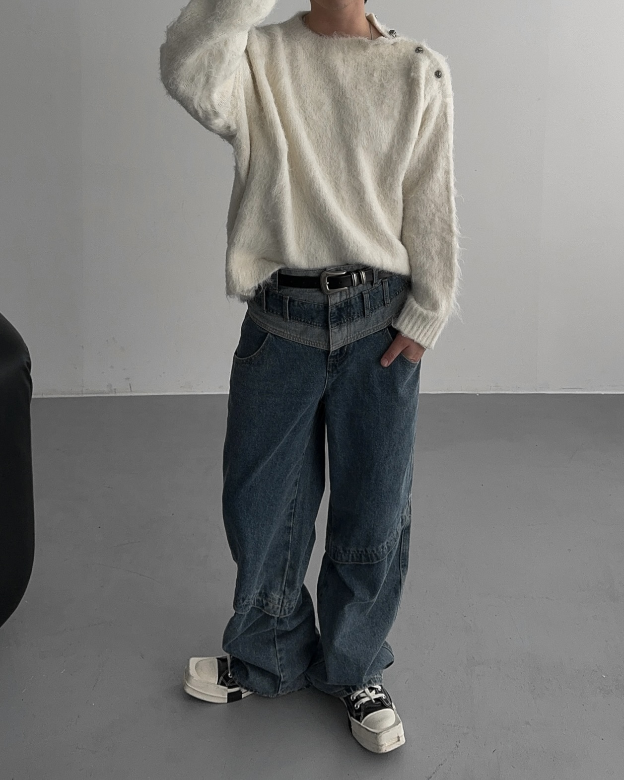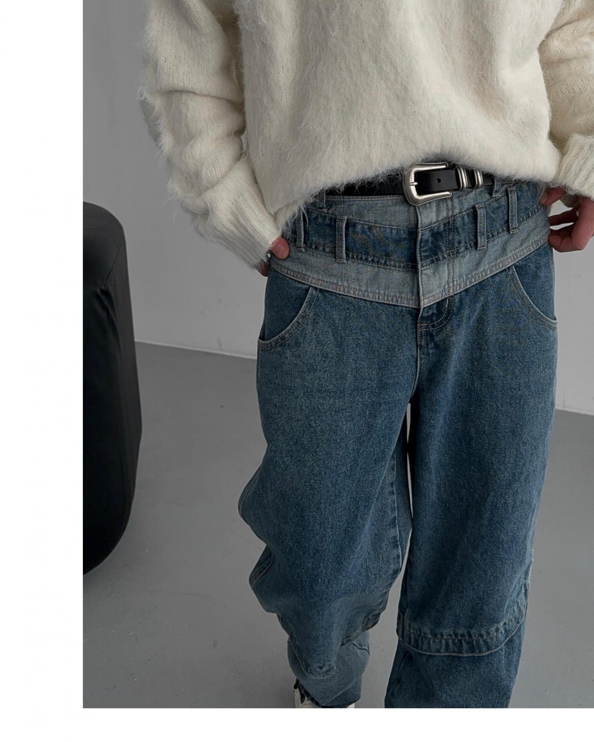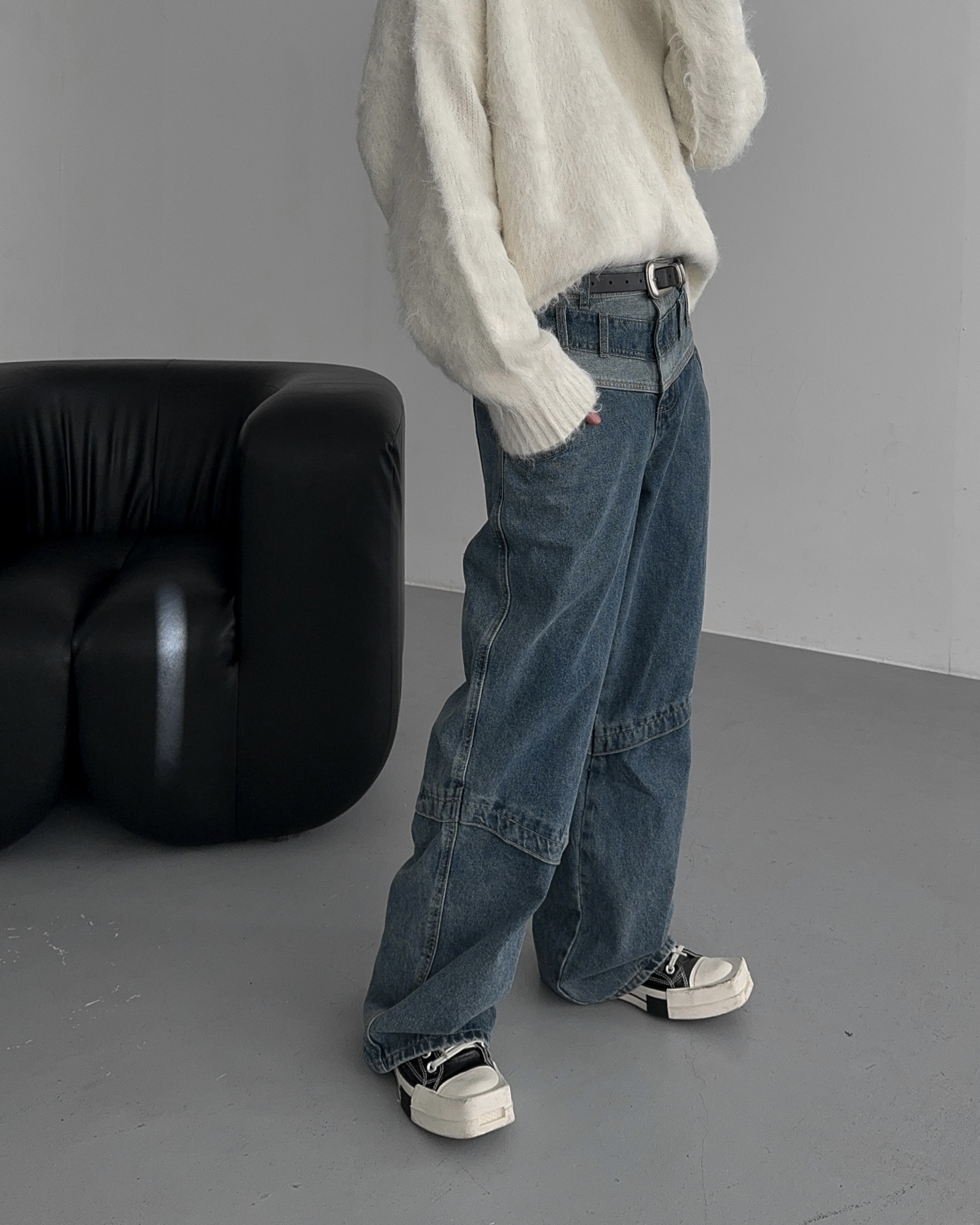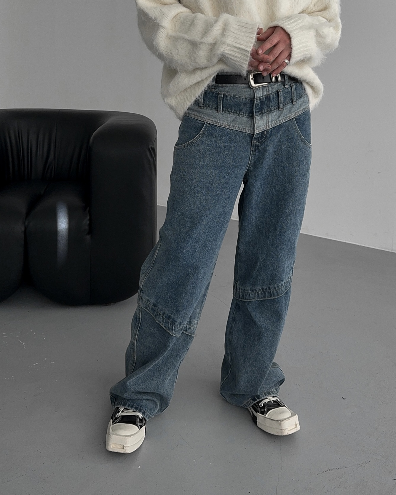 -벨트 레이어드 라인 연출의 데님 팬츠