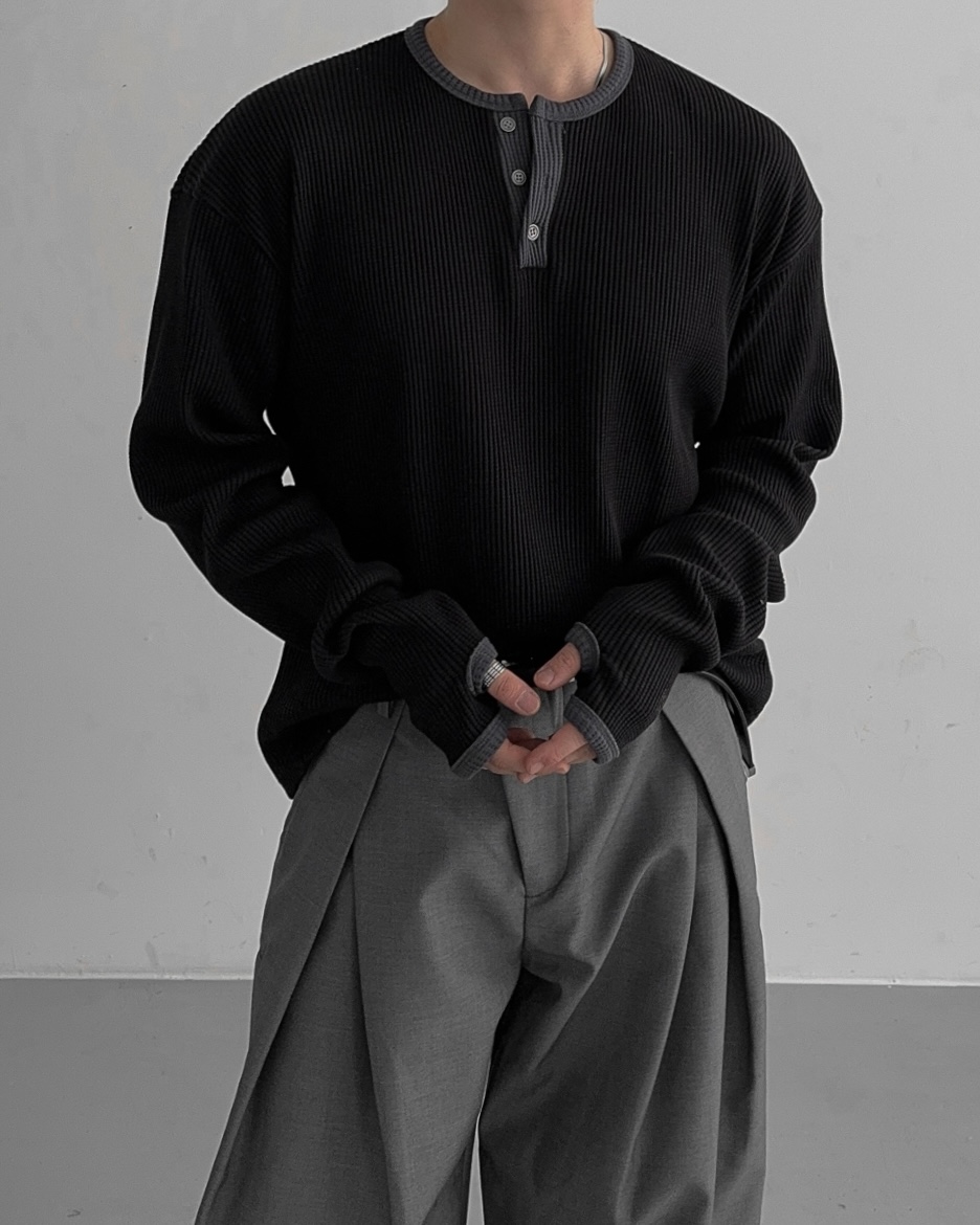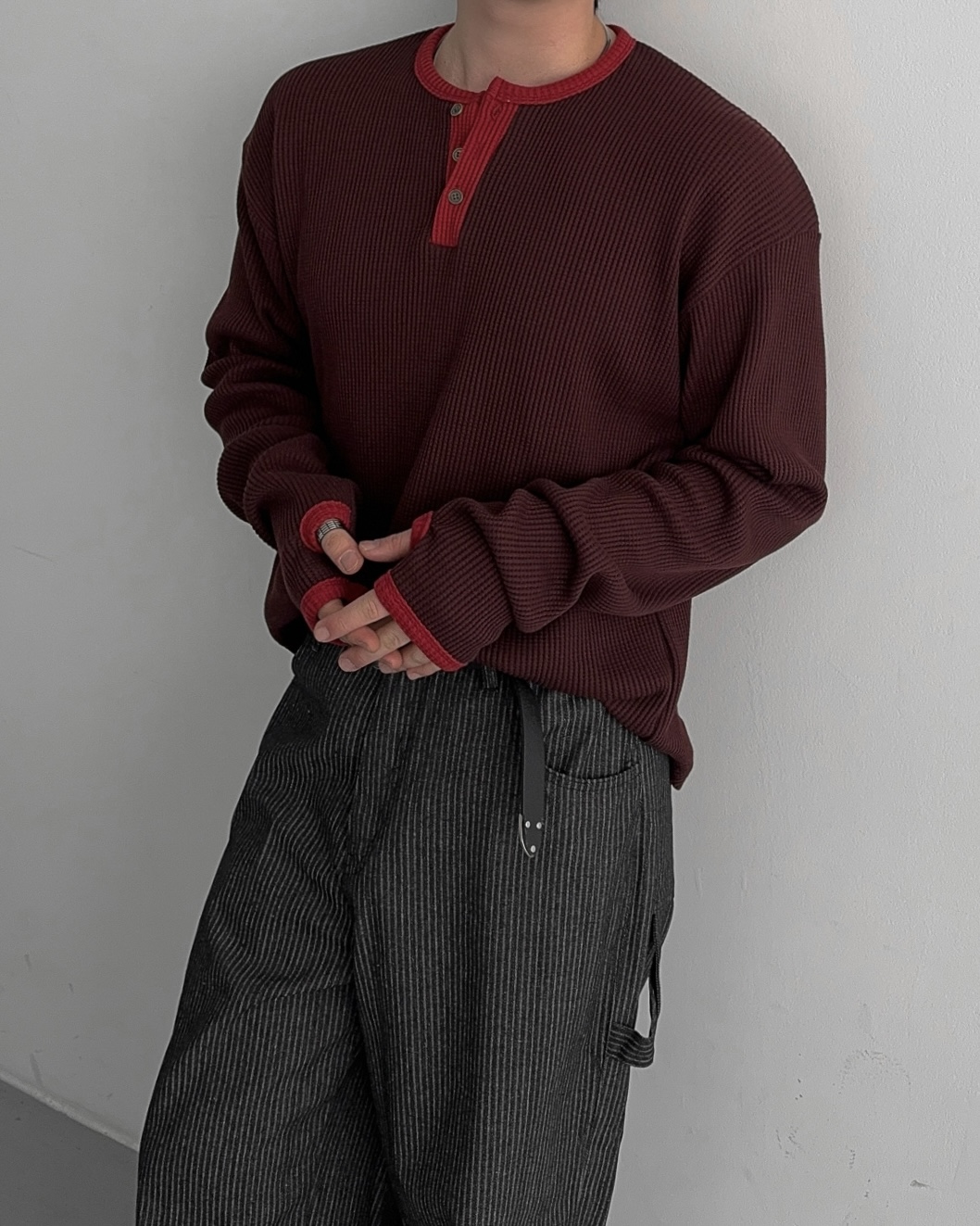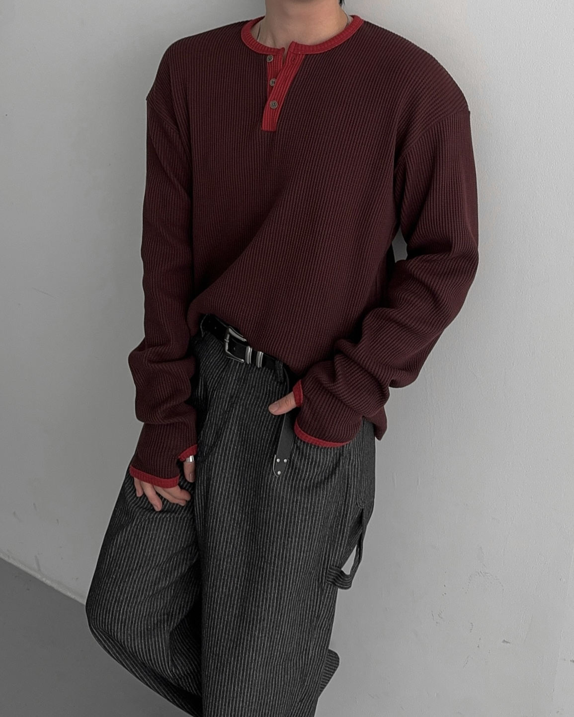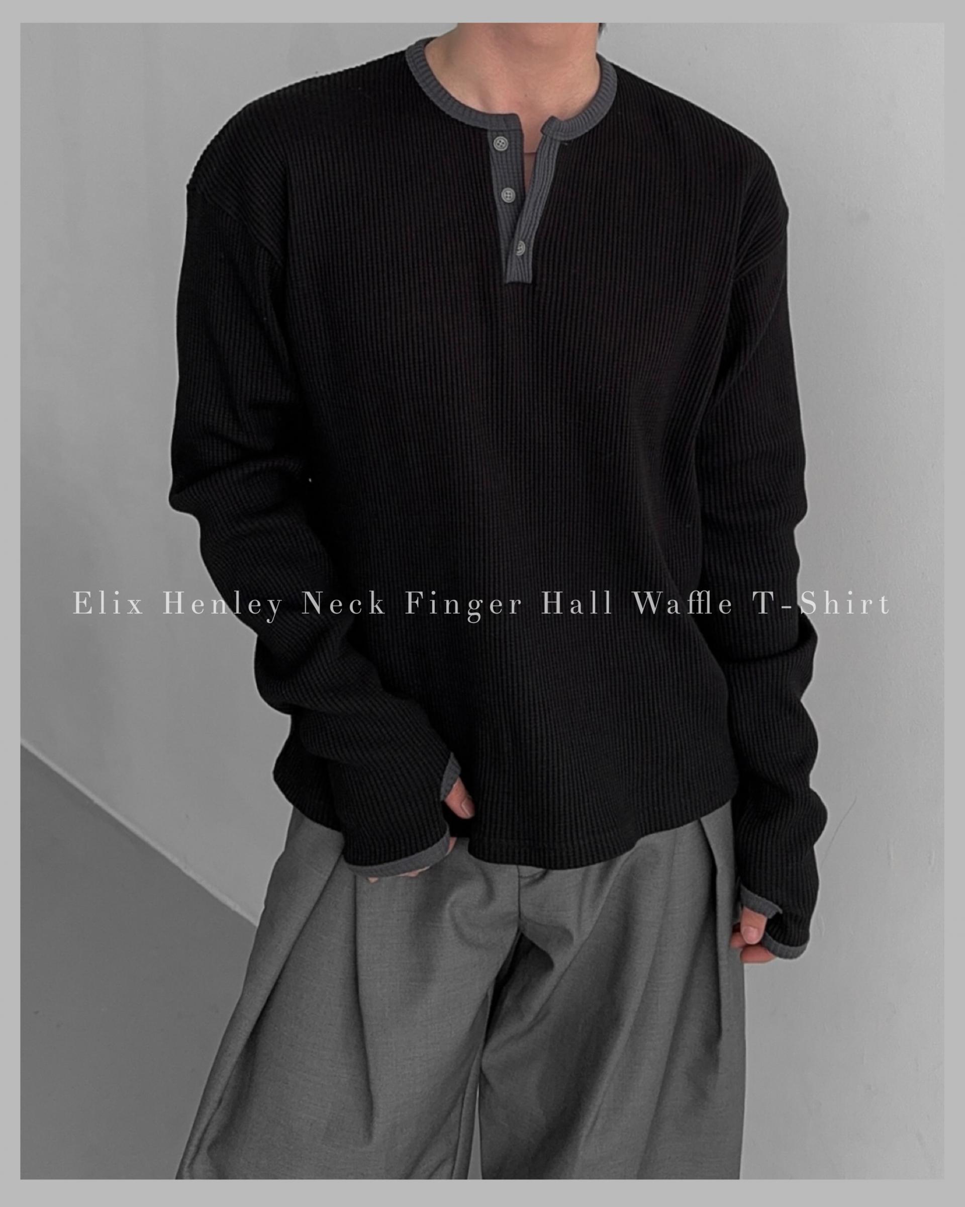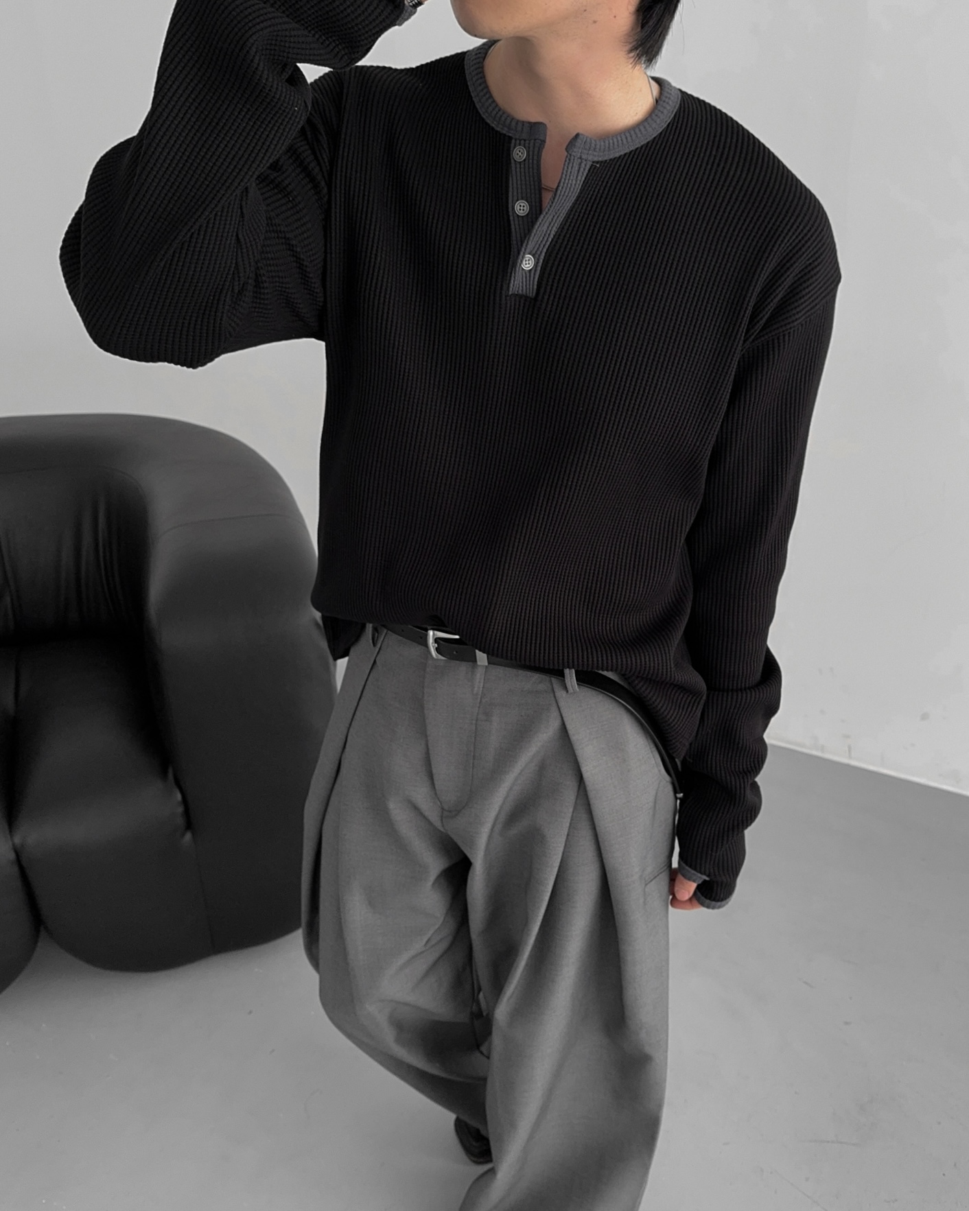 -촘촘한 와플 소재의 헨리넥 티셔츠