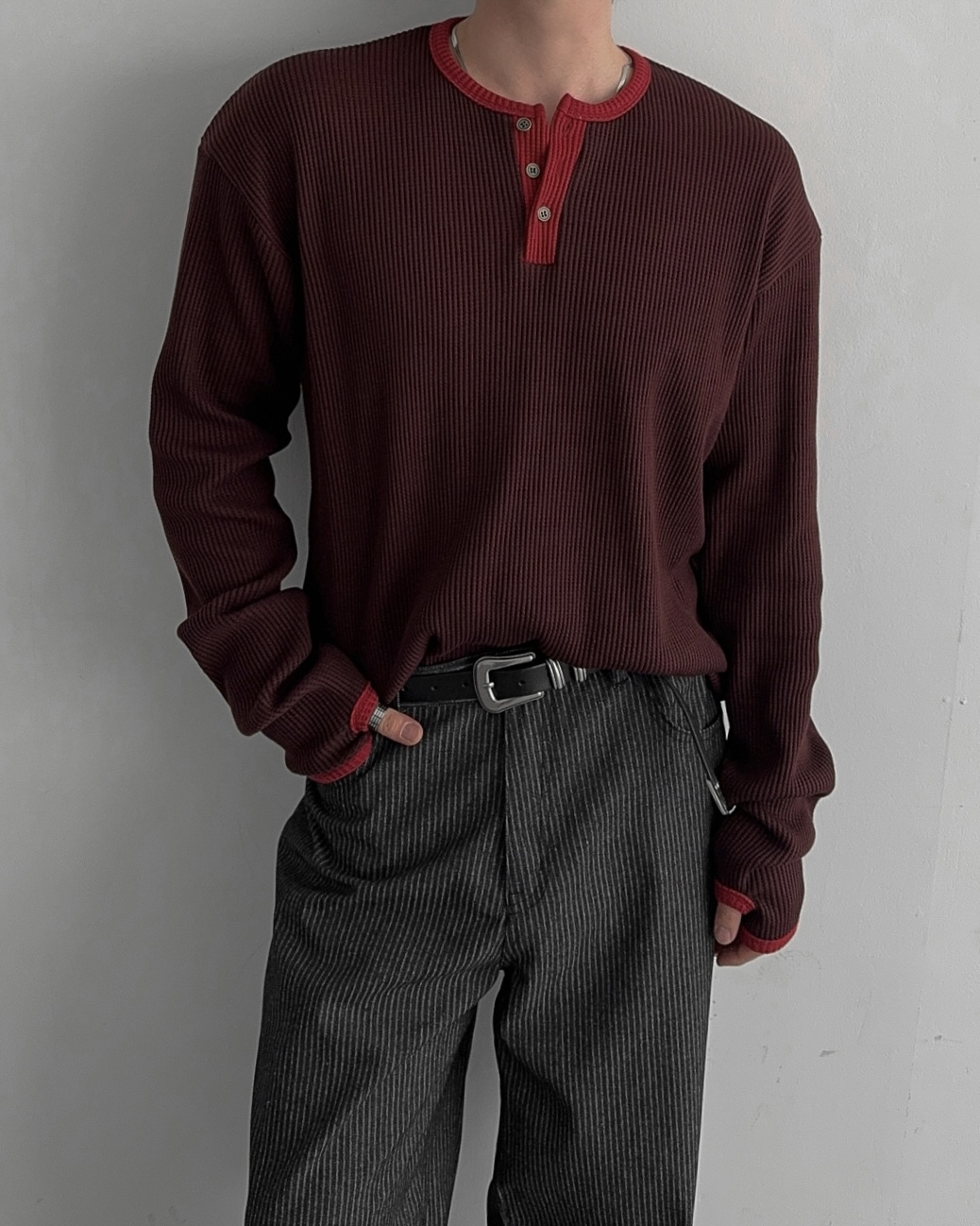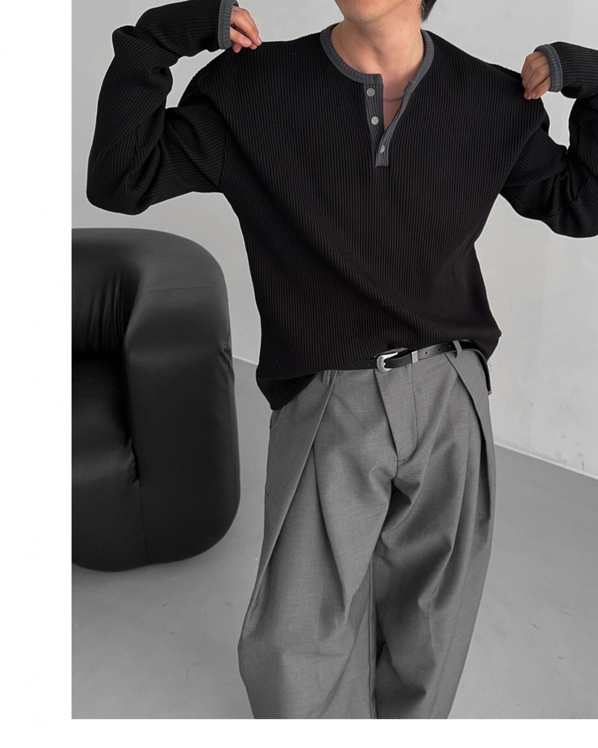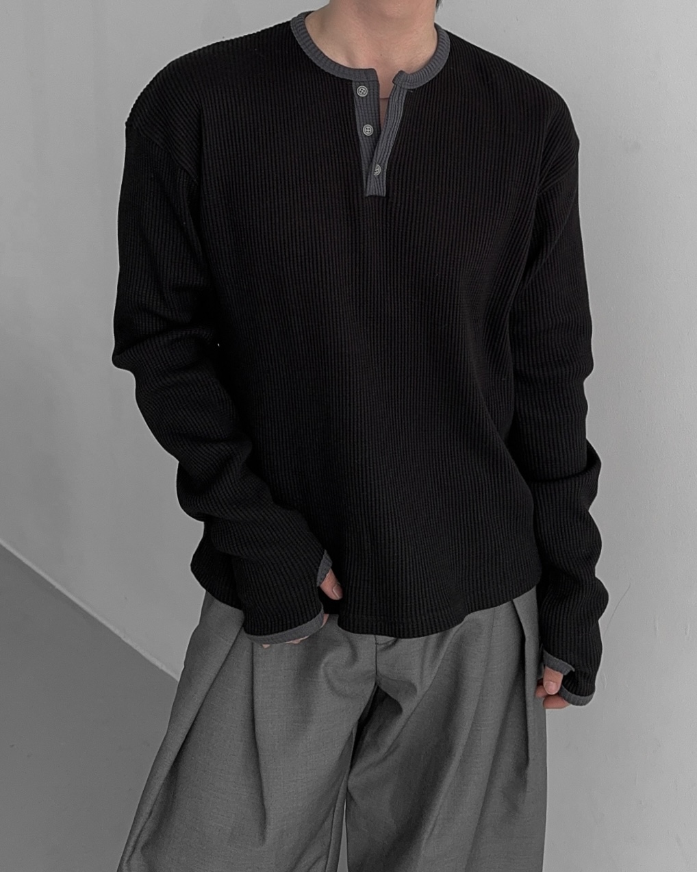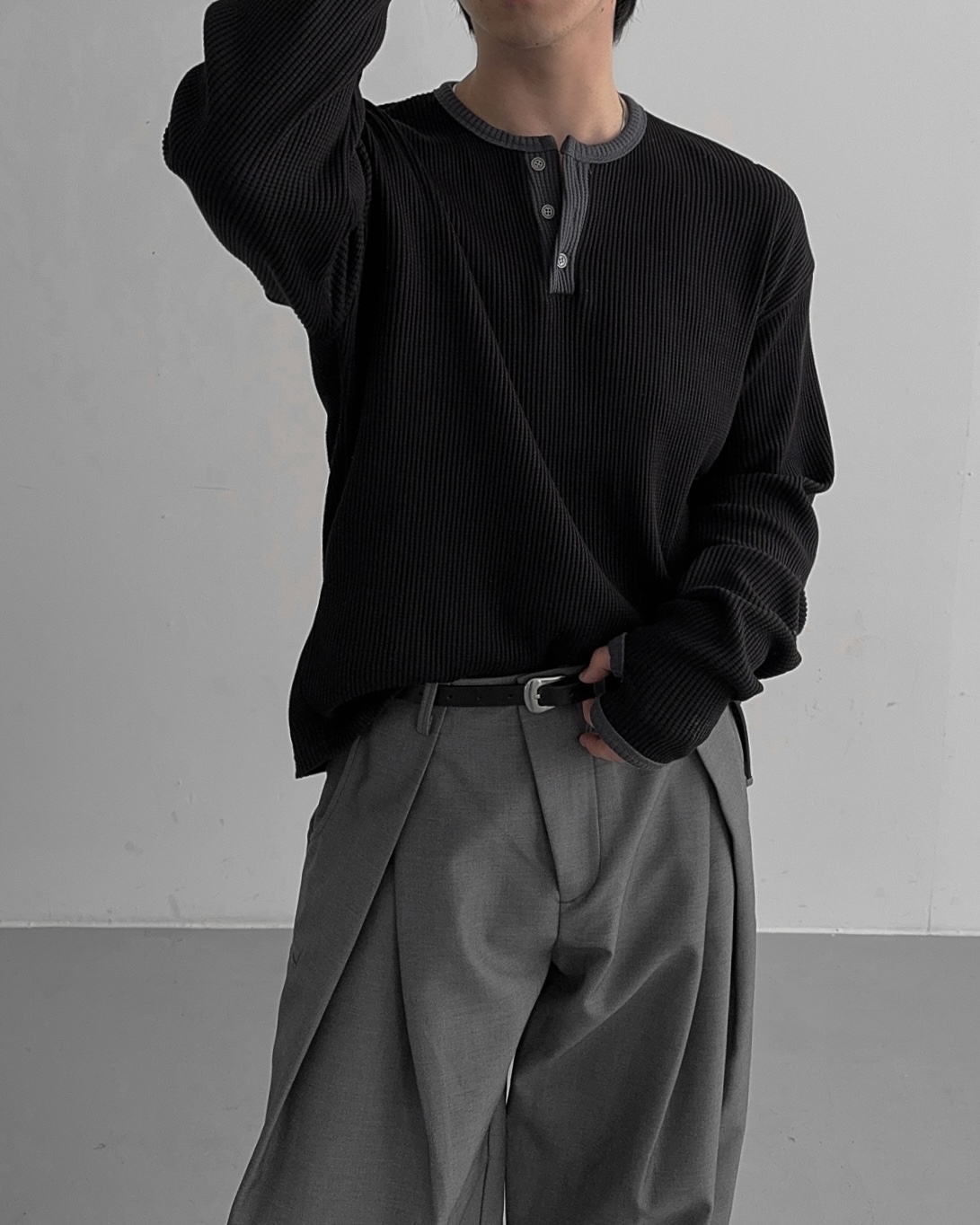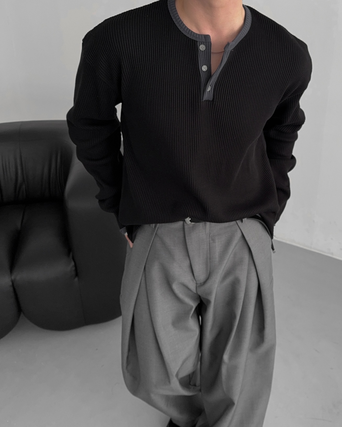 -촘촘한 와플 소재의 헨리넥 티셔츠