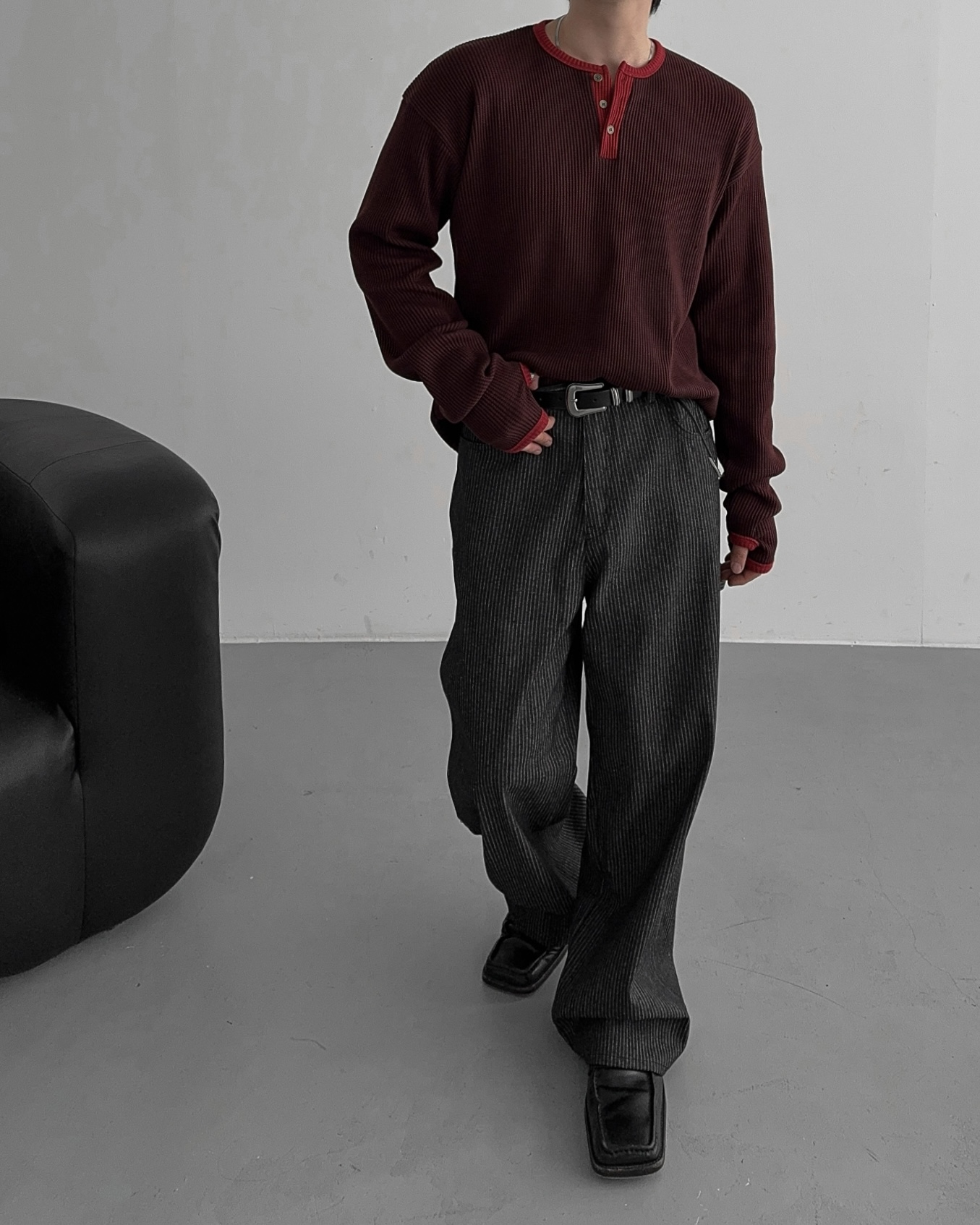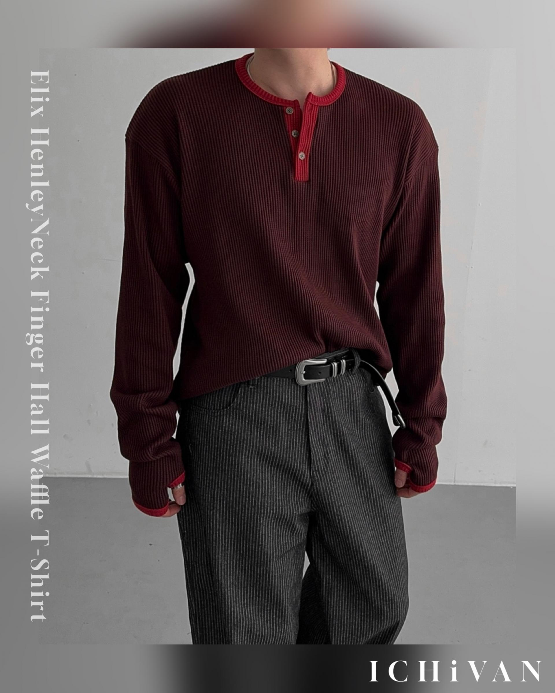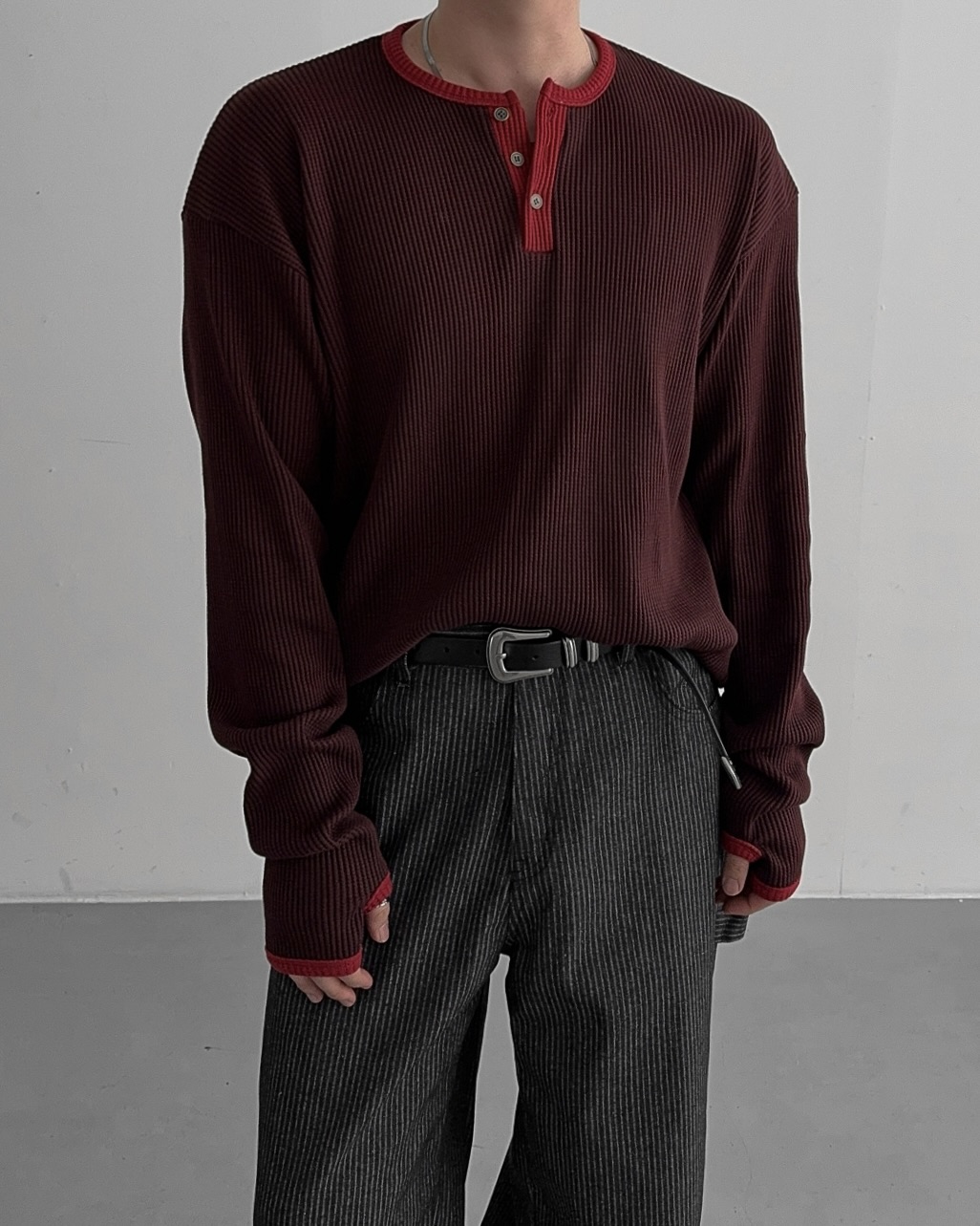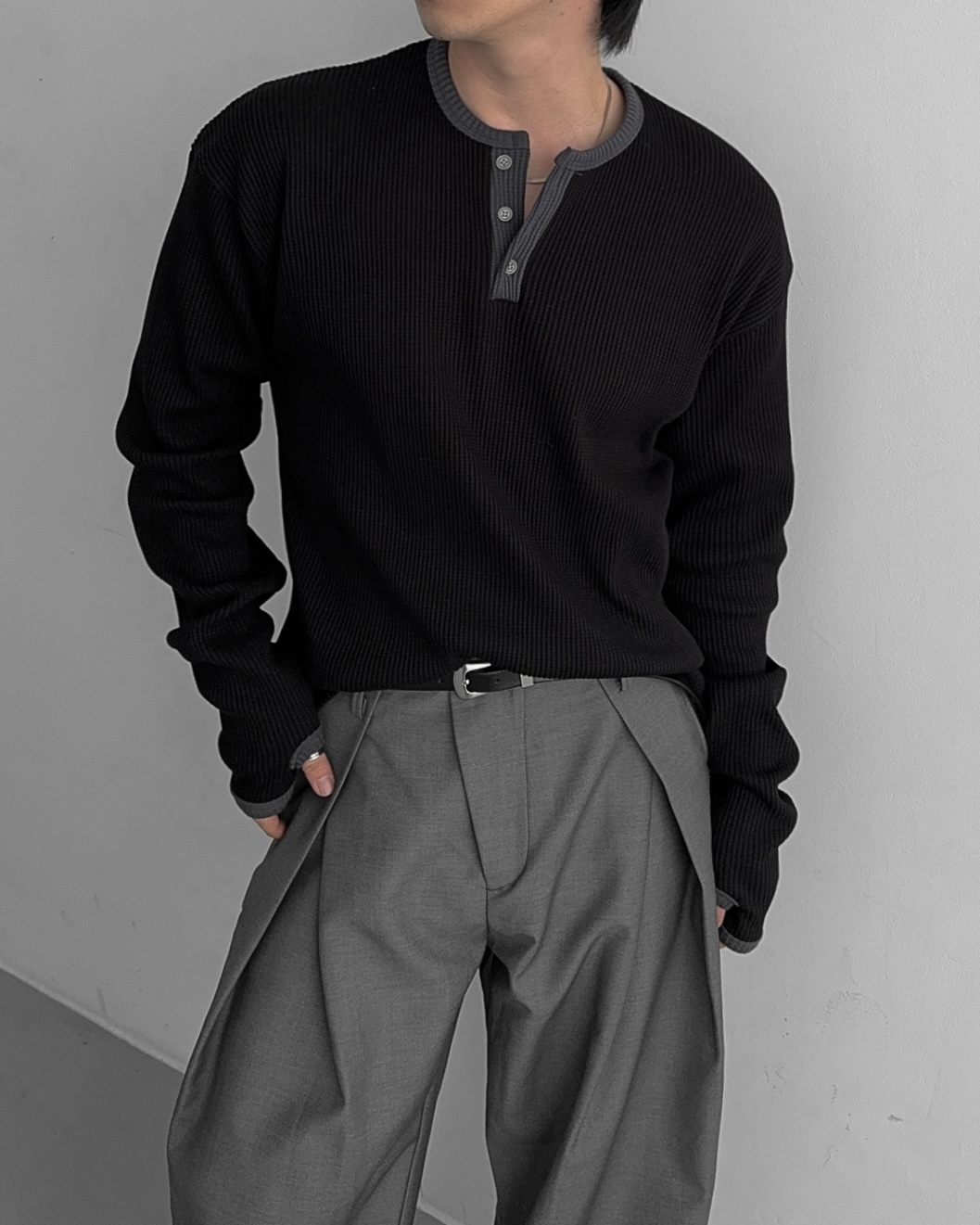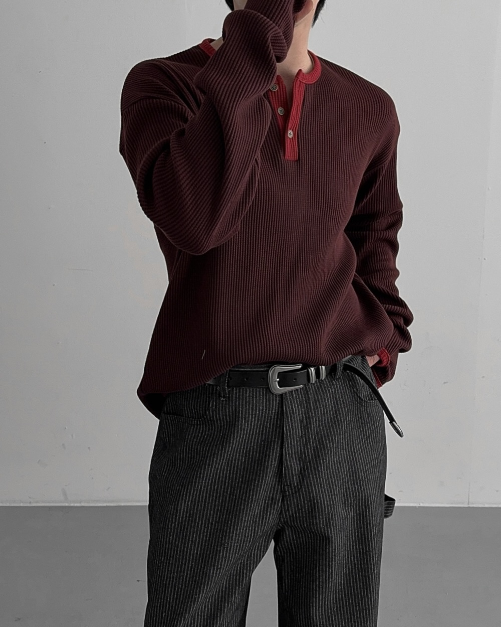 -촘촘한 와플 소재의 헨리넥 티셔츠