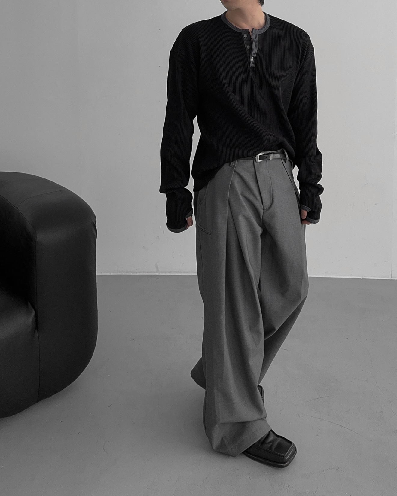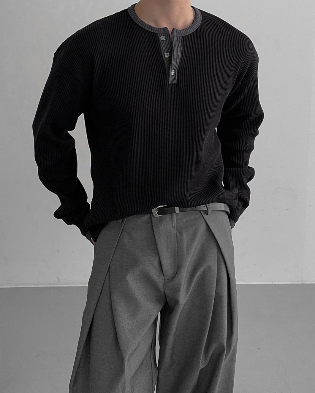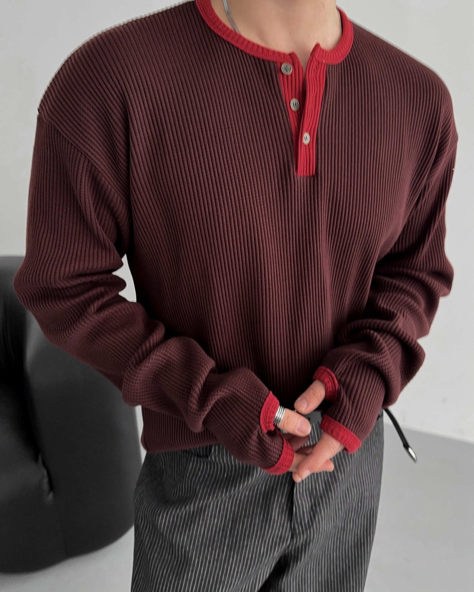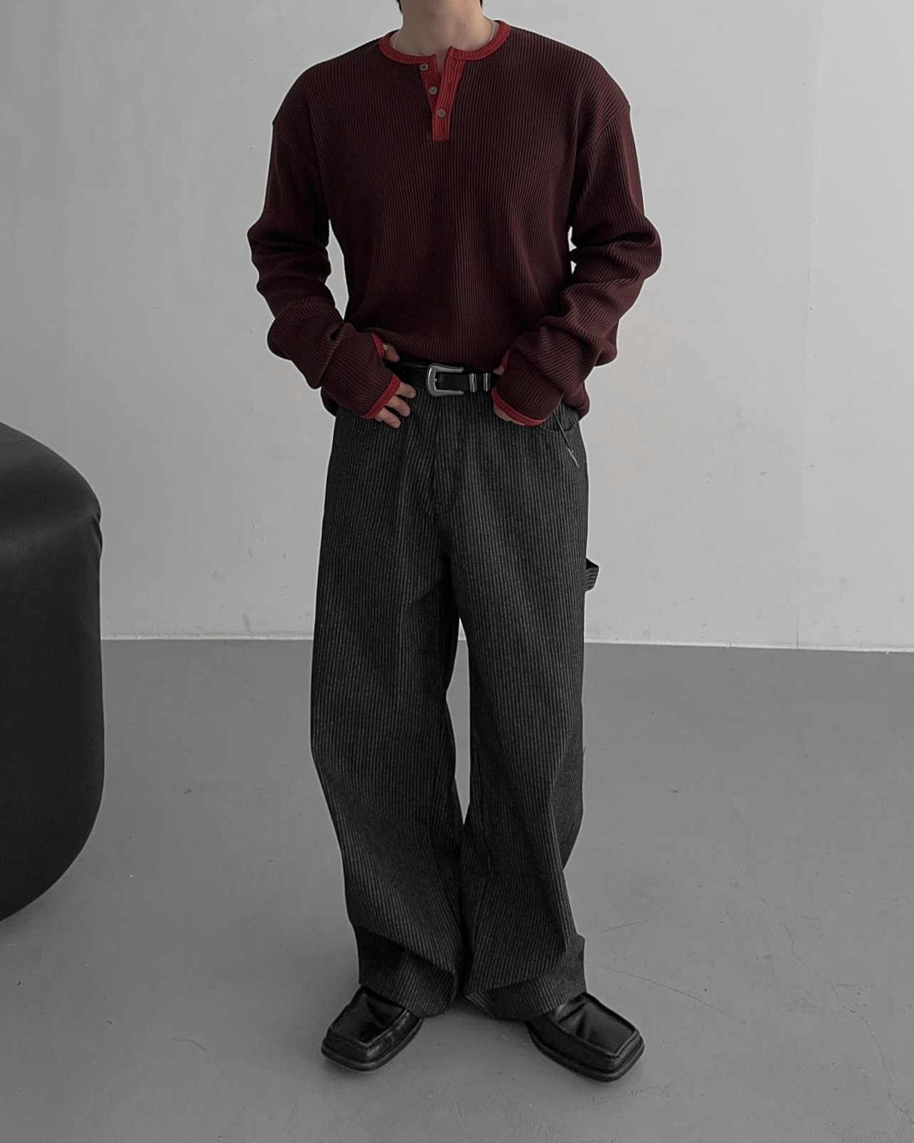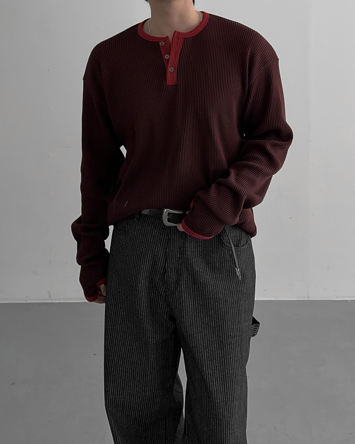 -촘촘한 와플 소재의 헨리넥 티셔츠