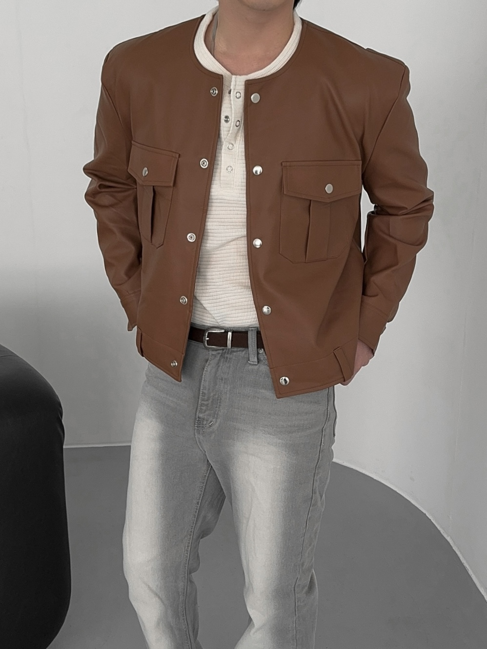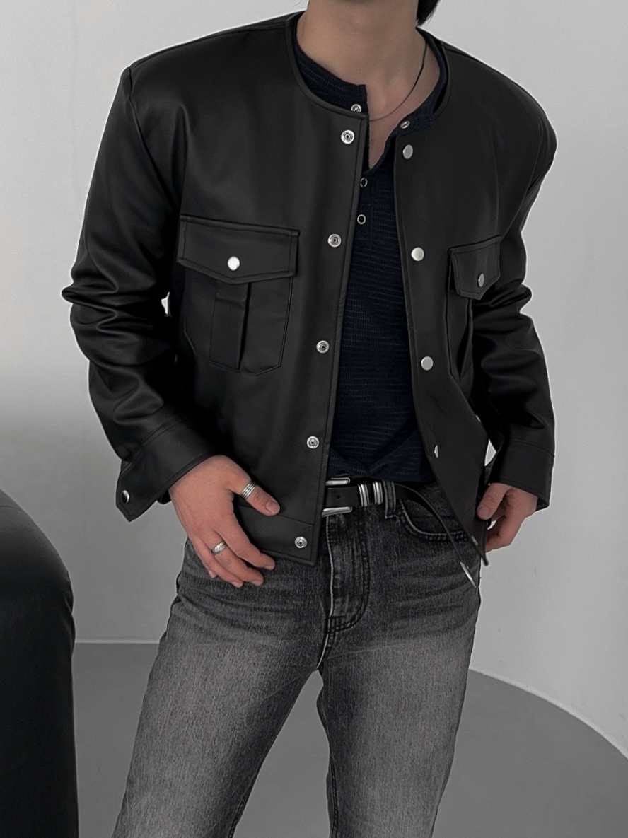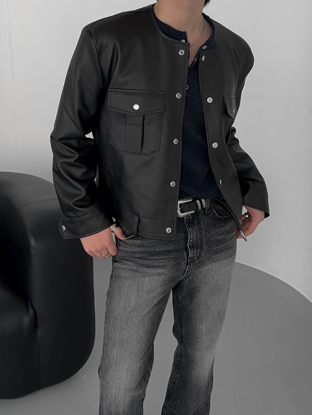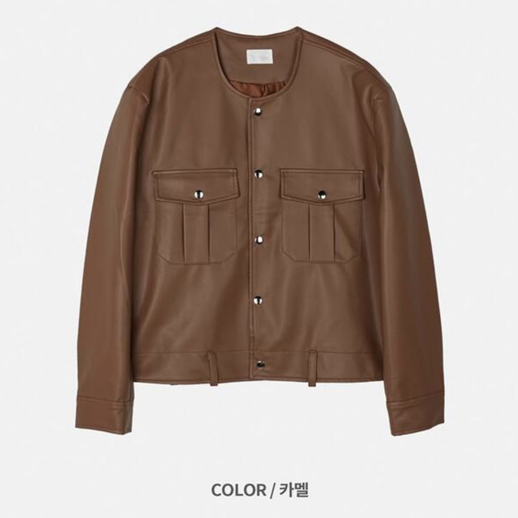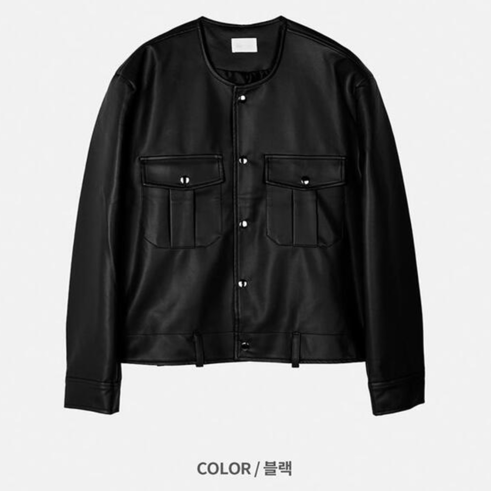 -깔끔한 카라리스 라운드넥 디자인의 레더 자켓