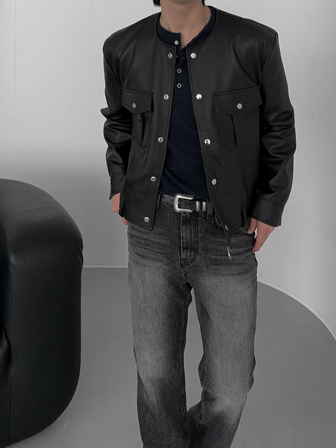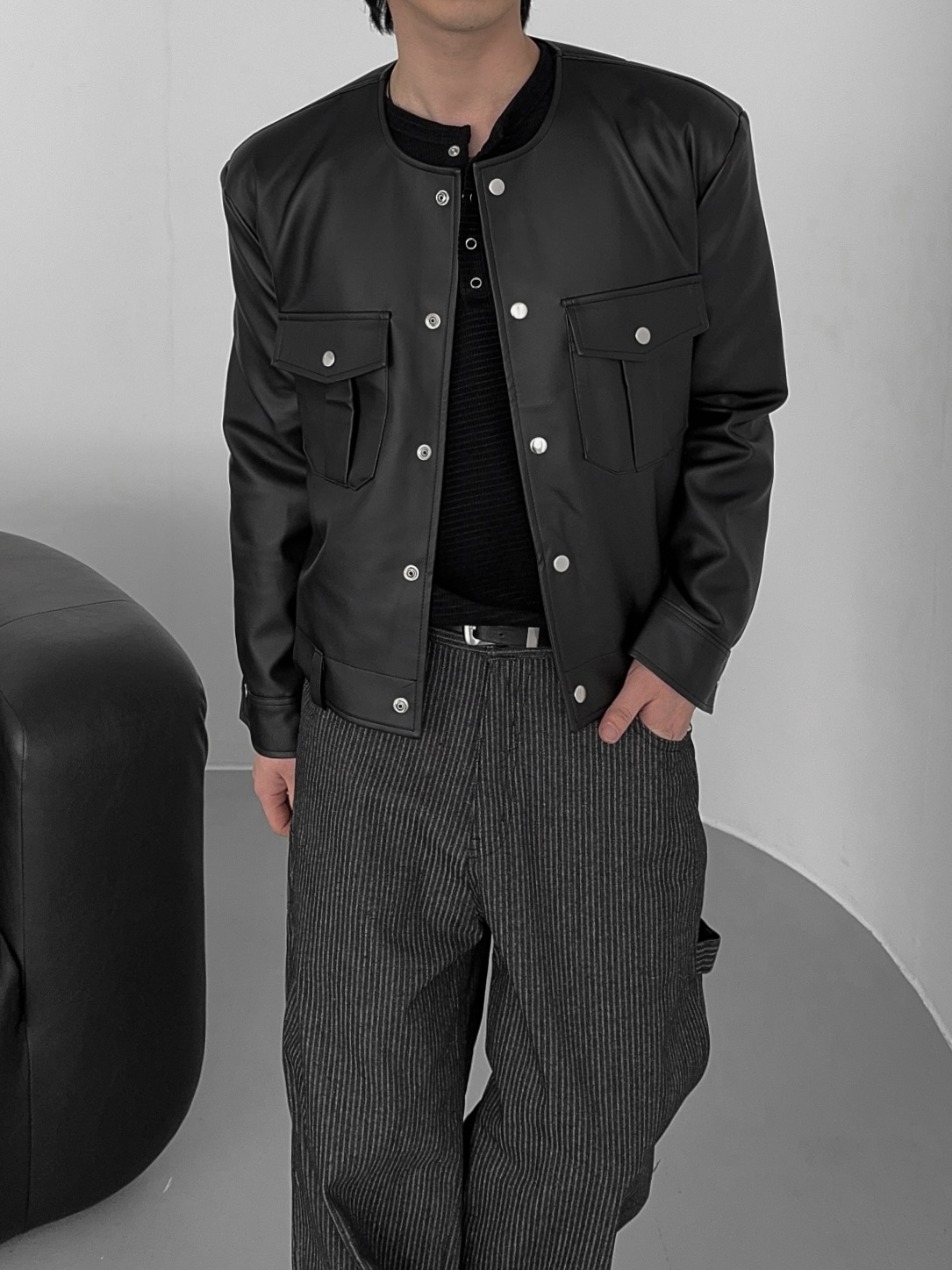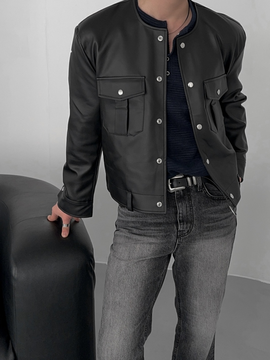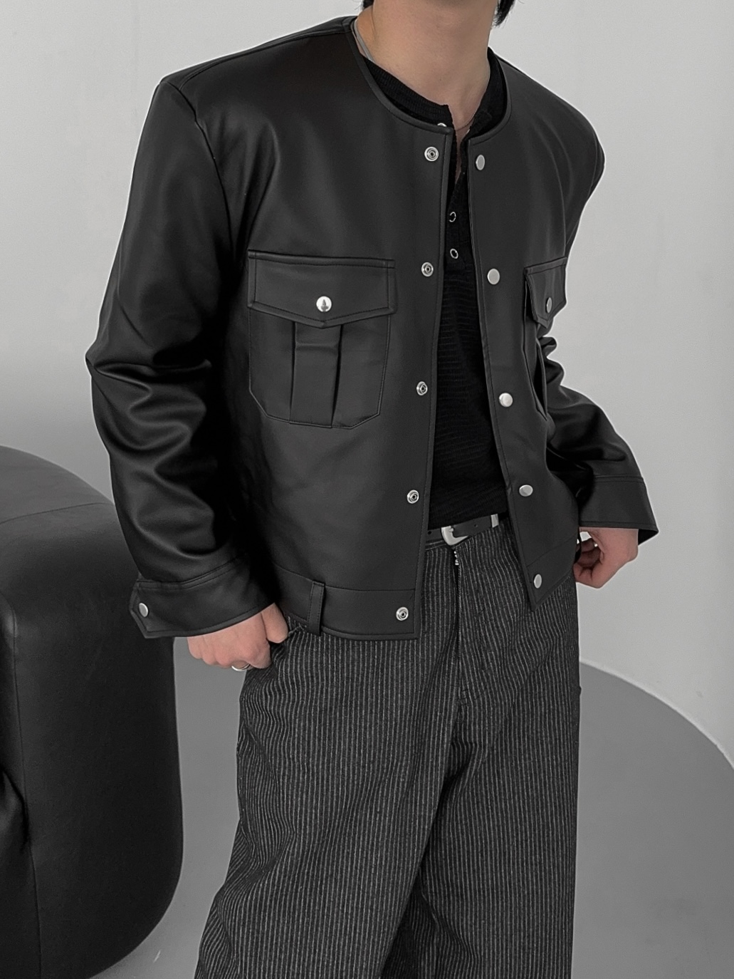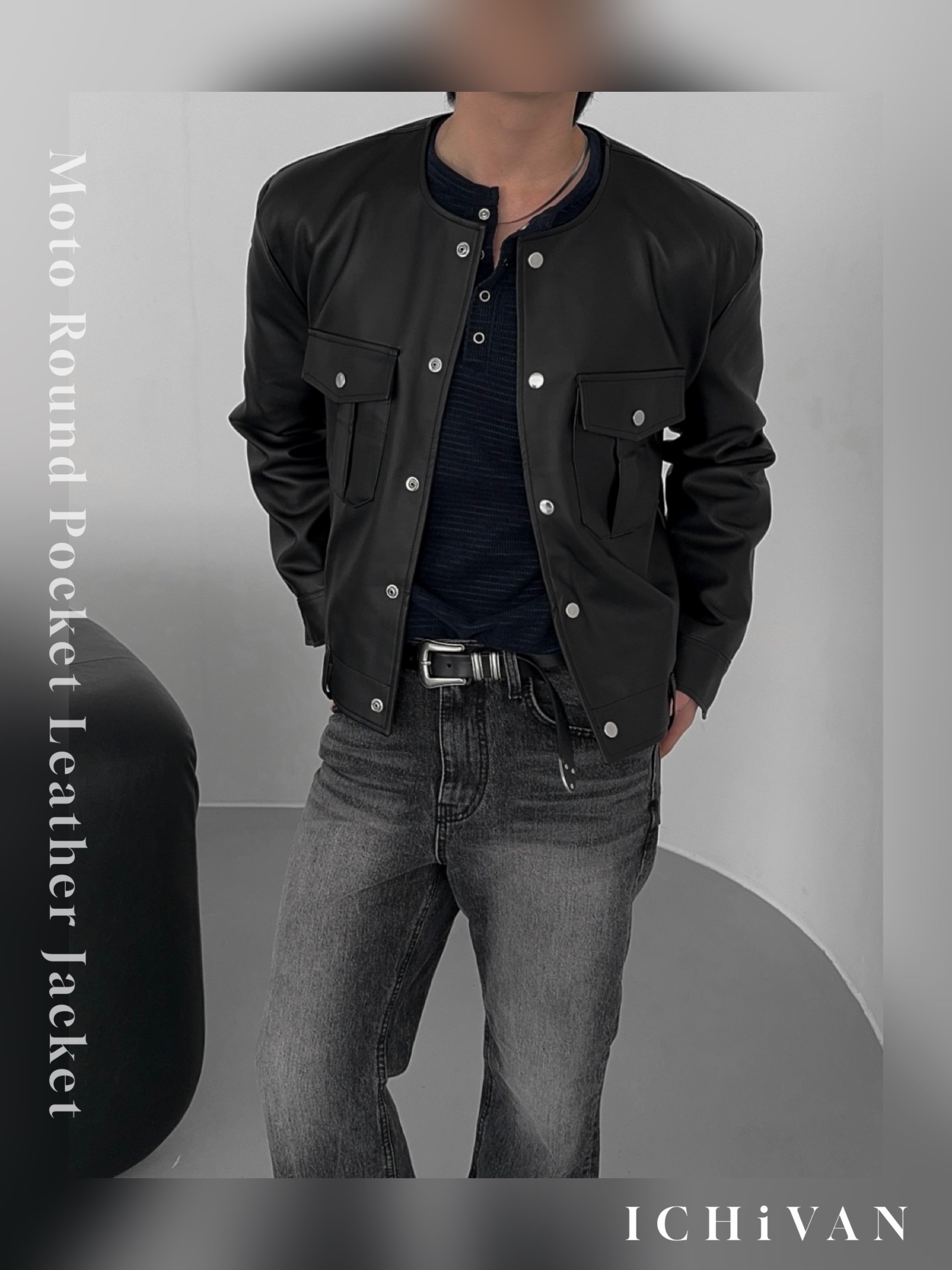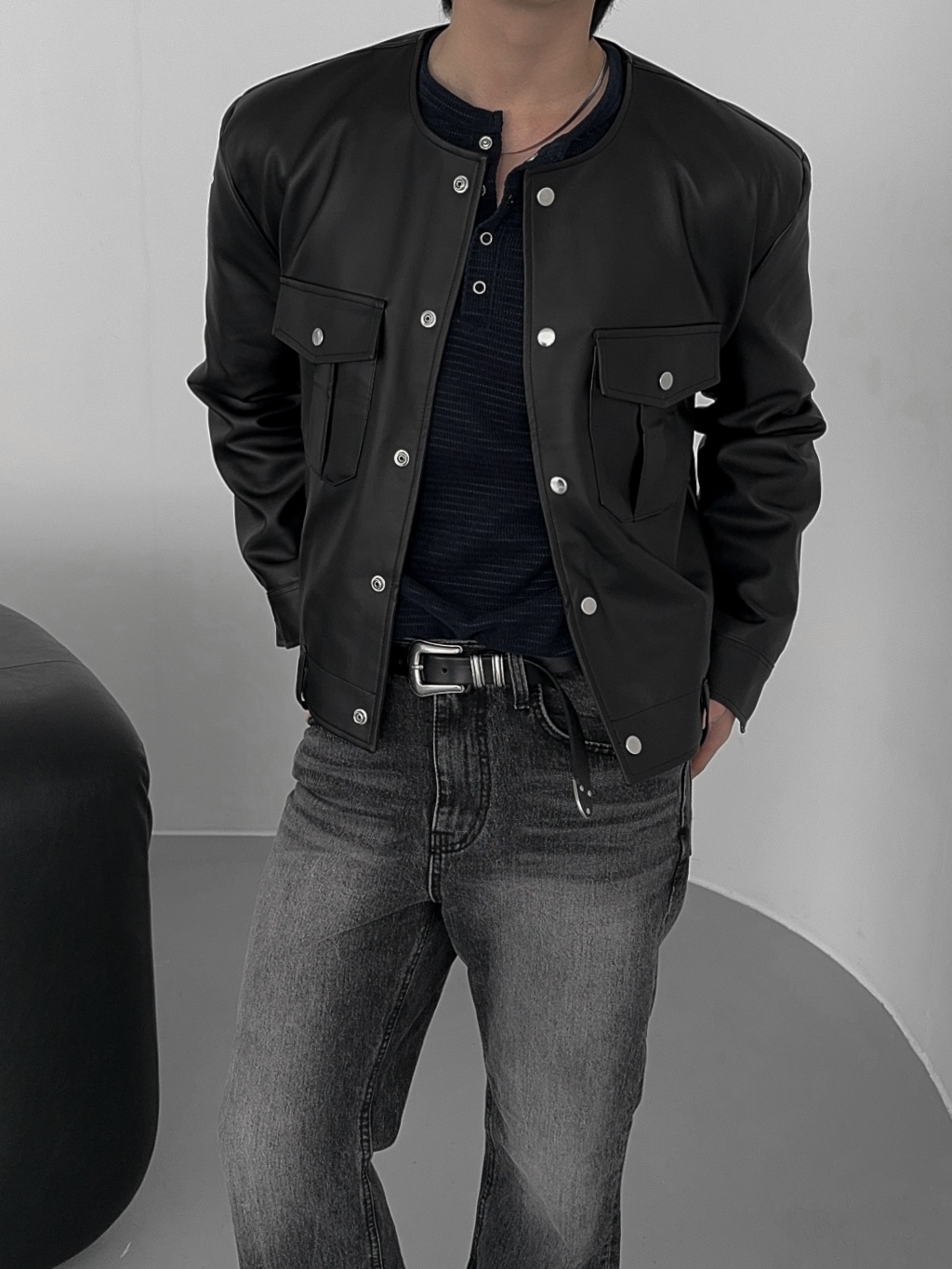 -깔끔한 카라리스 라운드넥 디자인의 레더 자켓