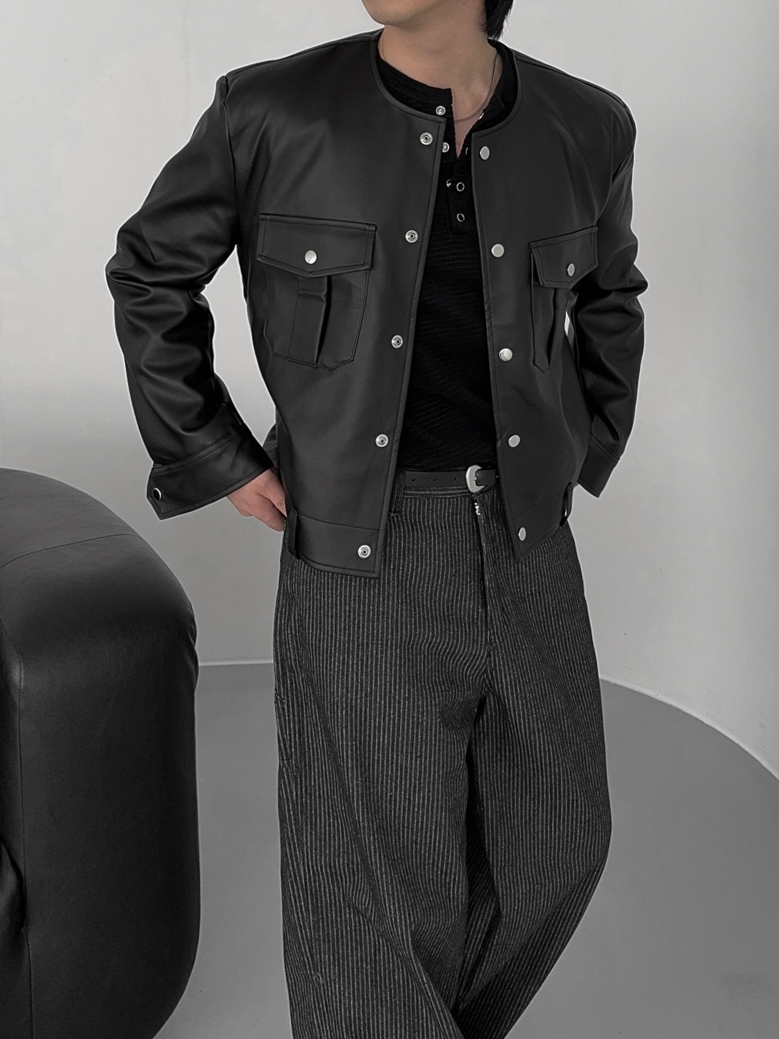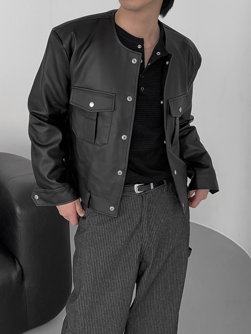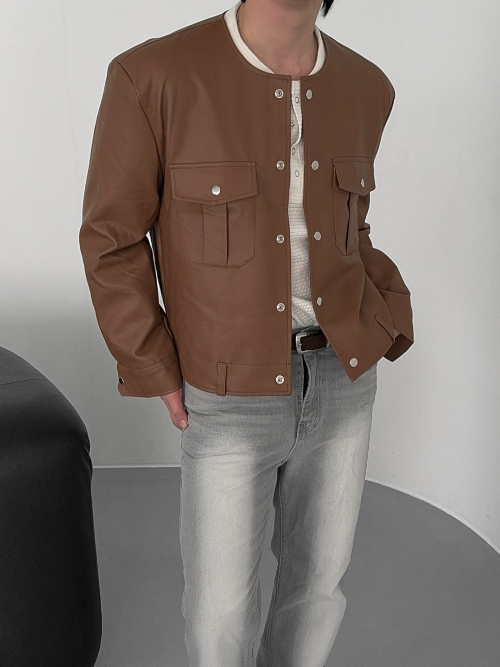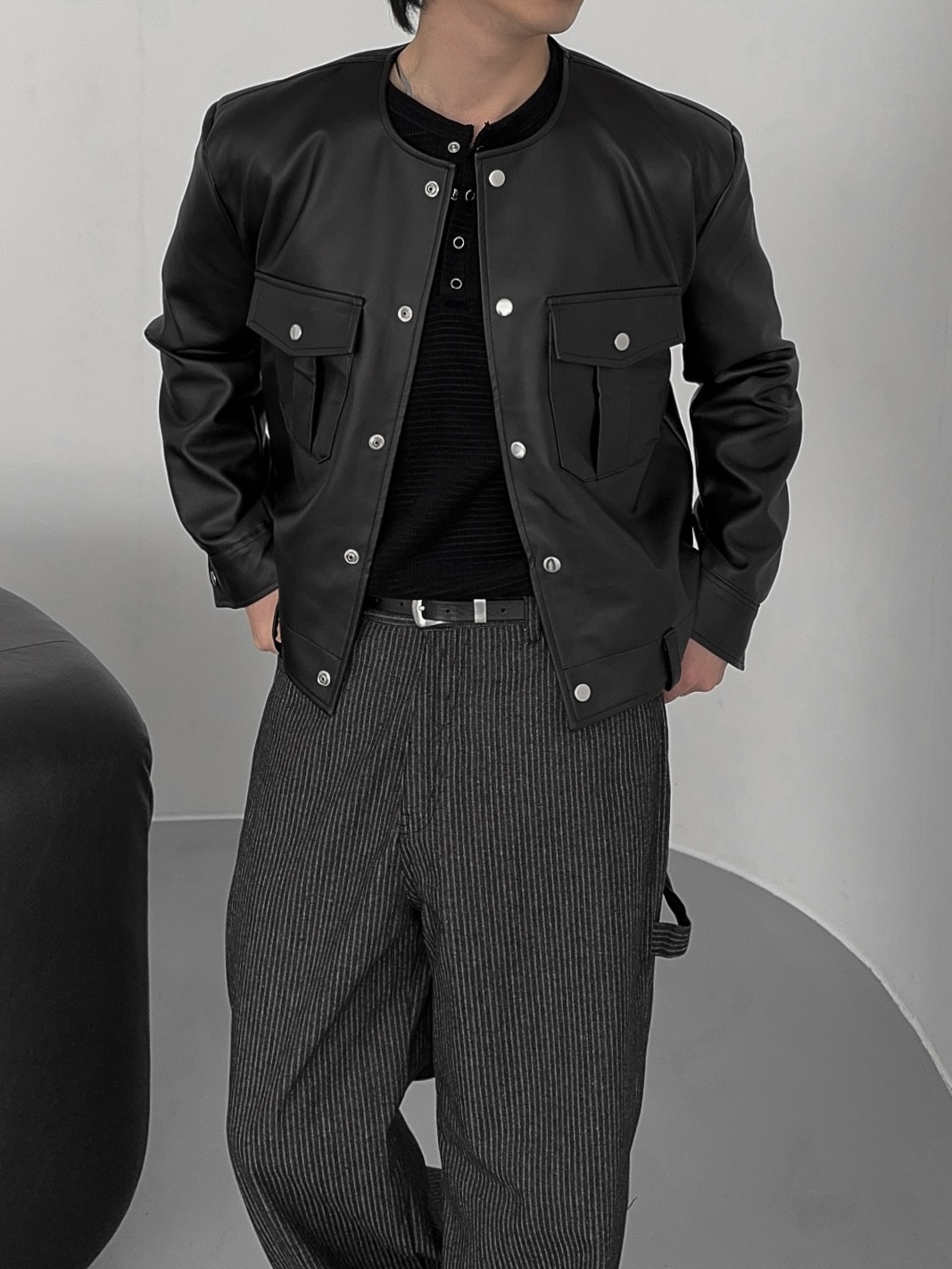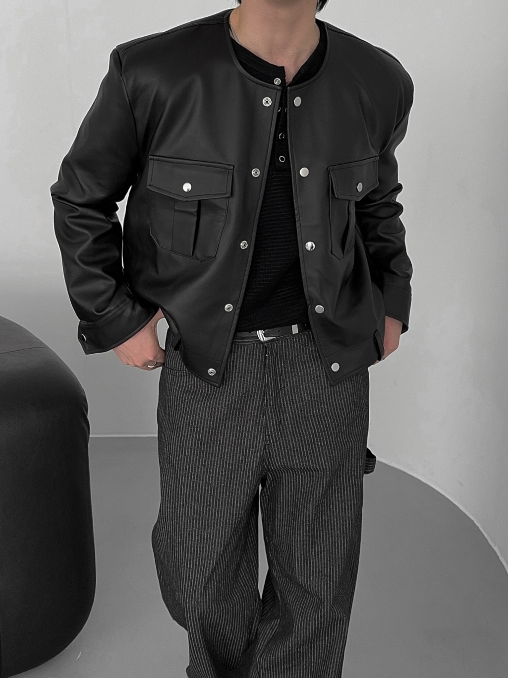 -깔끔한 카라리스 라운드넥 디자인의 레더 자켓