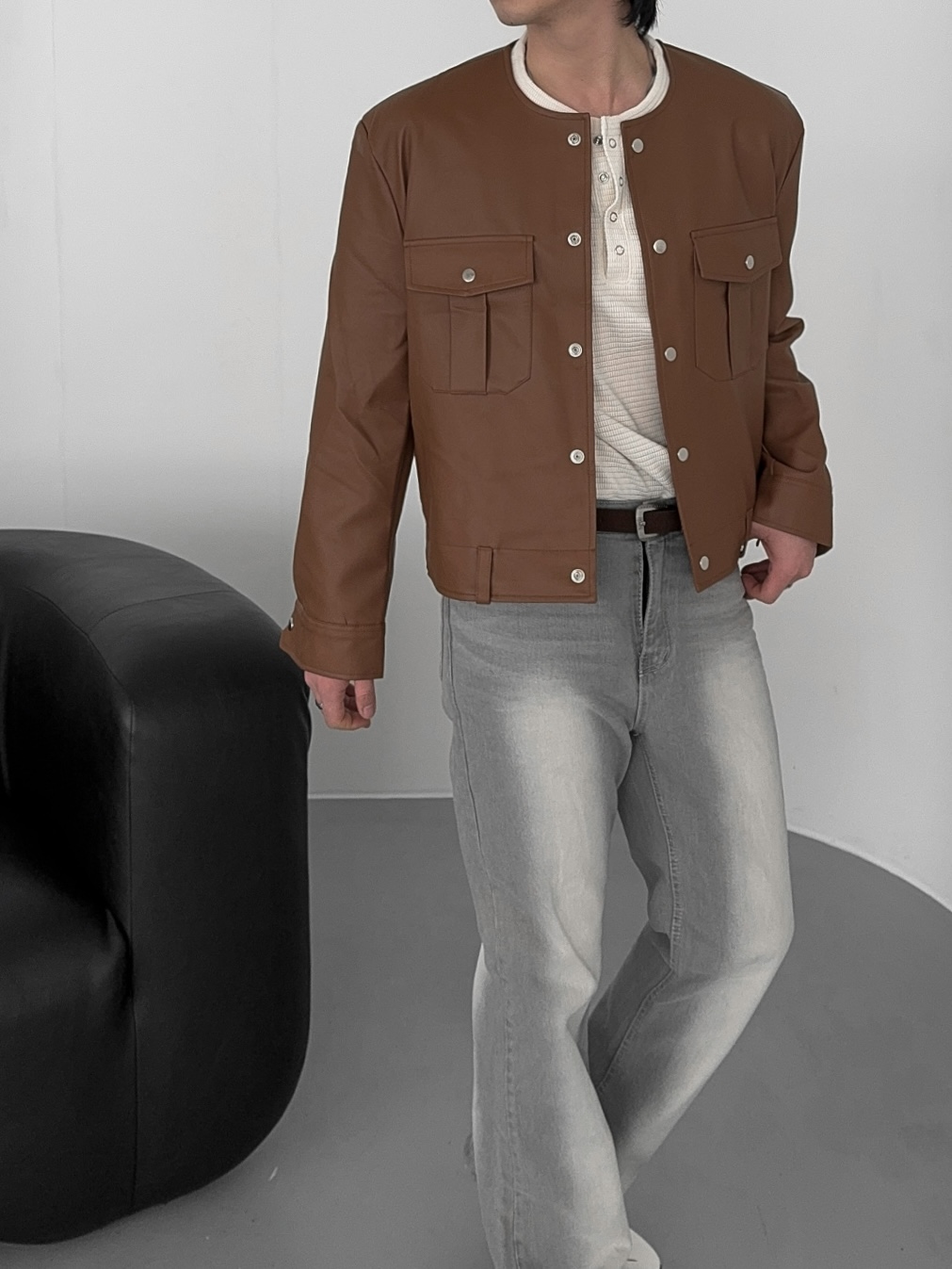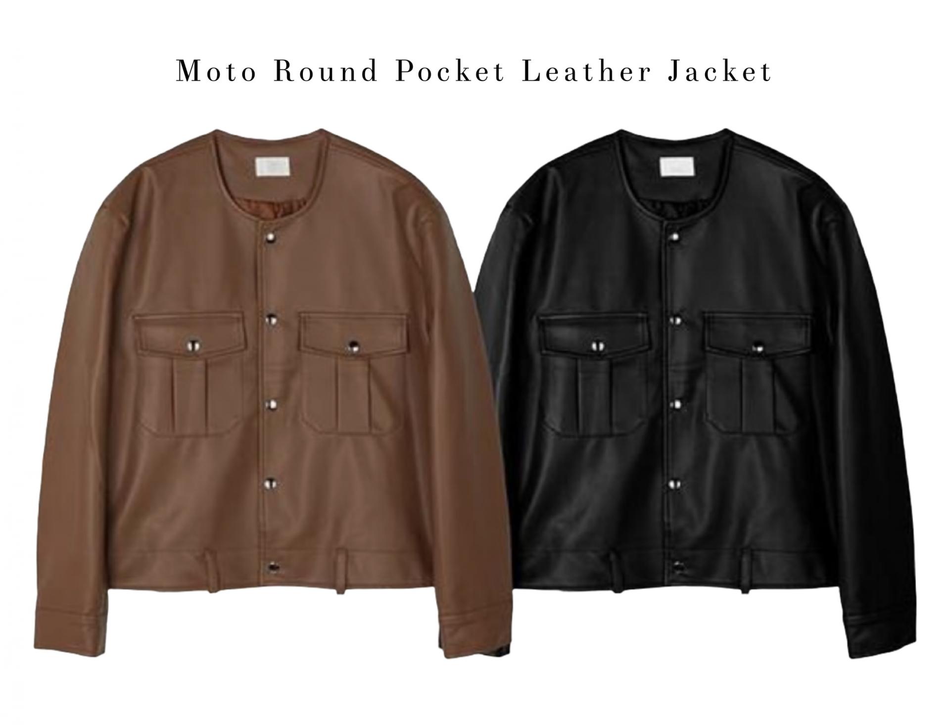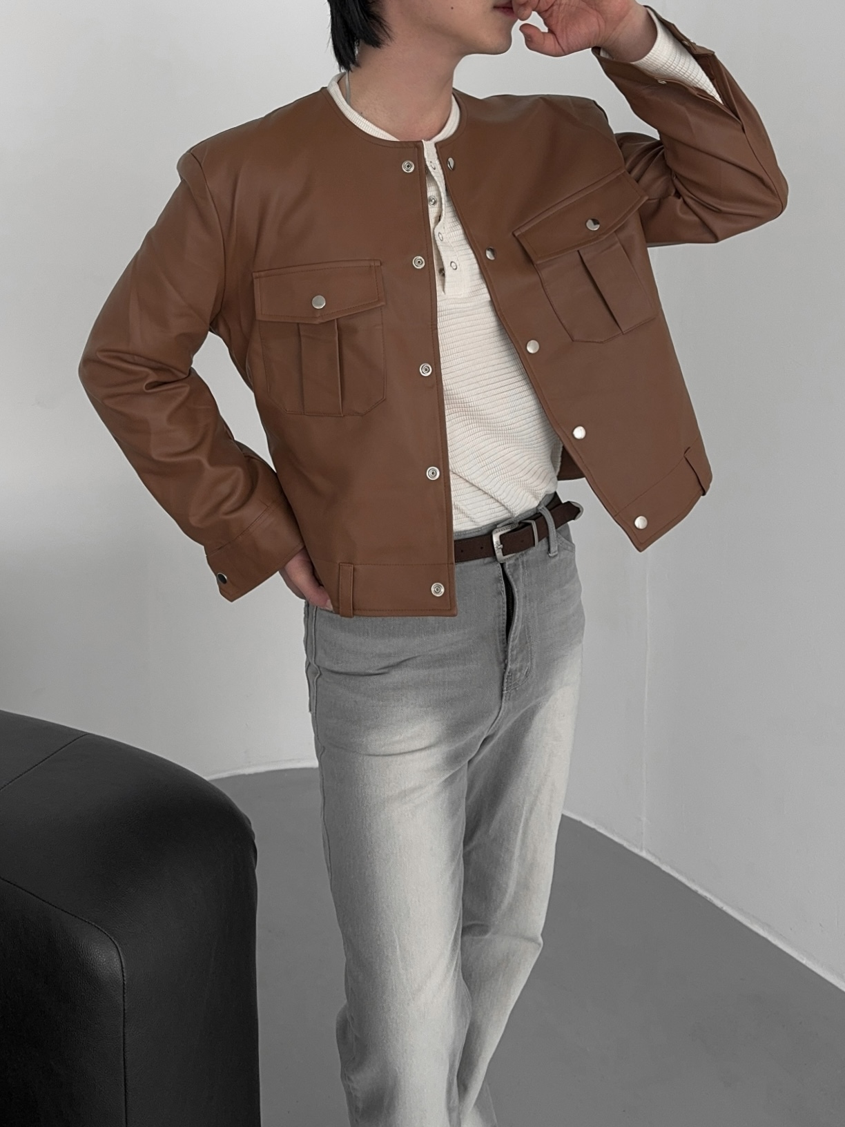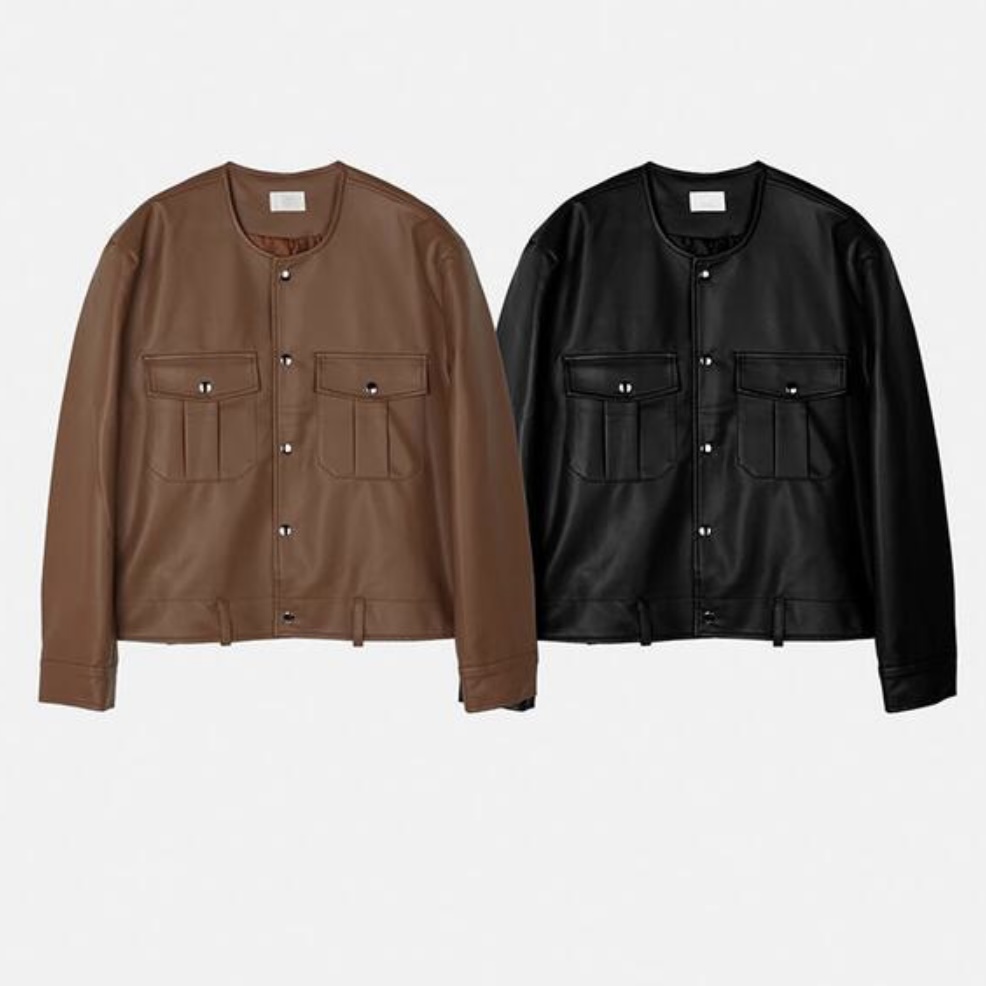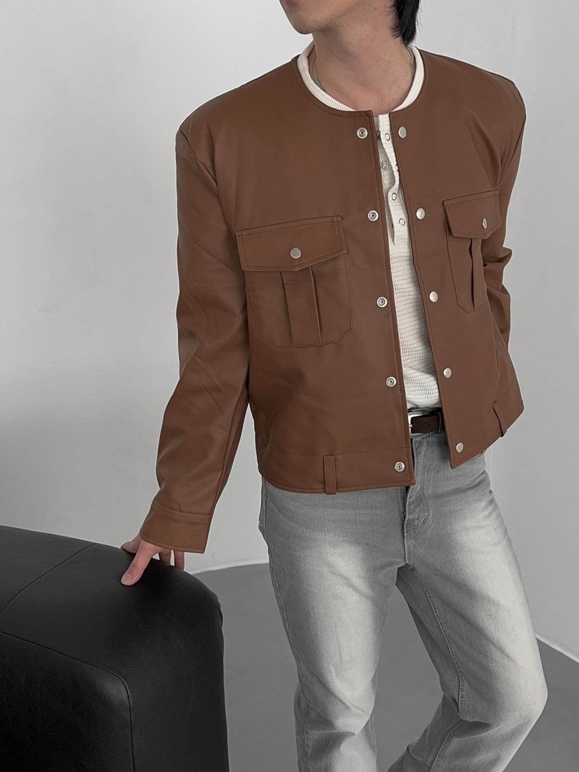 -깔끔한 카라리스 라운드넥 디자인의 레더 자켓