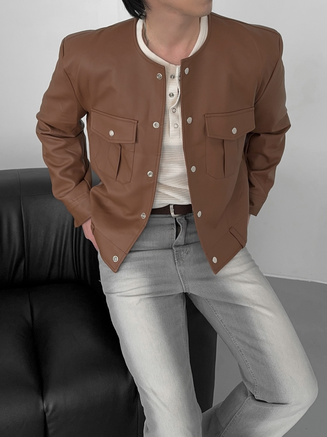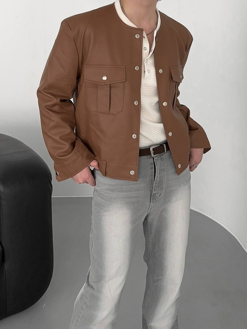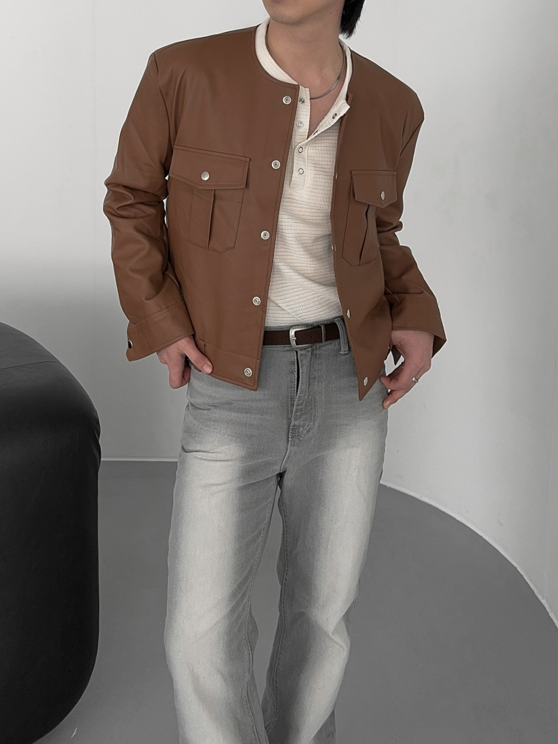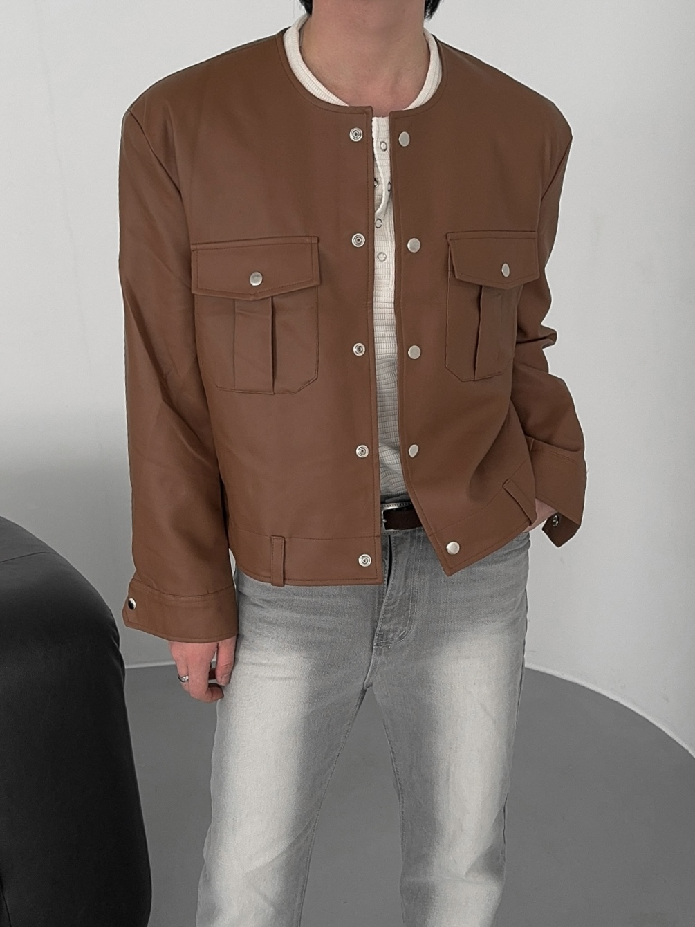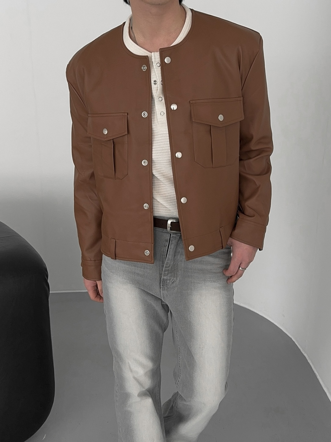 -깔끔한 카라리스 라운드넥 디자인의 레더 자켓