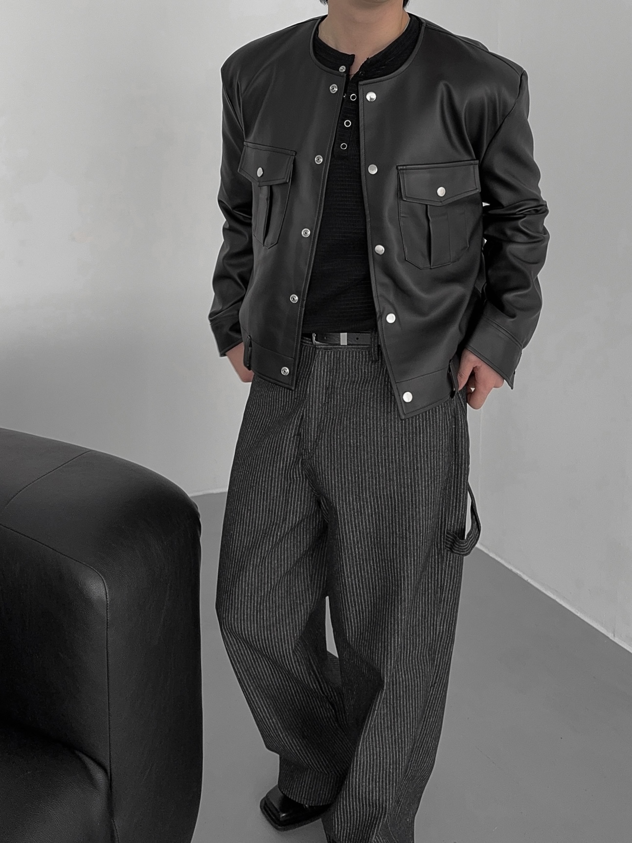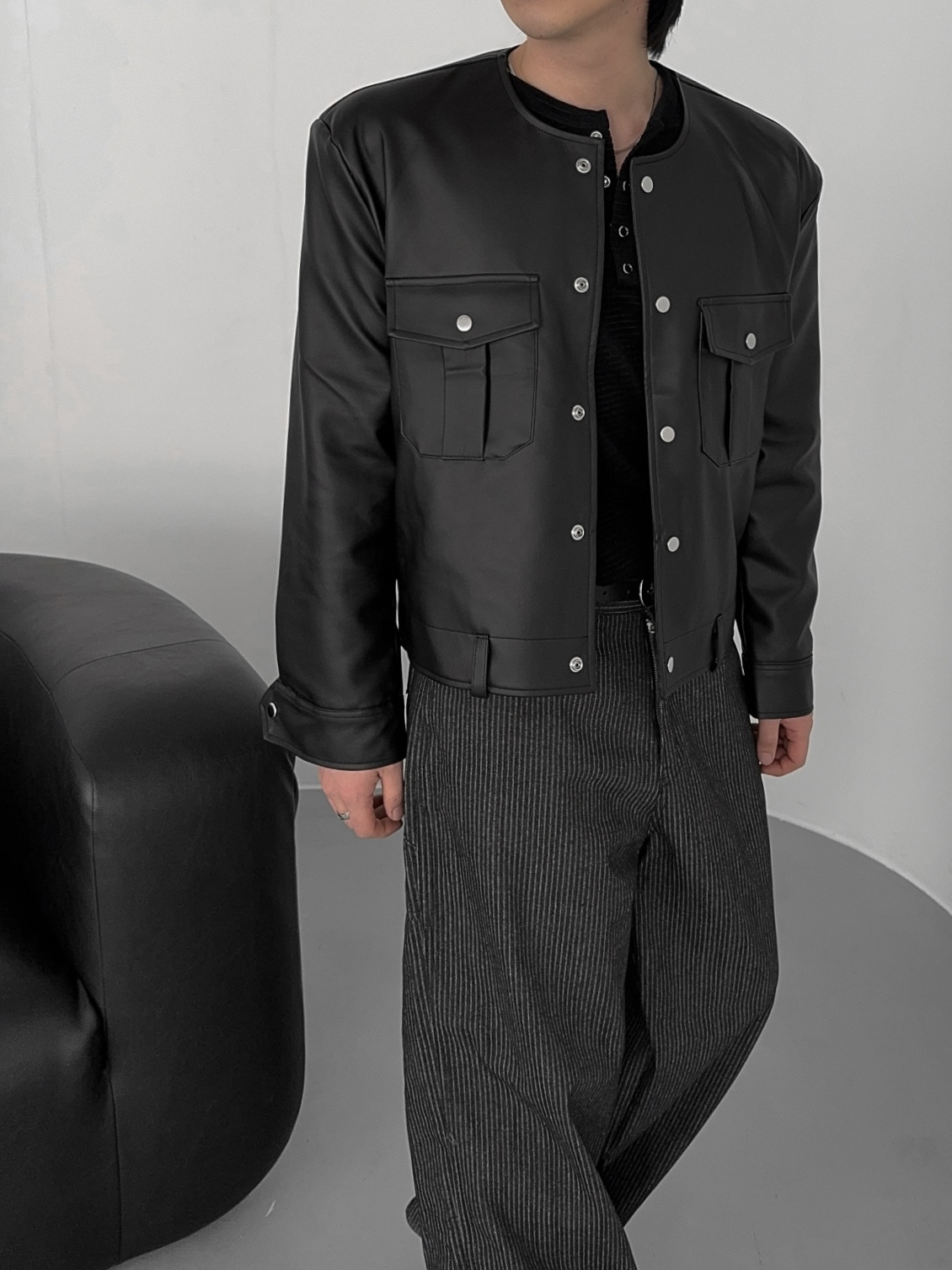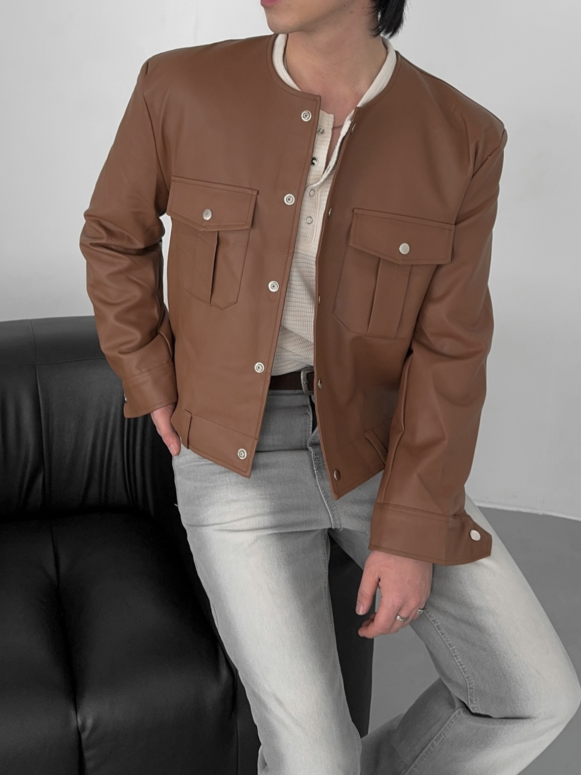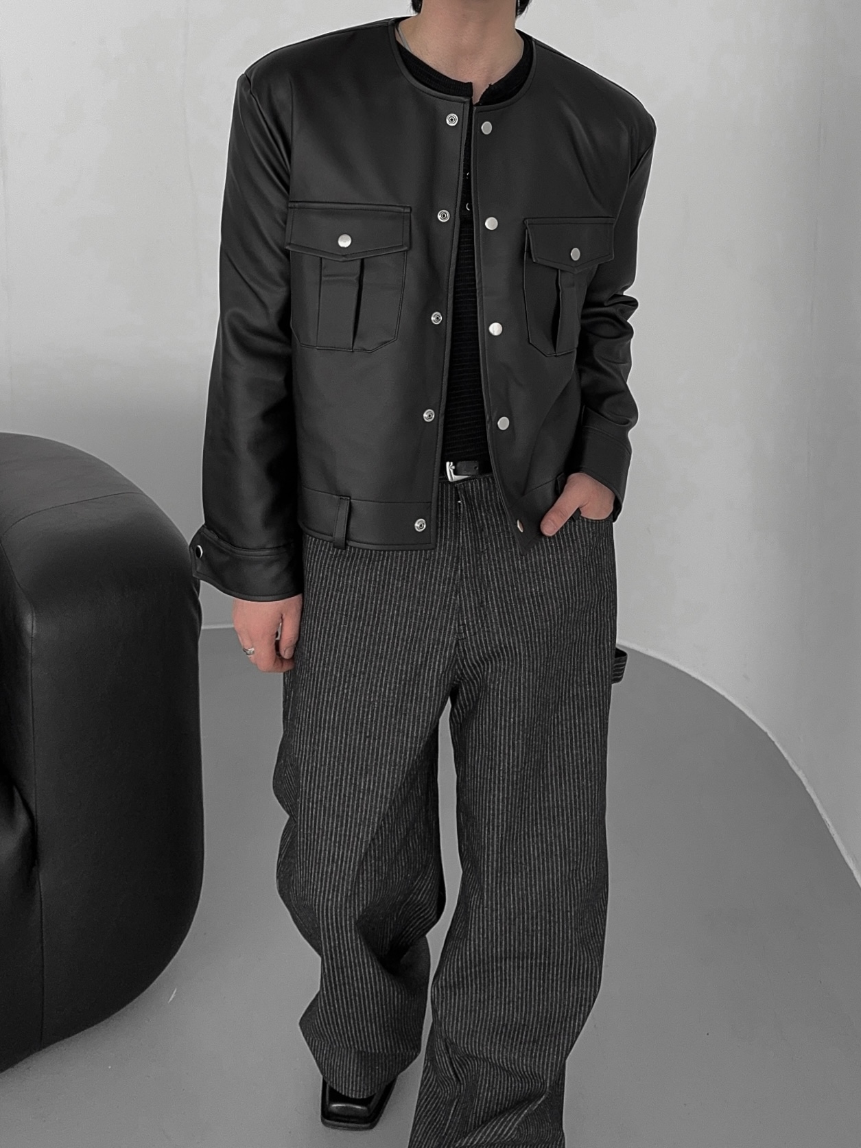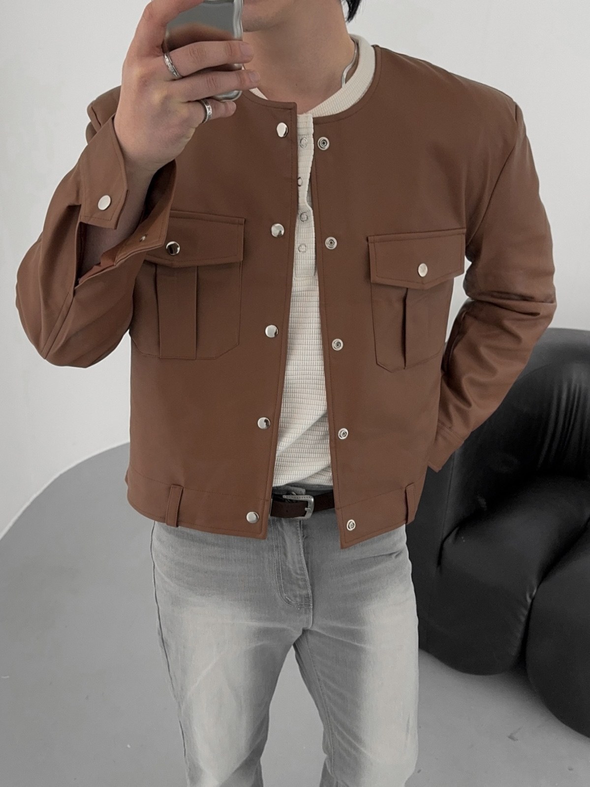 -깔끔한 카라리스 라운드넥 디자인의 레더 자켓