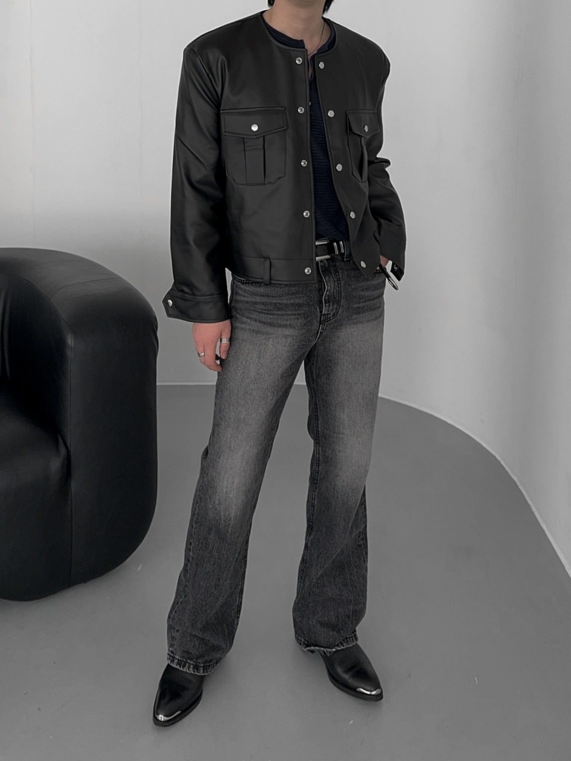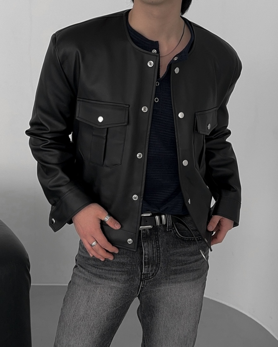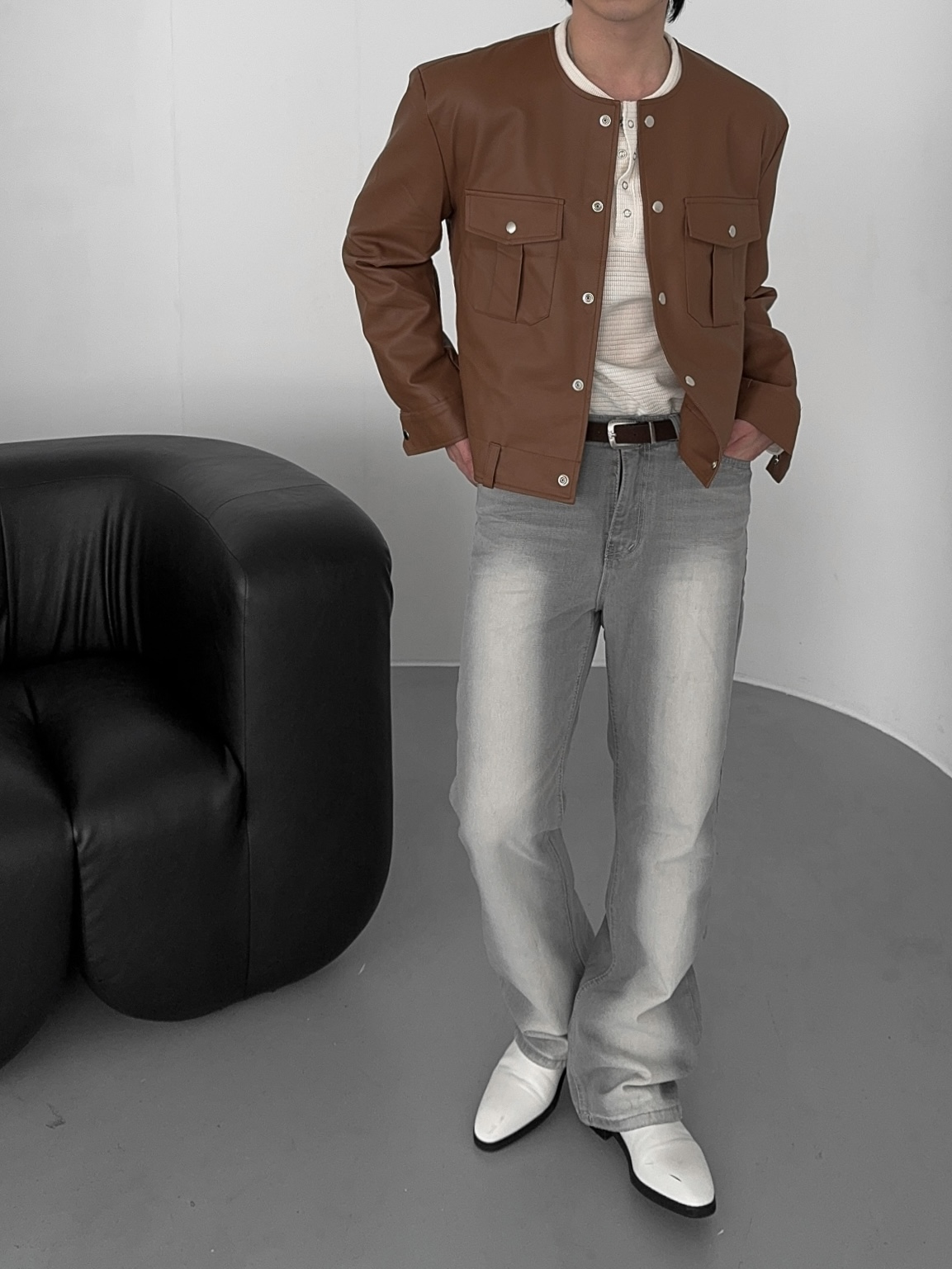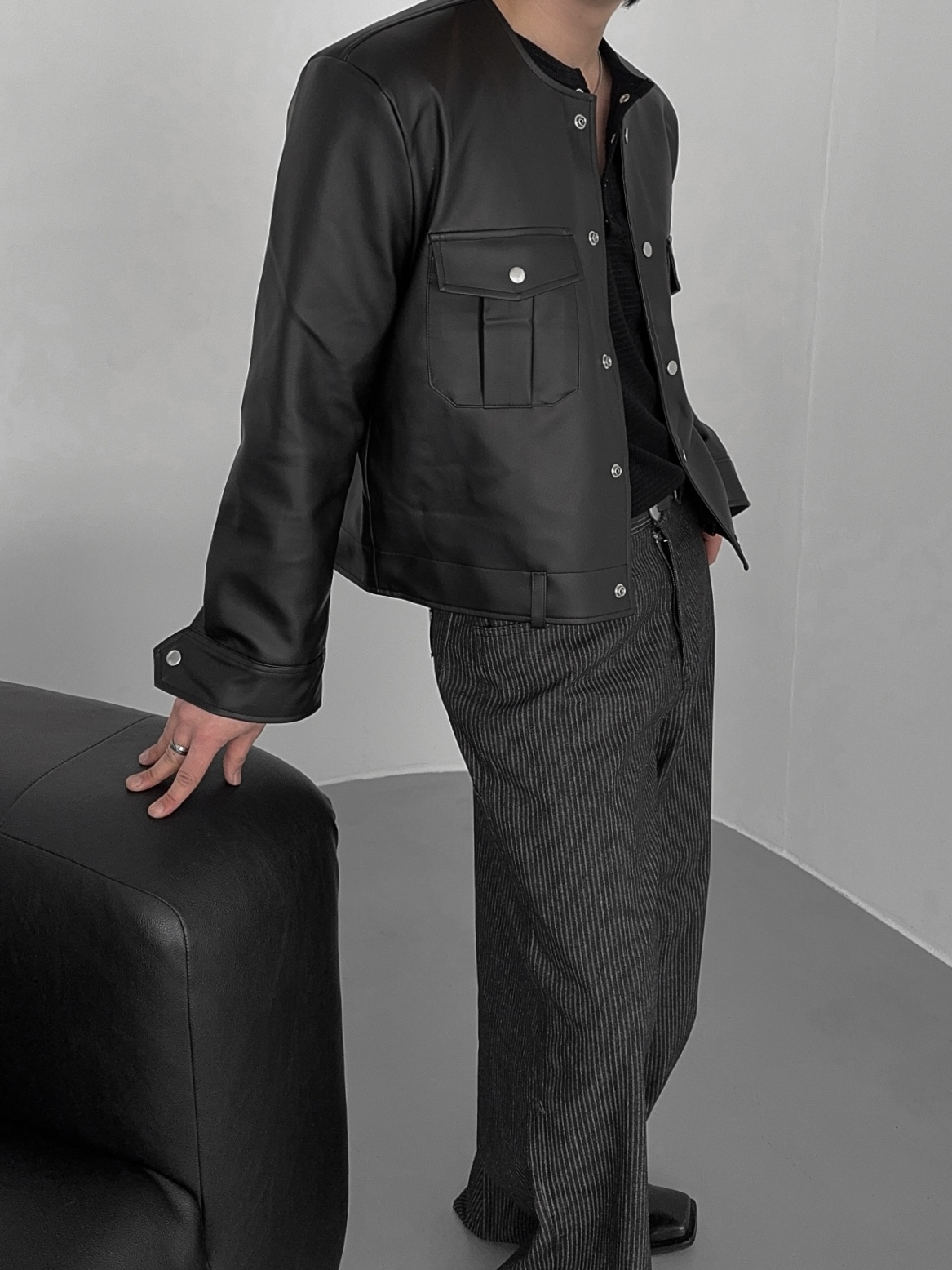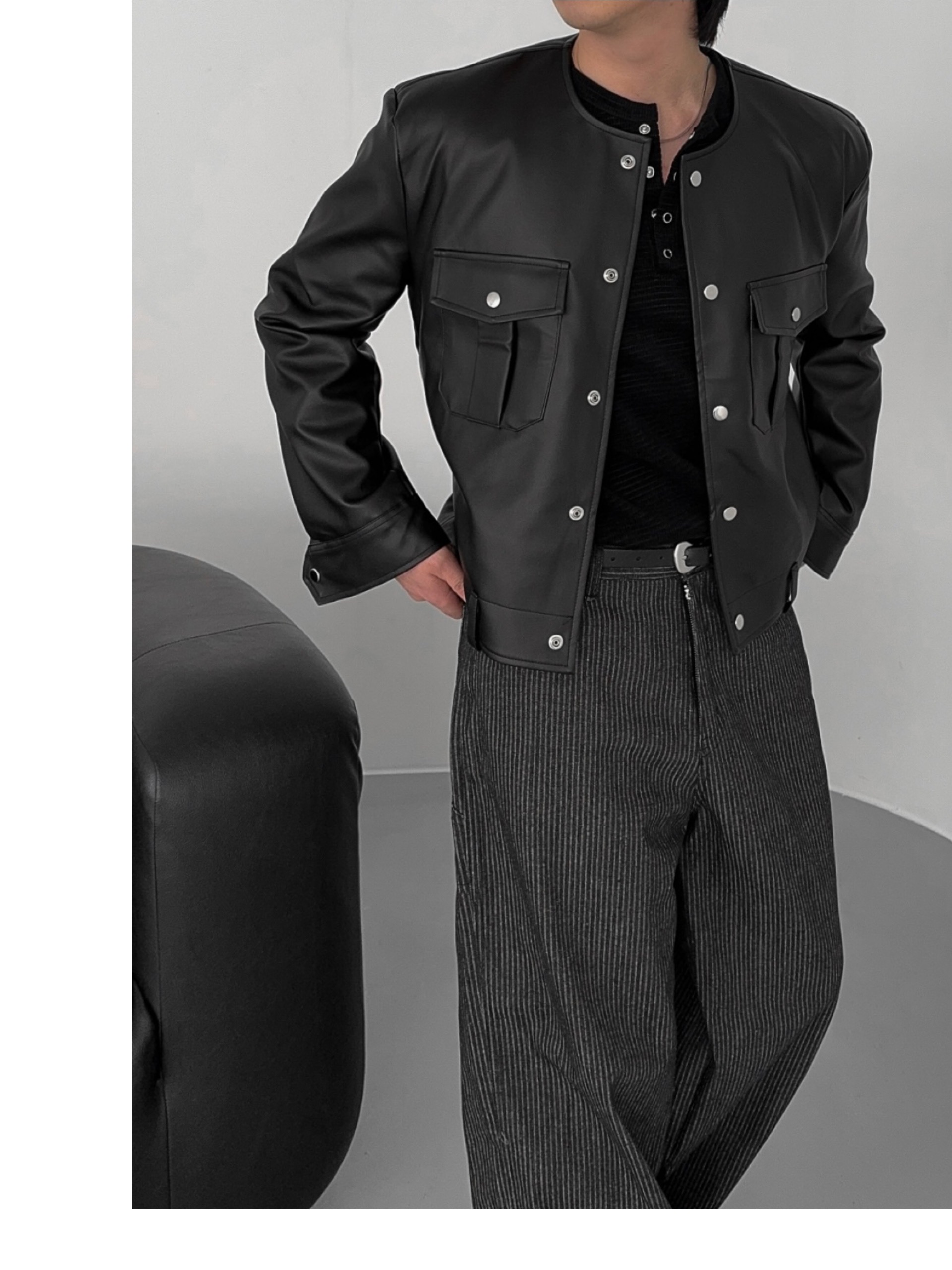 -깔끔한 카라리스 라운드넥 디자인의 레더 자켓