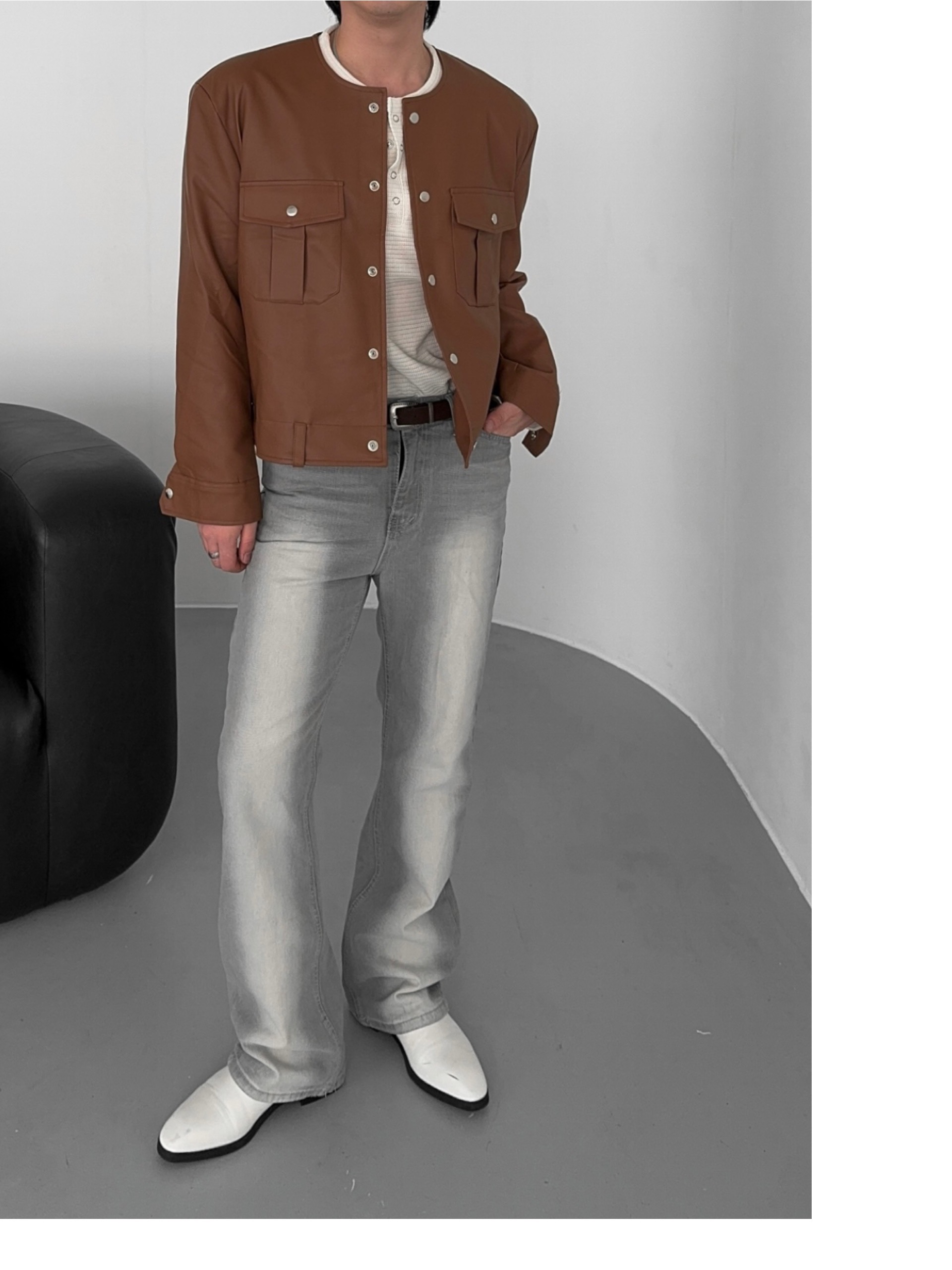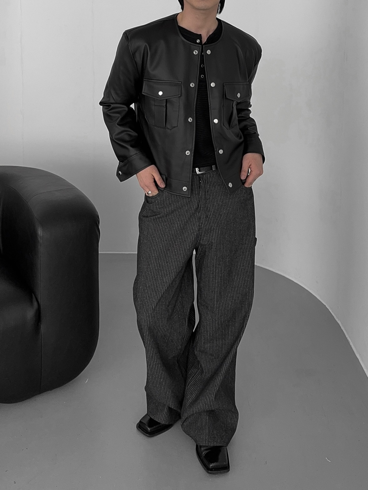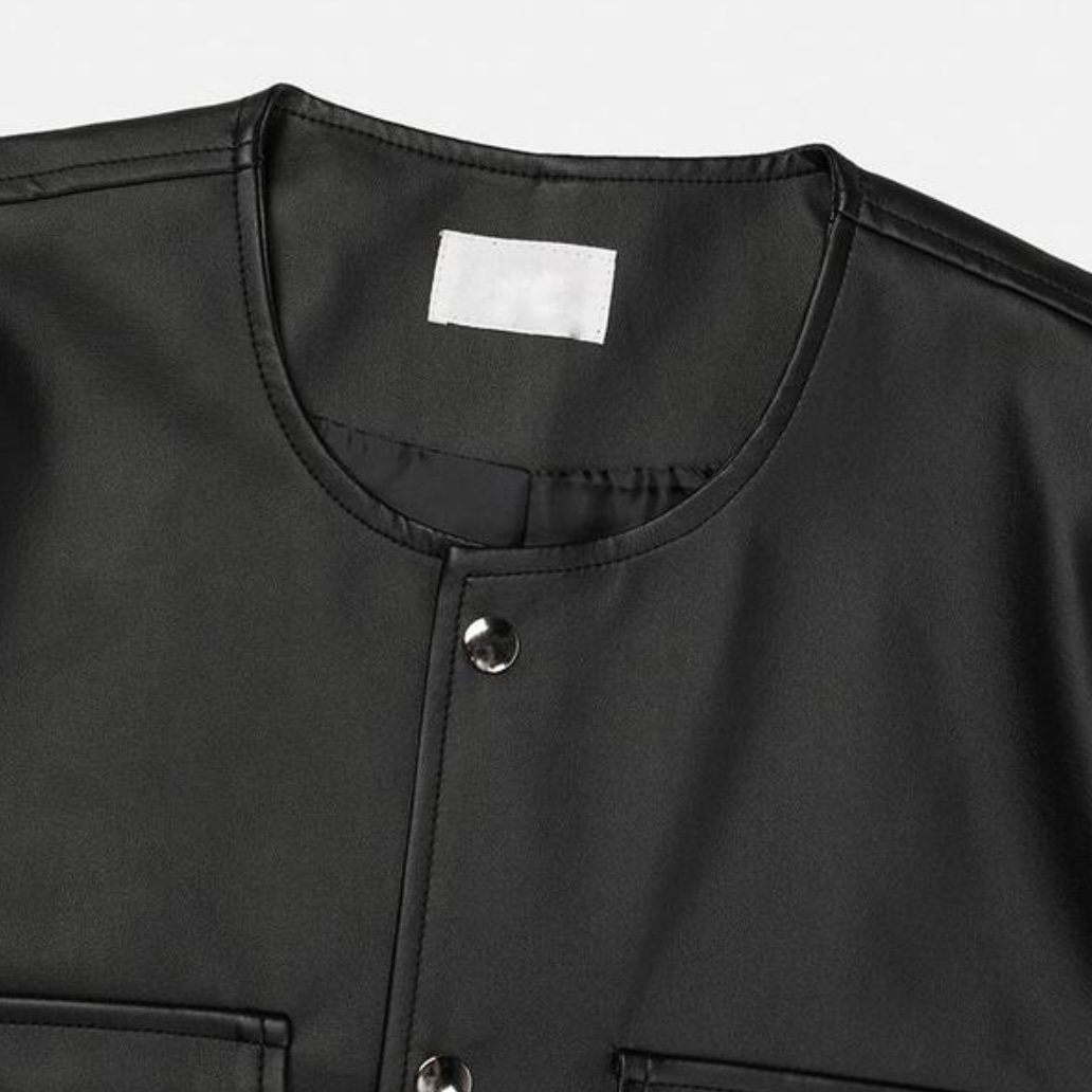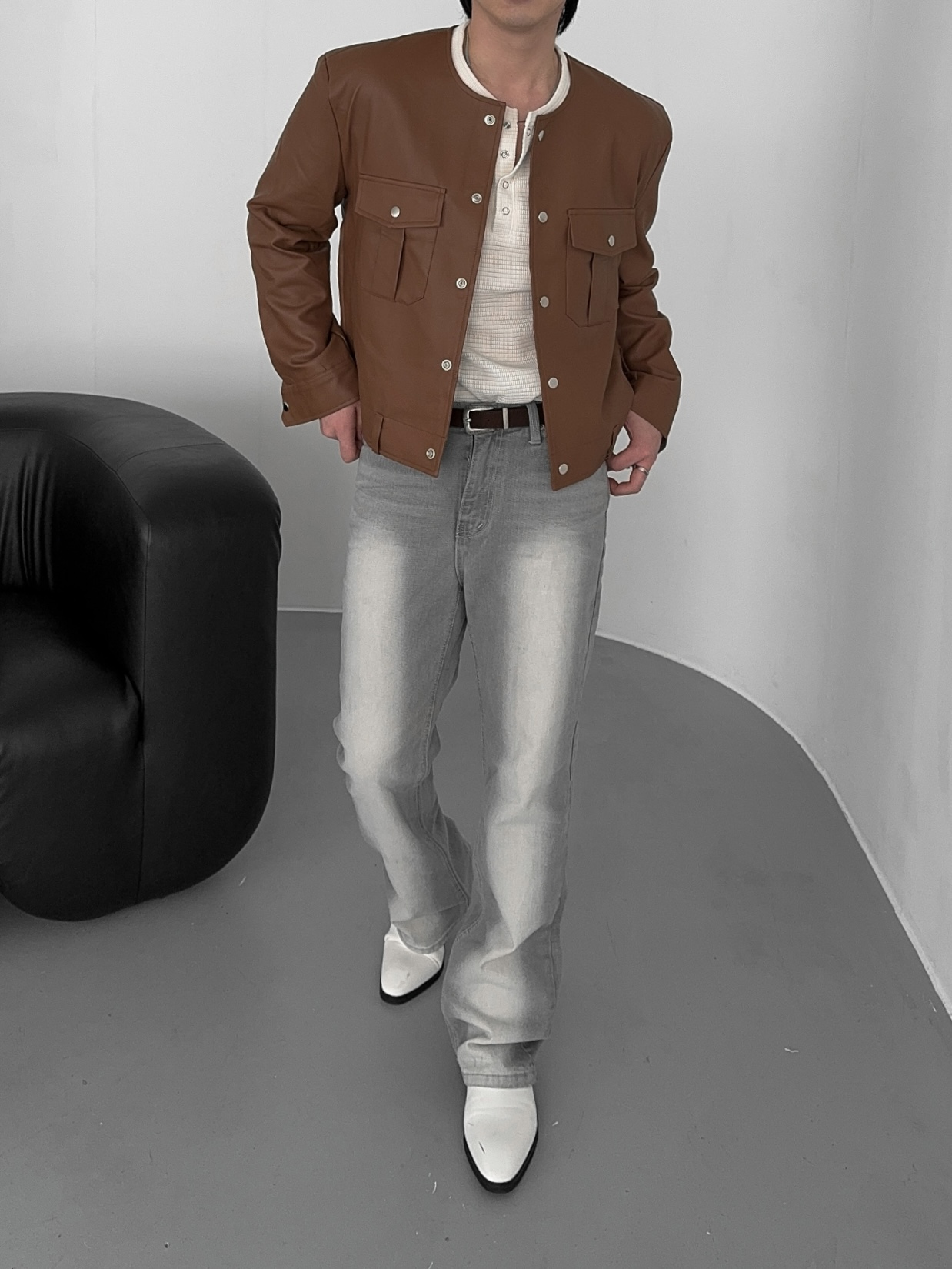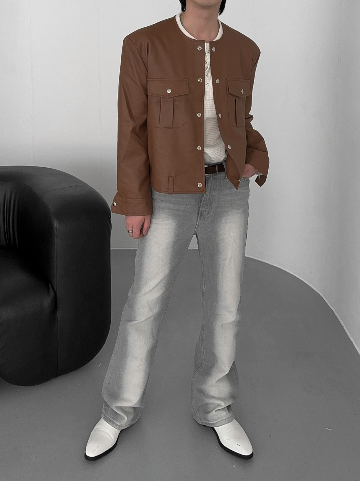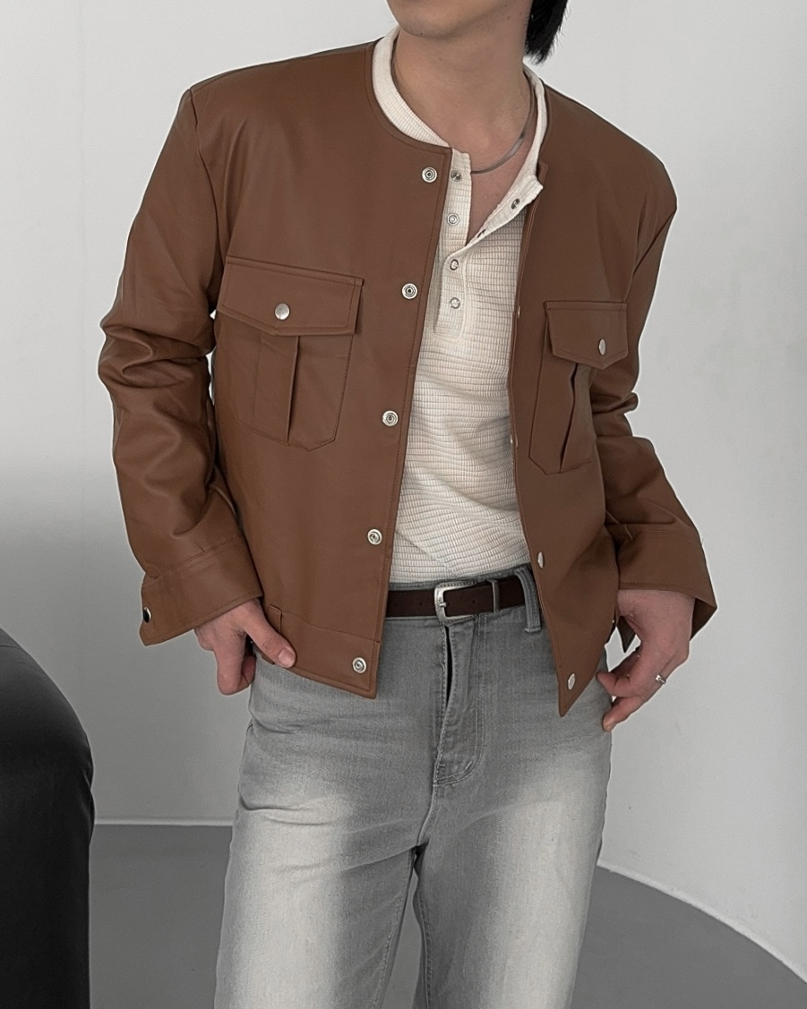 -깔끔한 카라리스 라운드넥 디자인의 레더 자켓