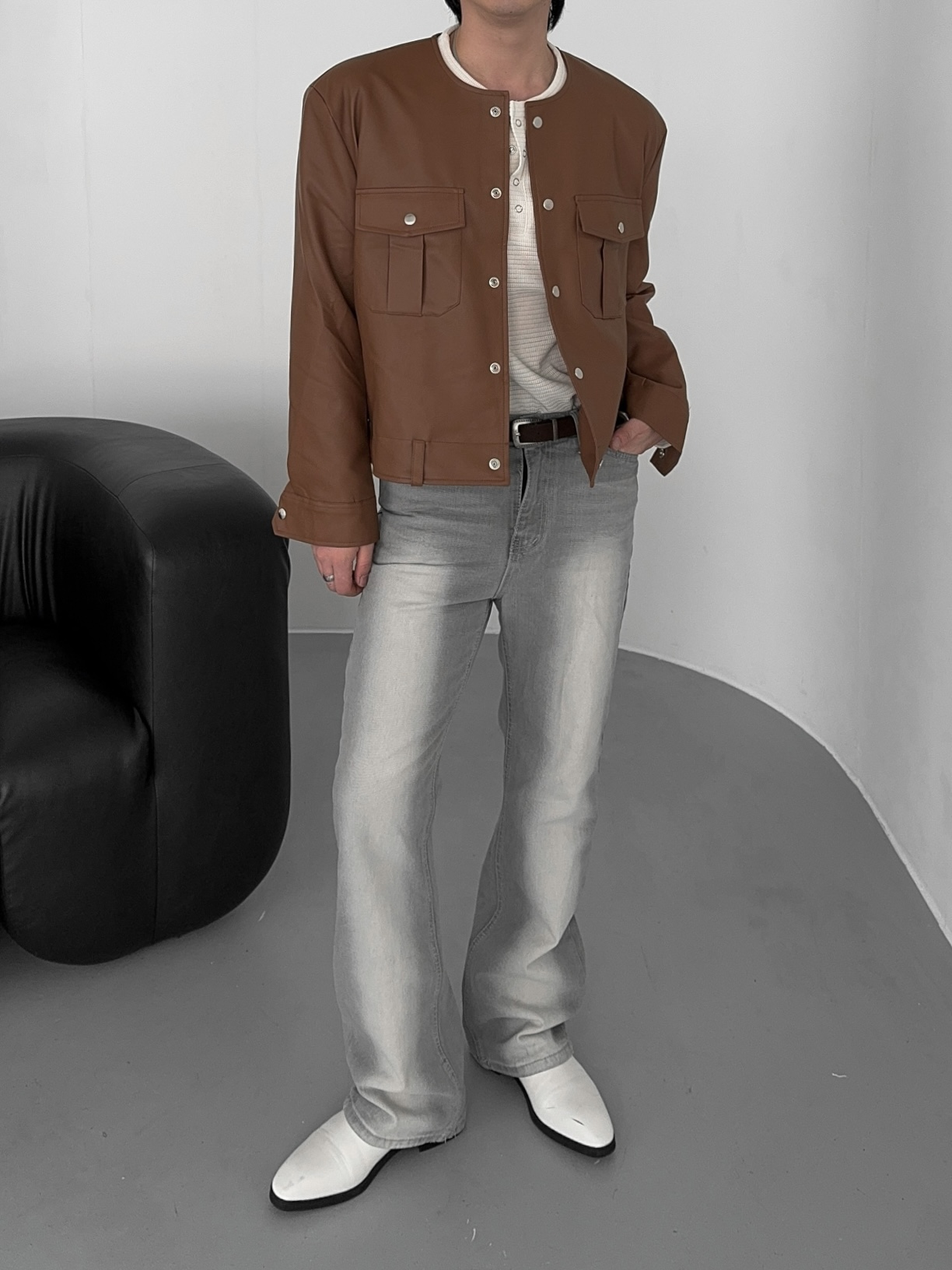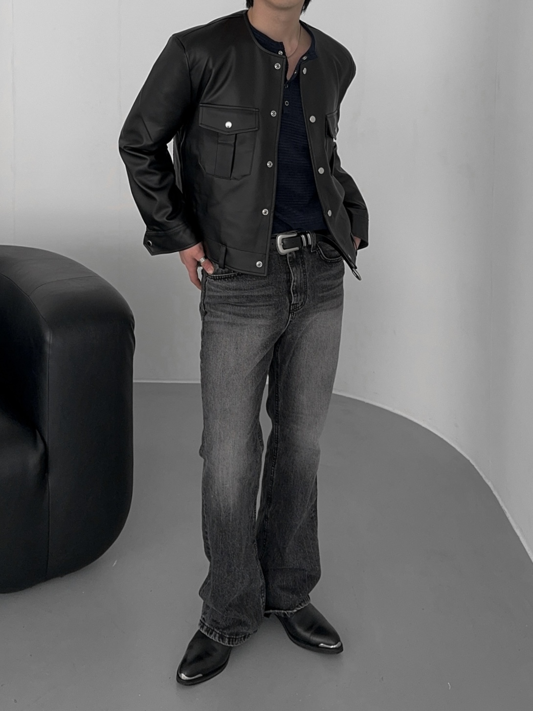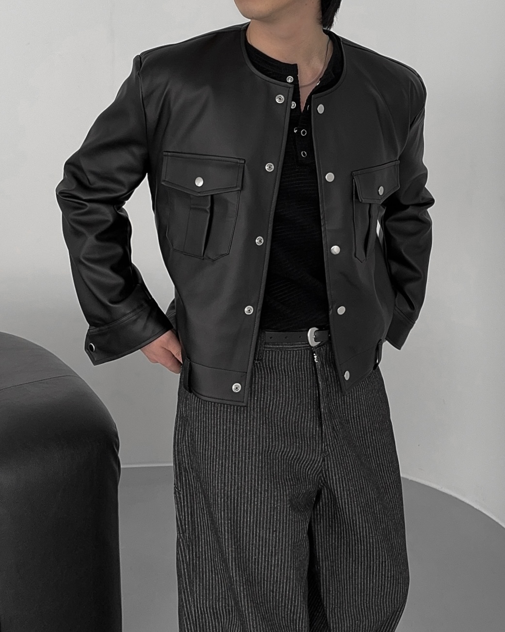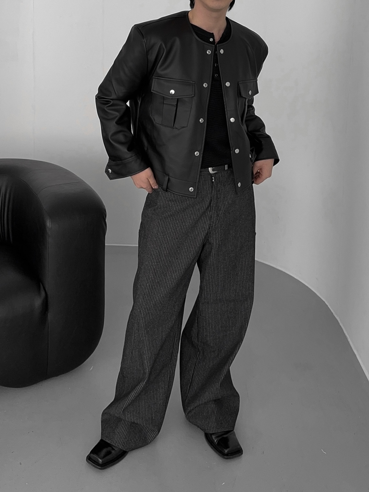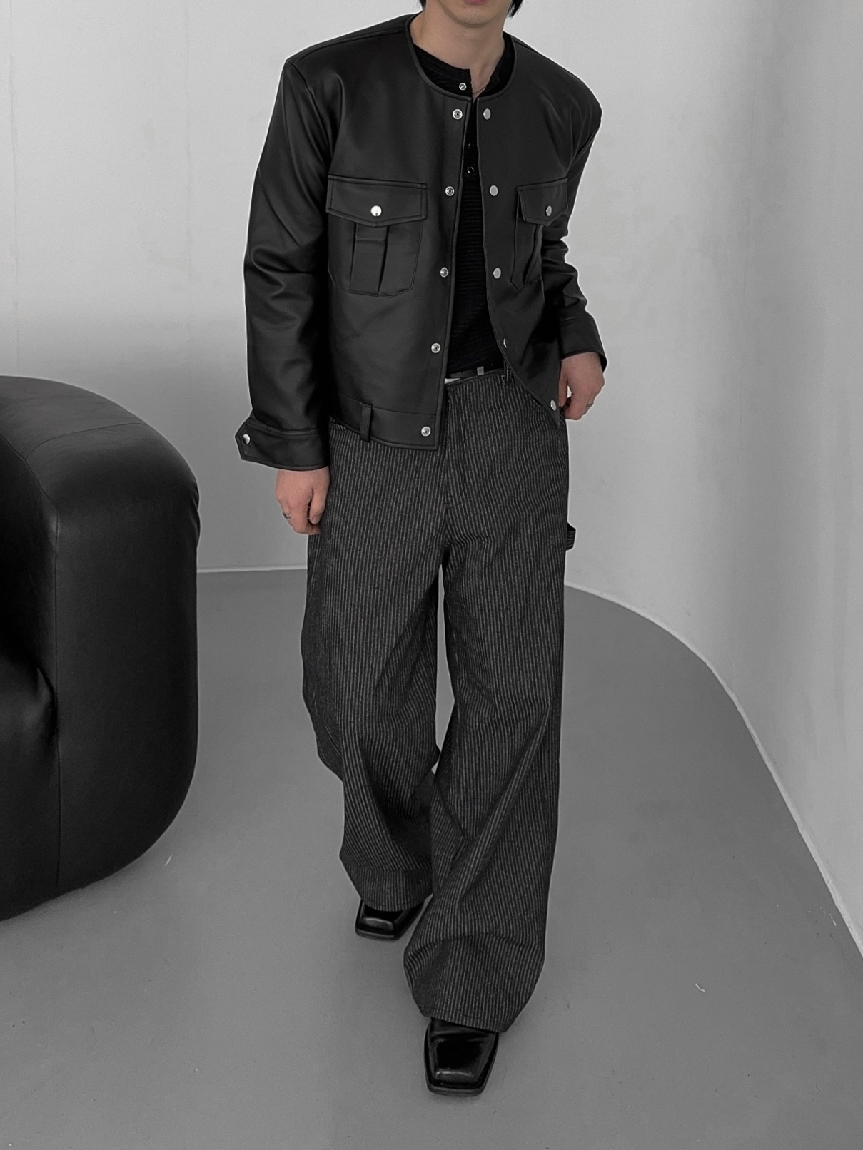 -깔끔한 카라리스 라운드넥 디자인의 레더 자켓
