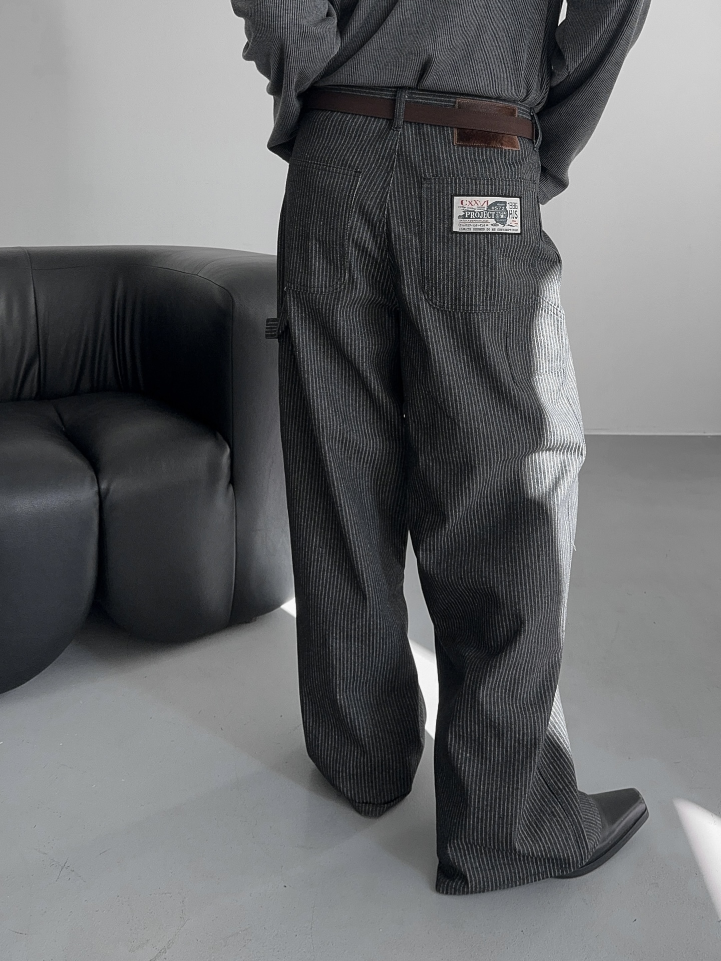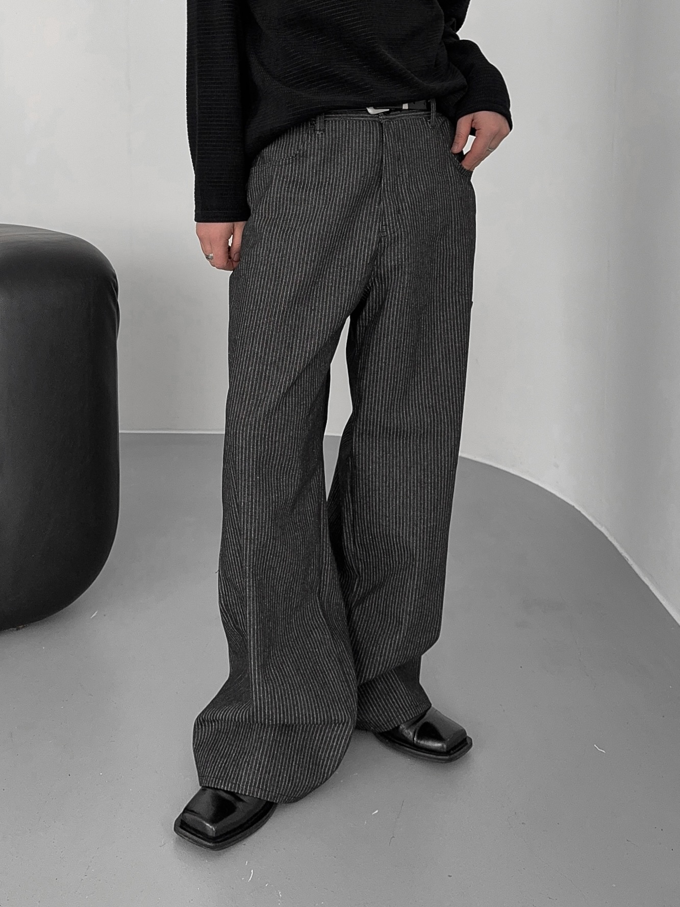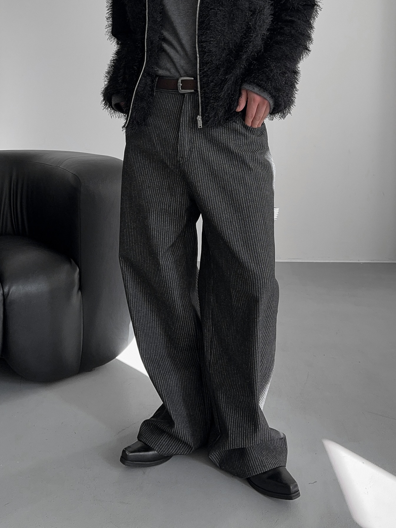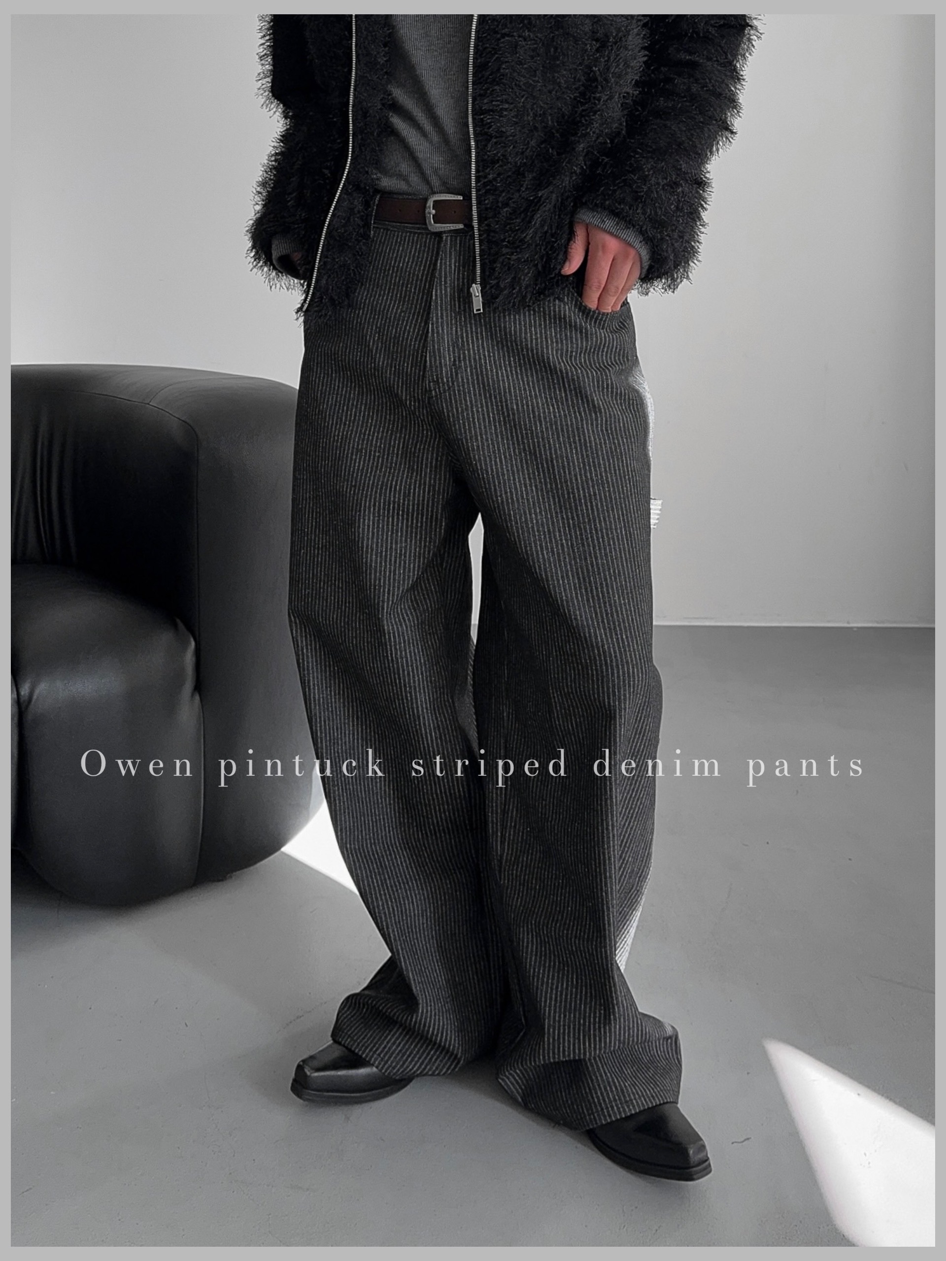 -전체 핀 스트라이프 패턴감의 데님 팬츠