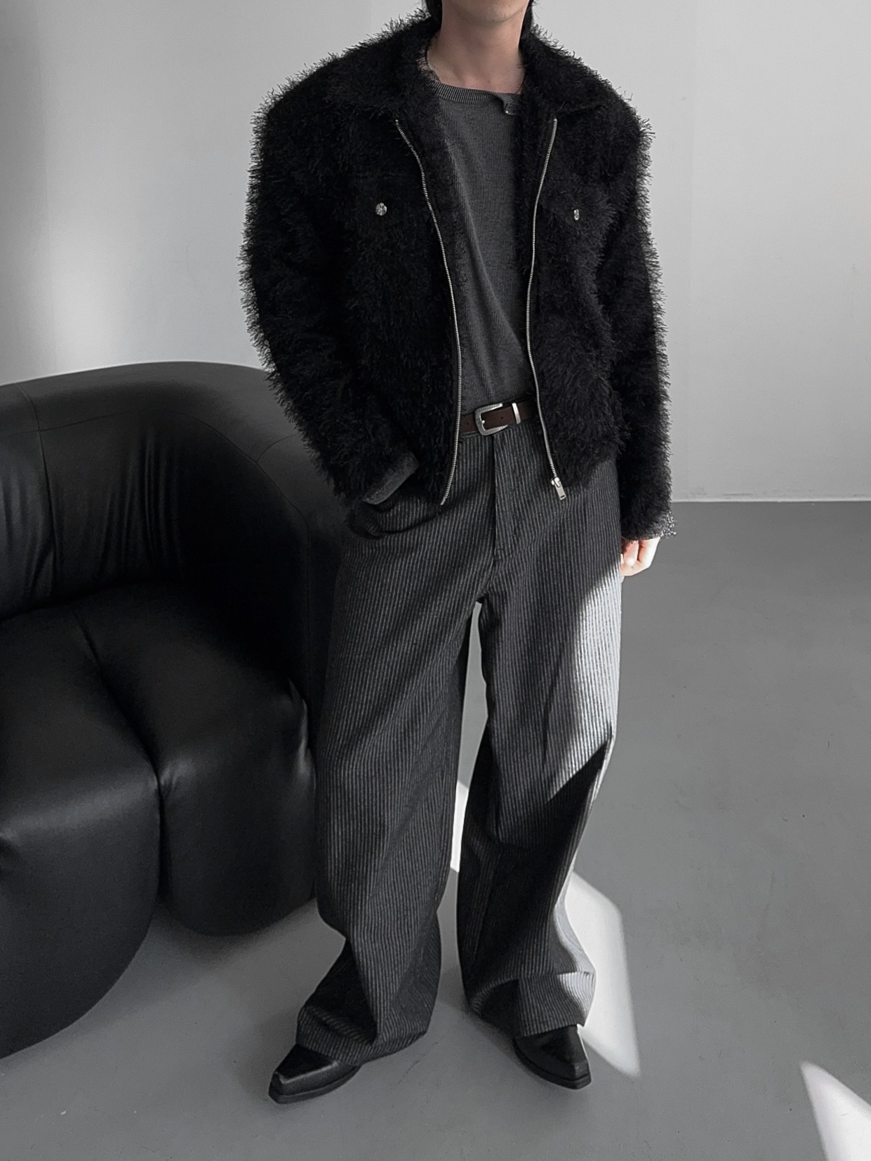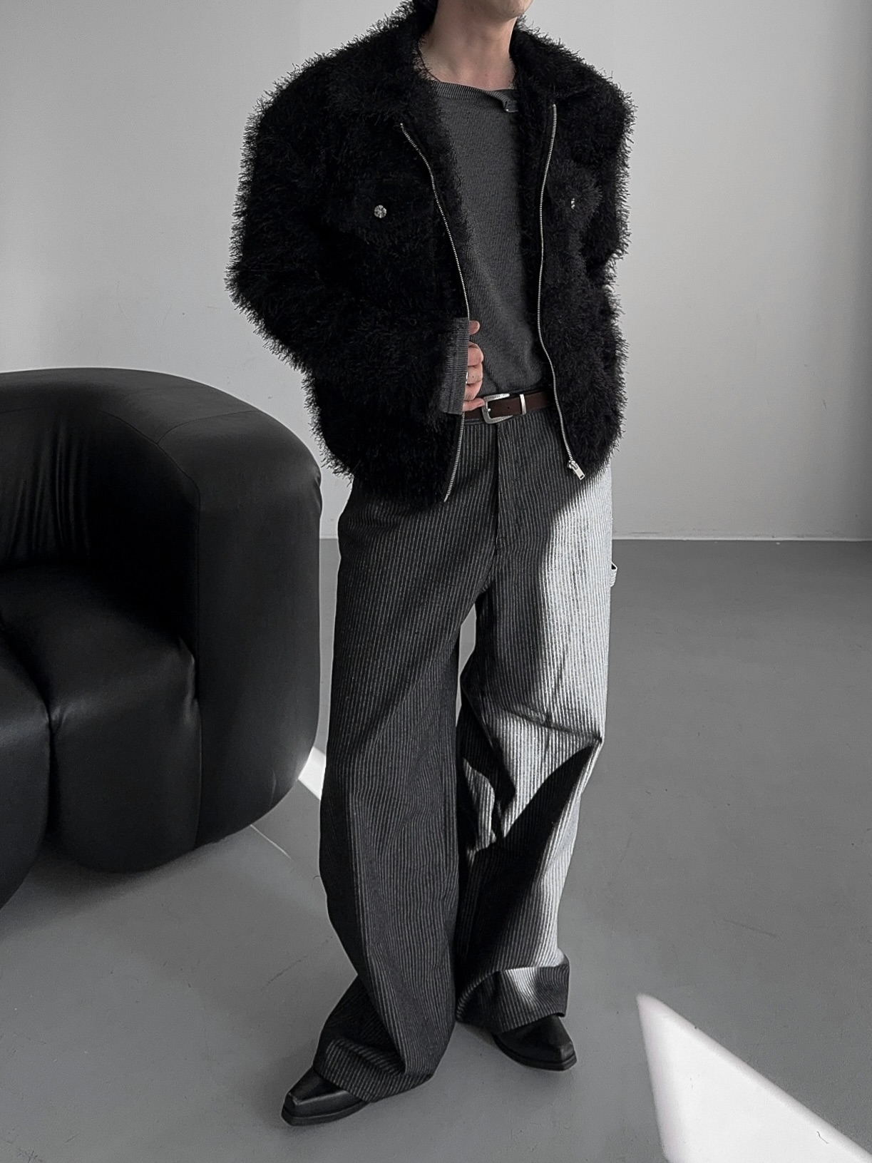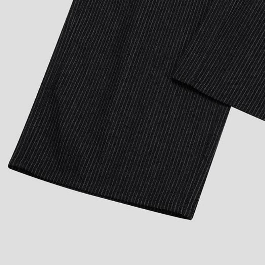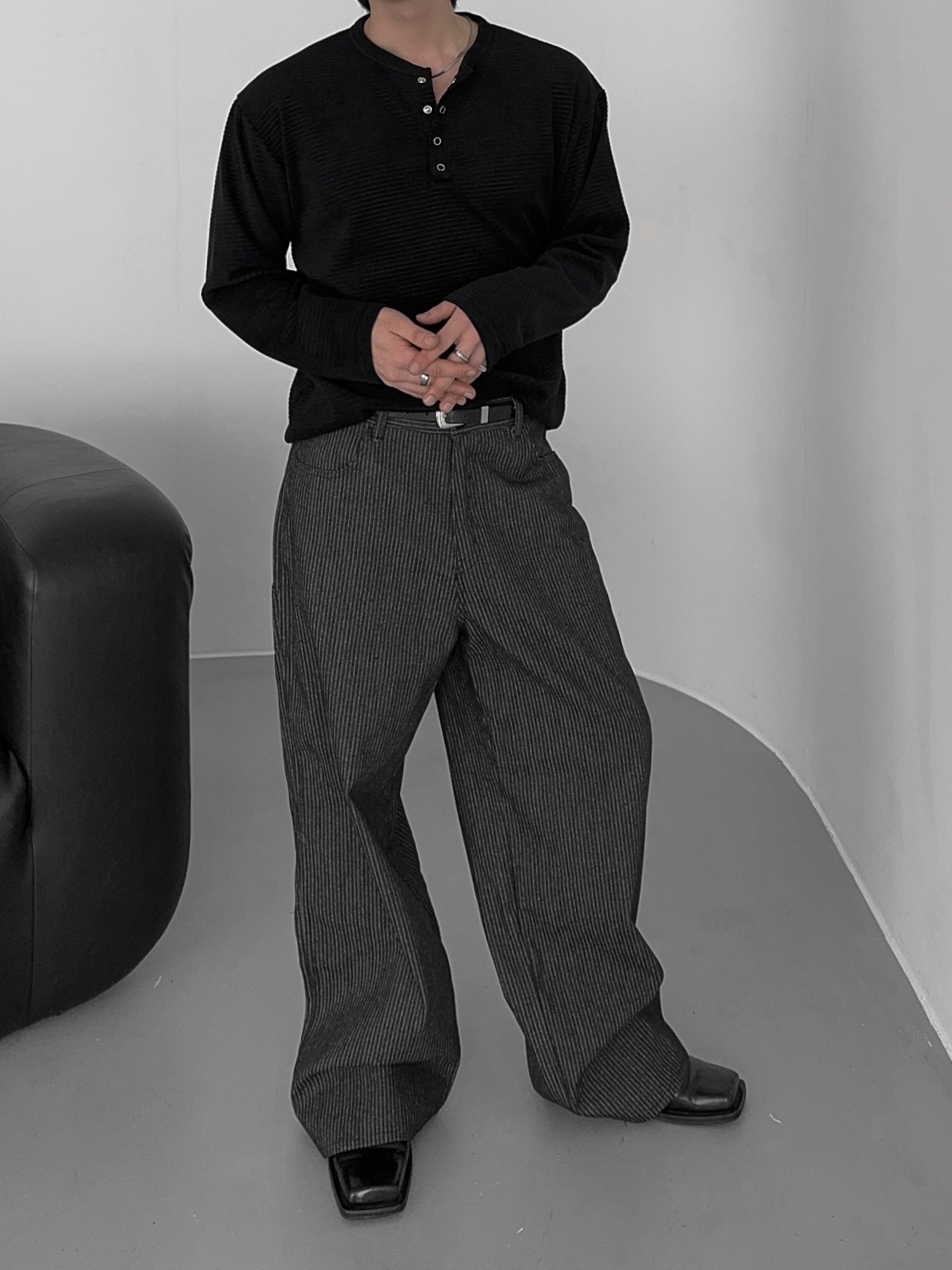 -전체 핀 스트라이프 패턴감의 데님 팬츠