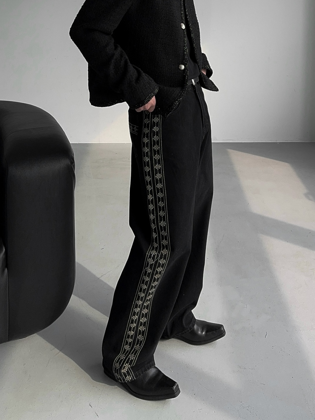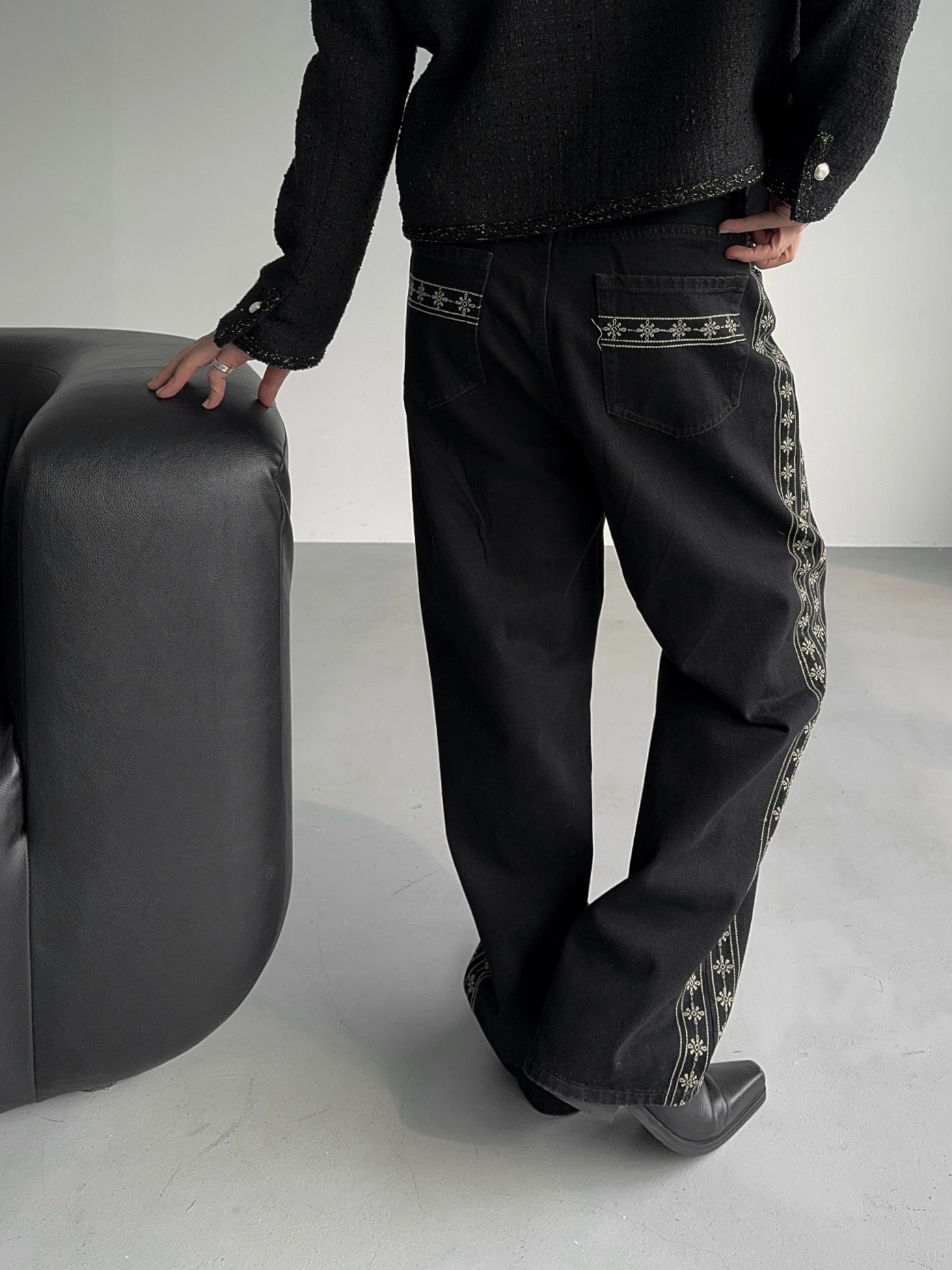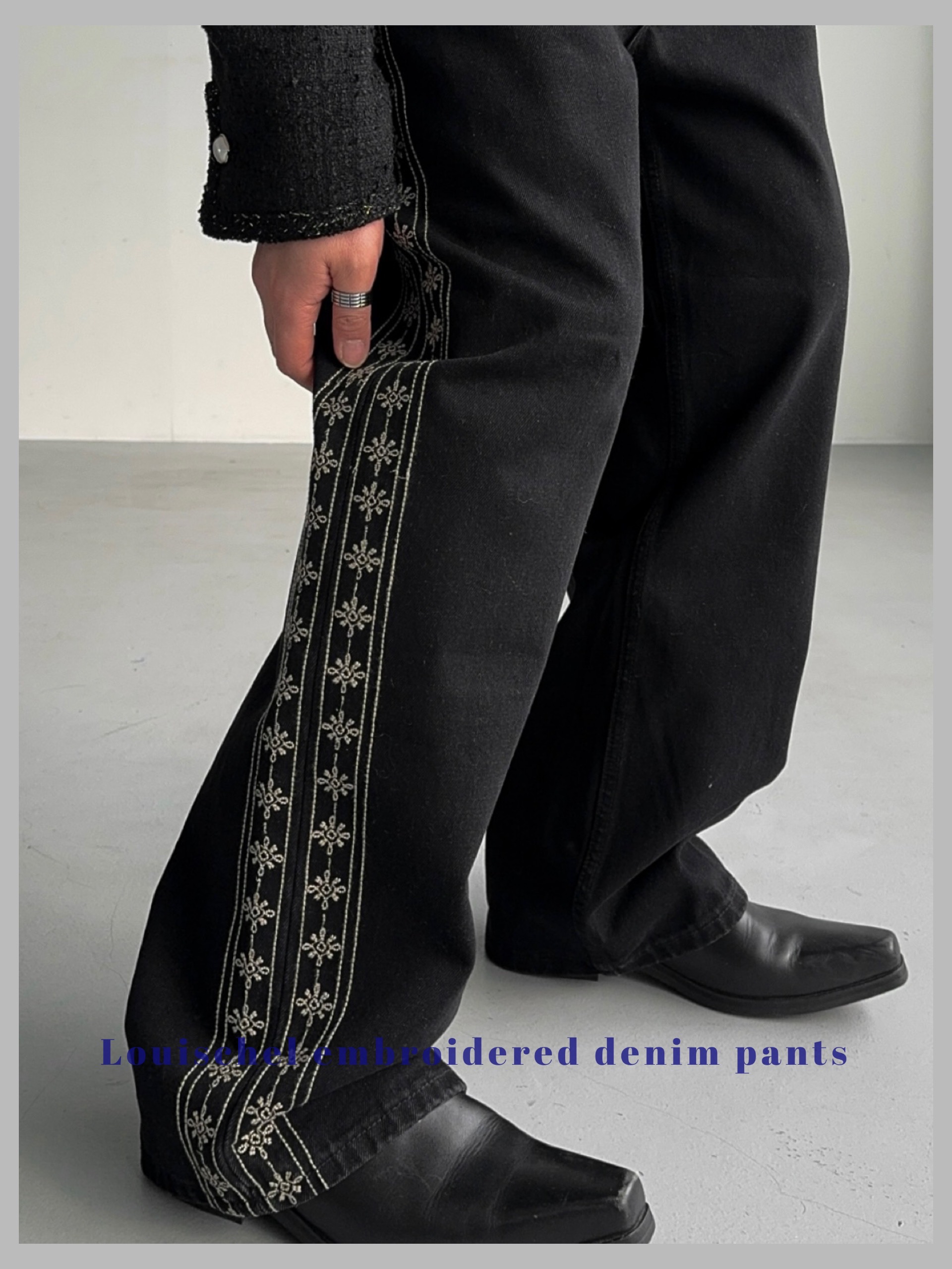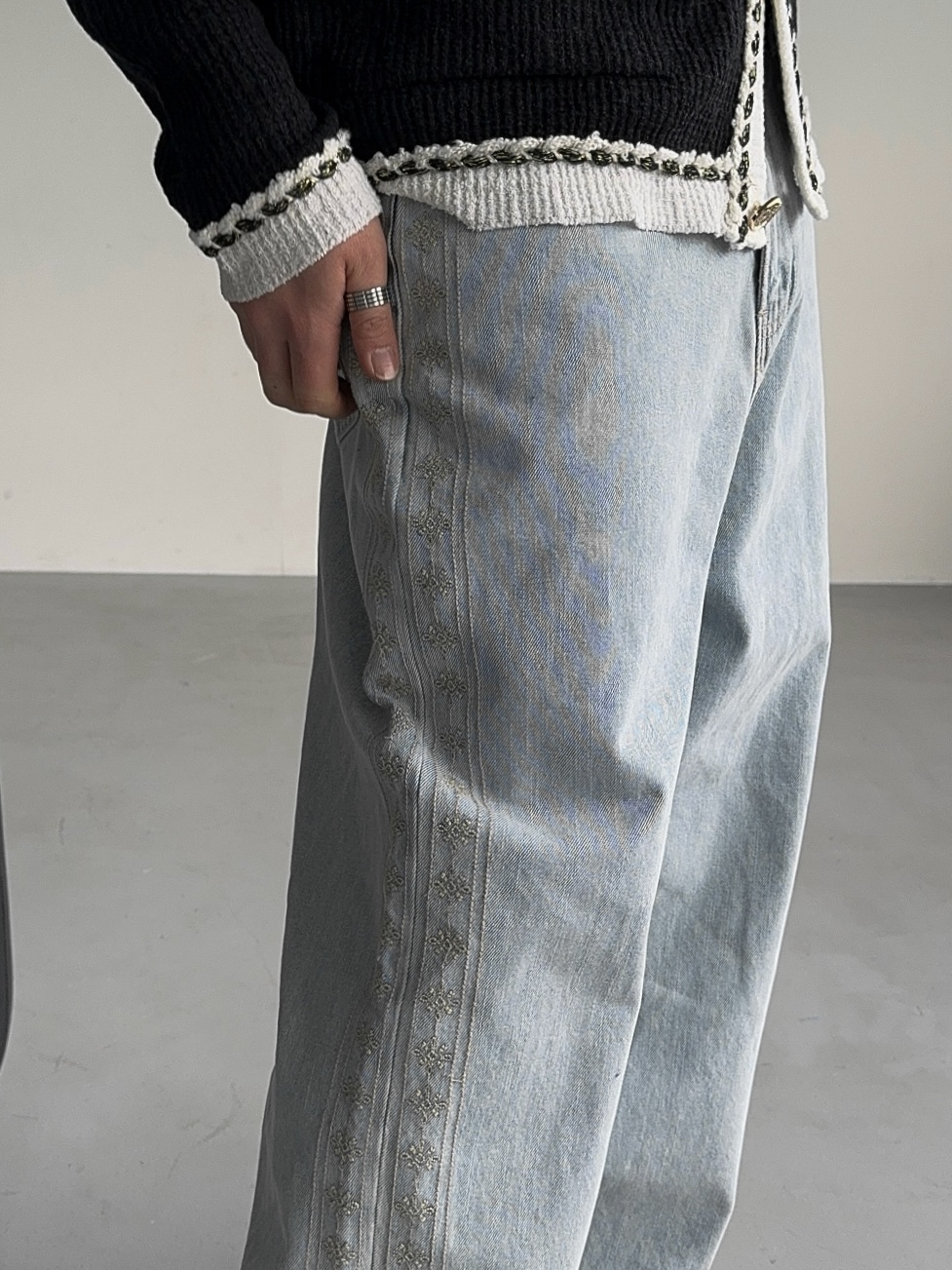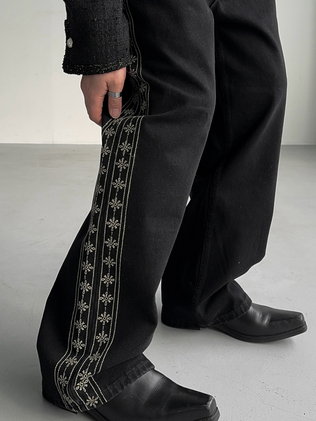 -핸드메이드 스티치 자수 포인트 디자인으로 제작된 데님 팬츠