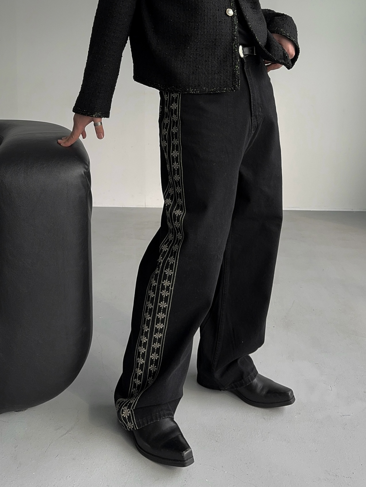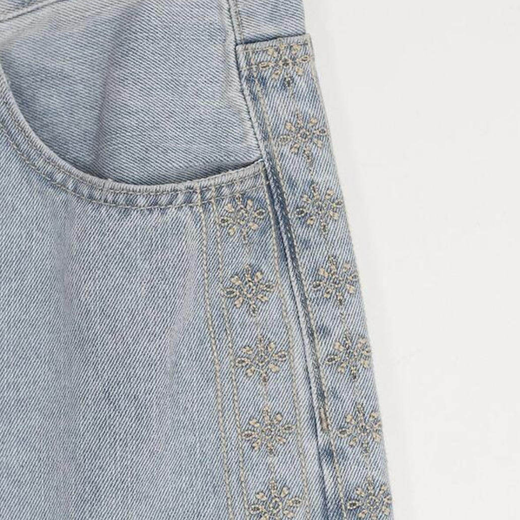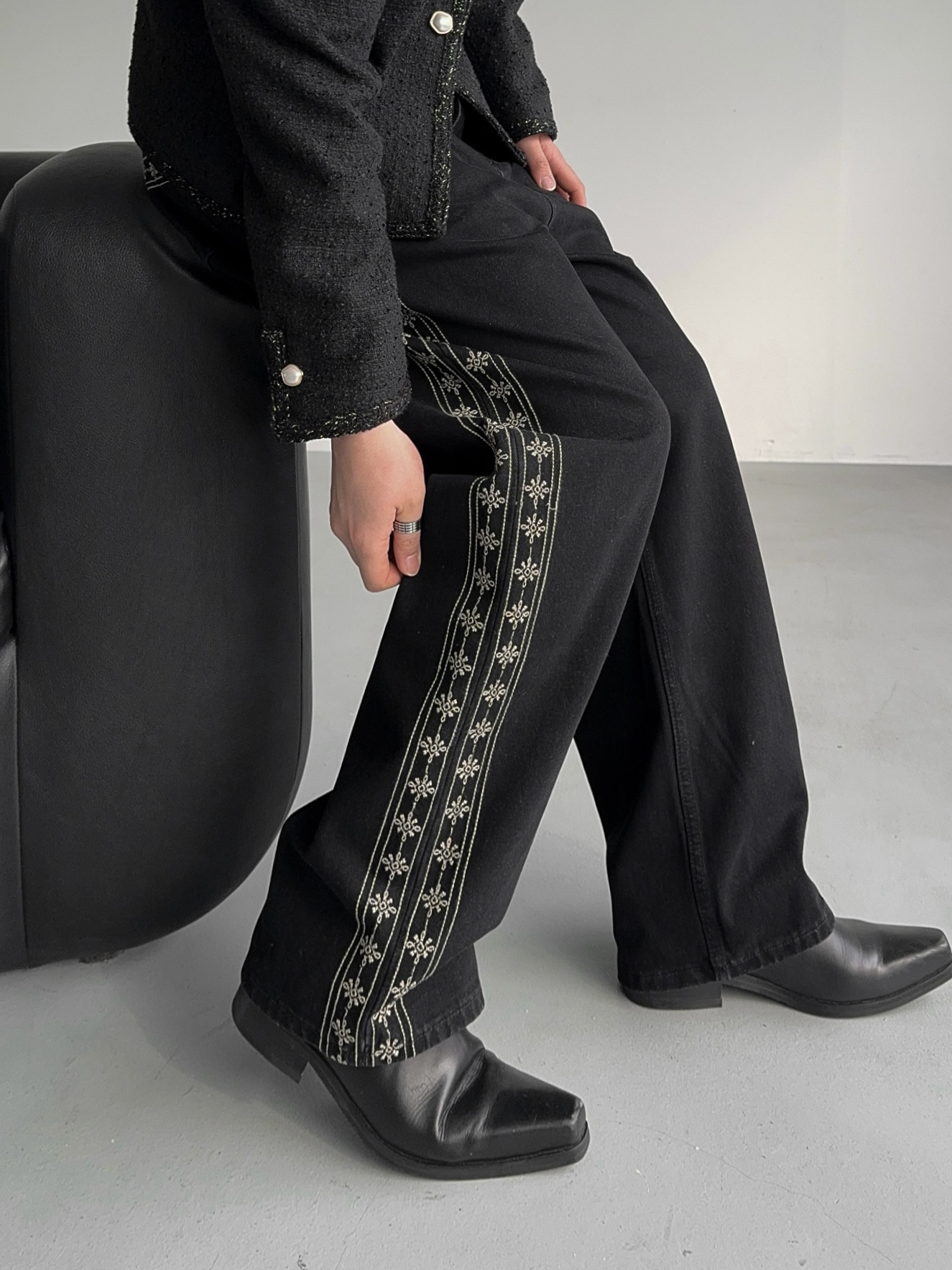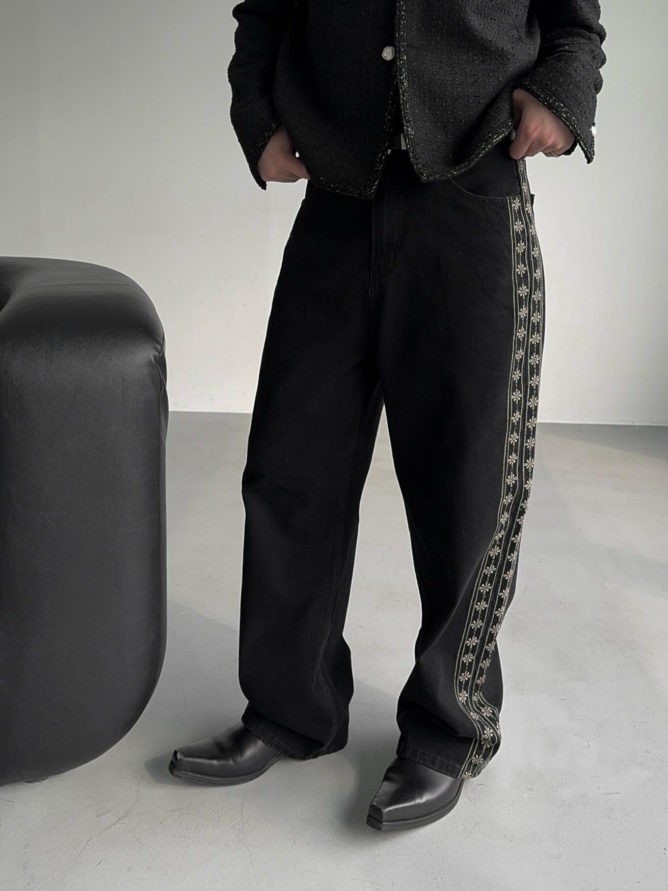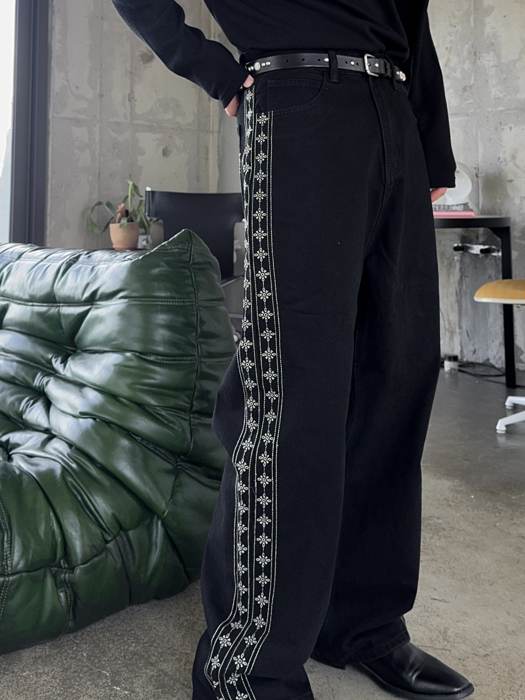 -핸드메이드 스티치 자수 포인트 디자인으로 제작된 데님 팬츠