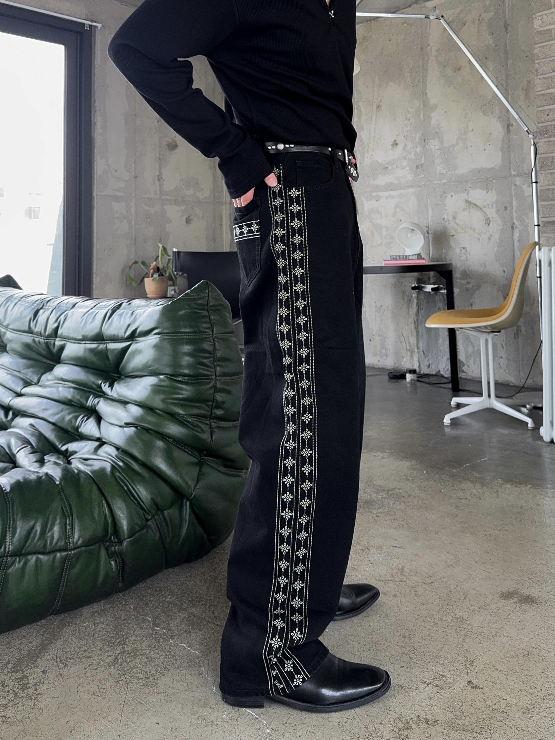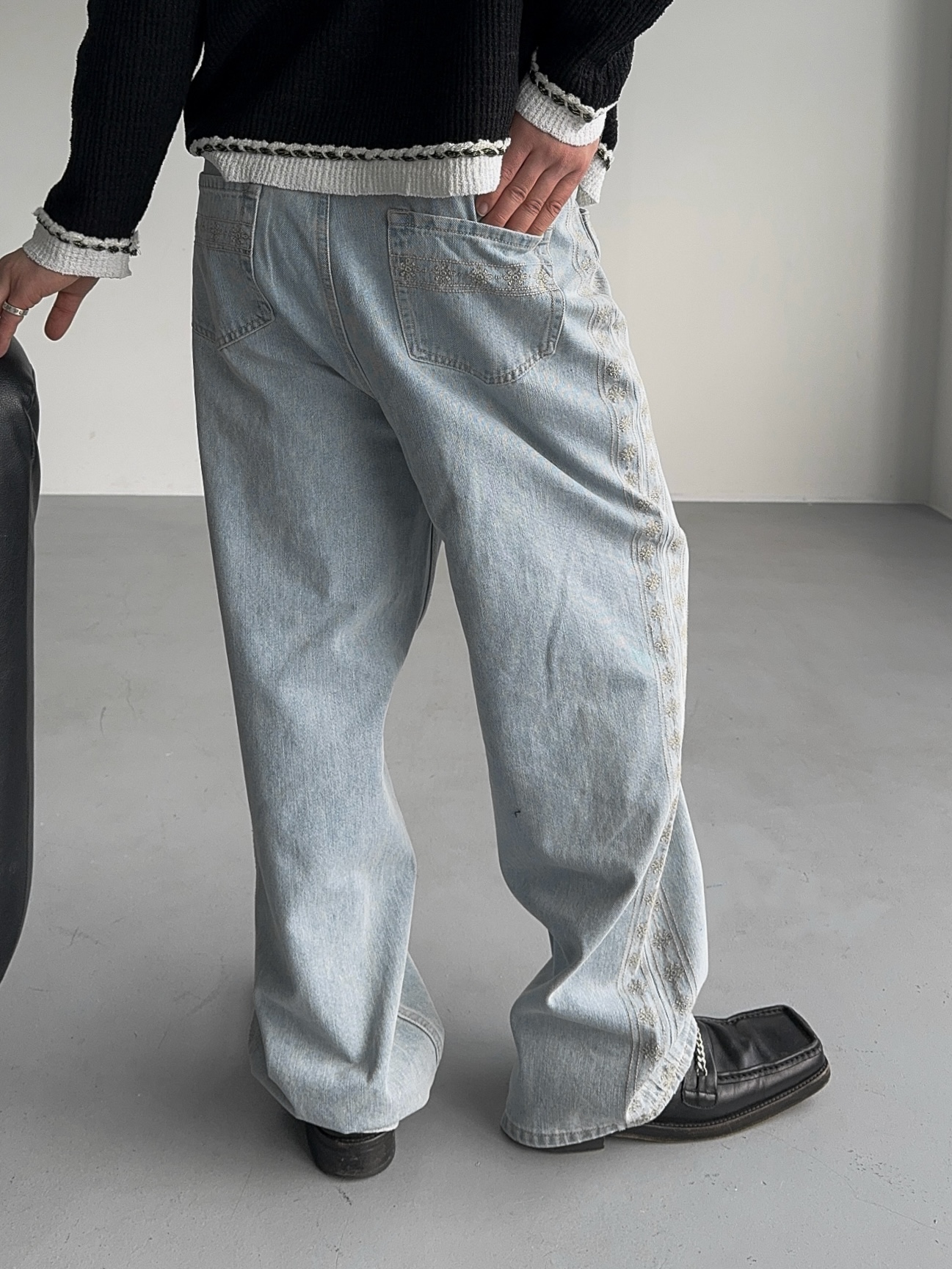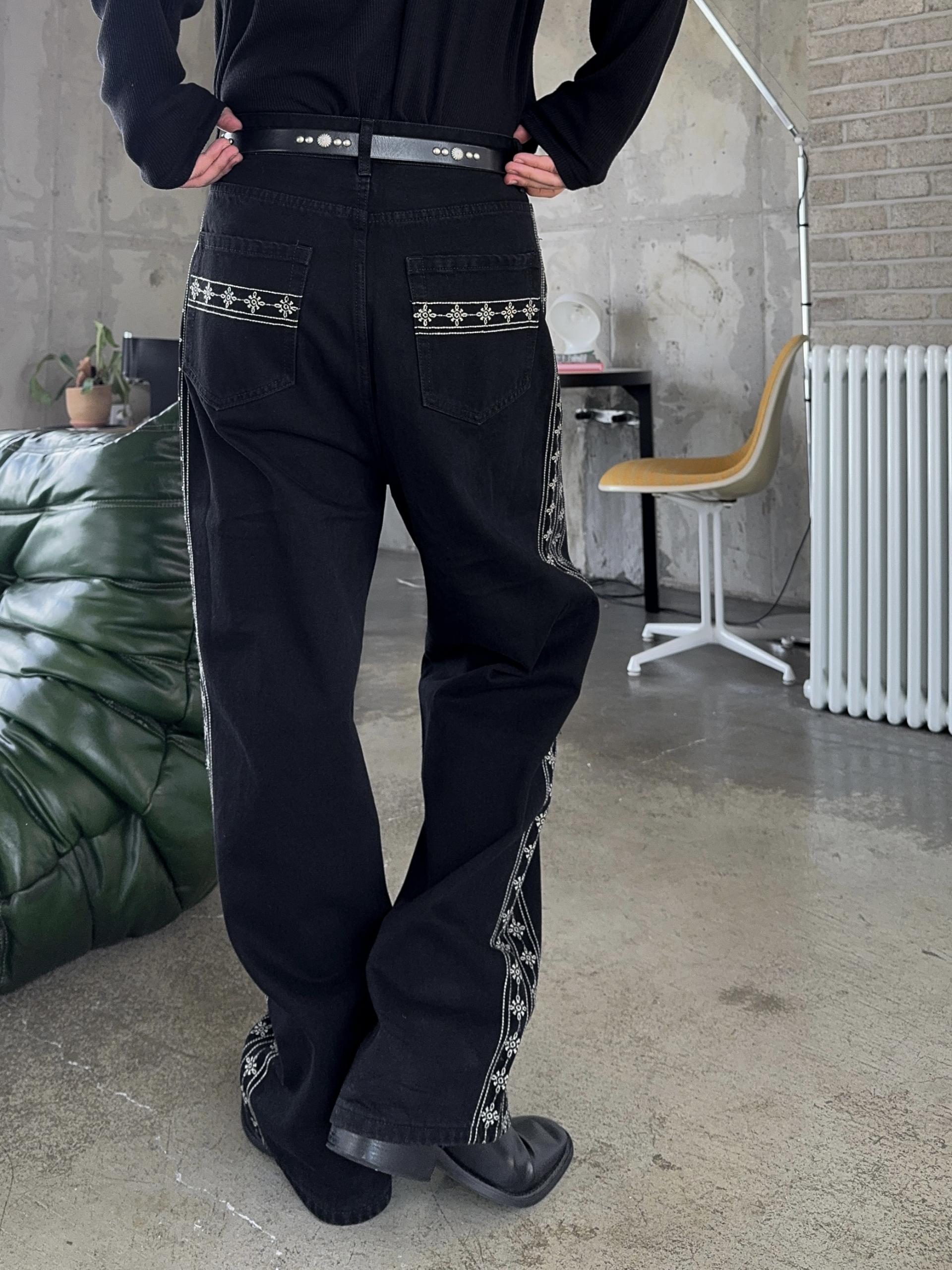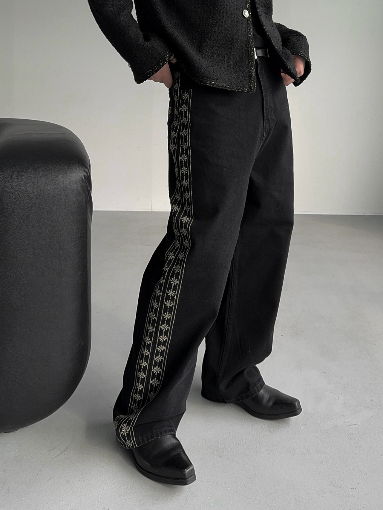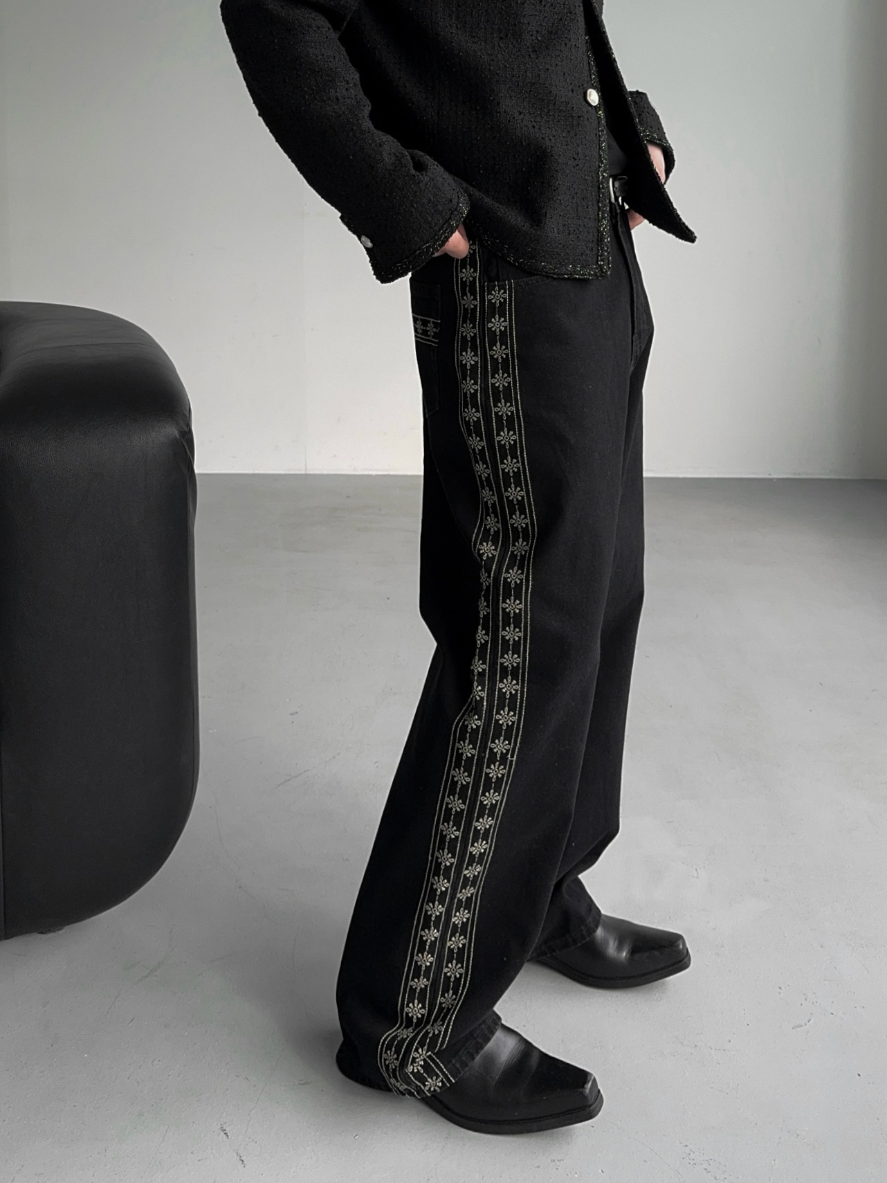 -핸드메이드 스티치 자수 포인트 디자인으로 제작된 데님 팬츠