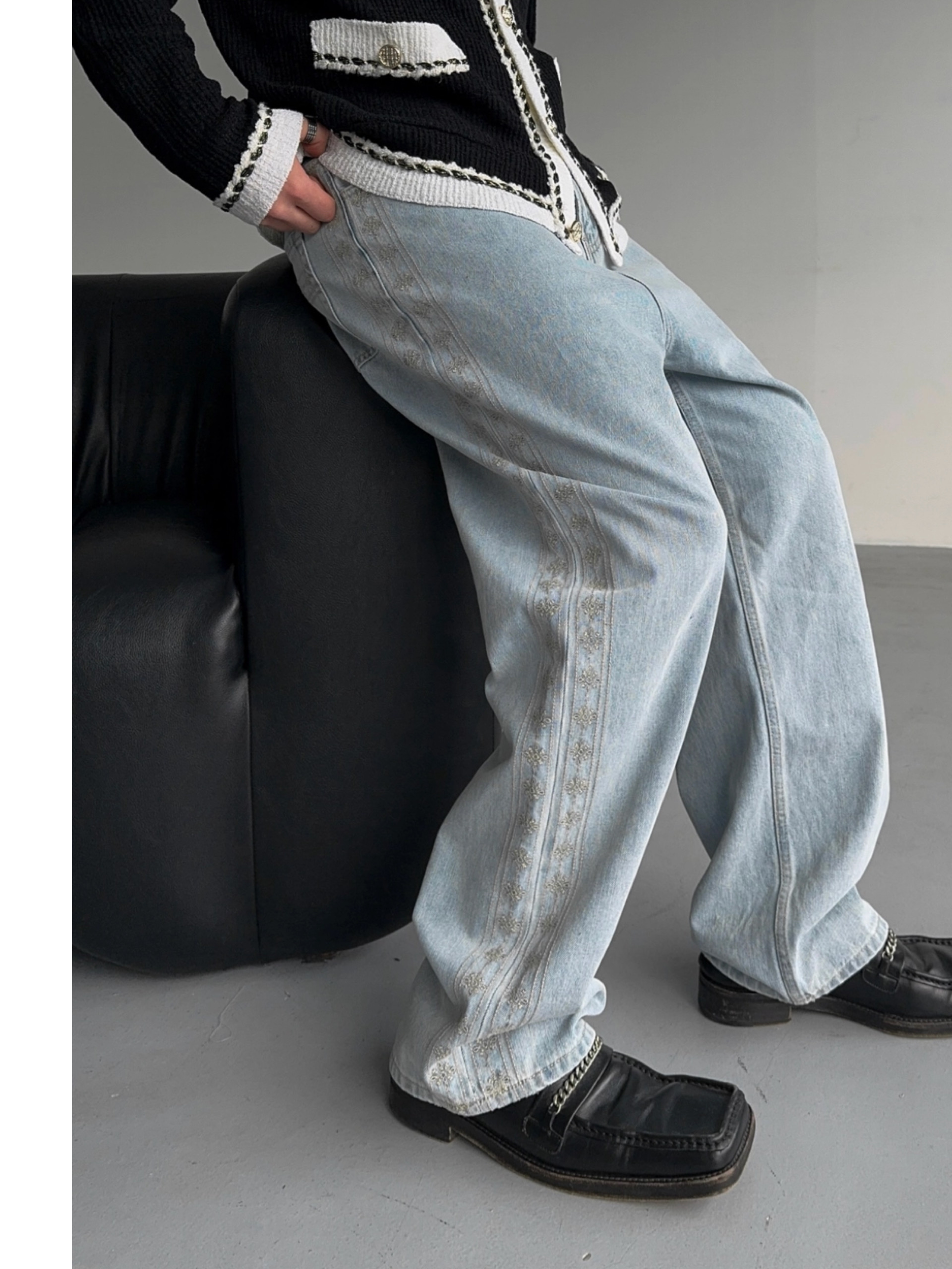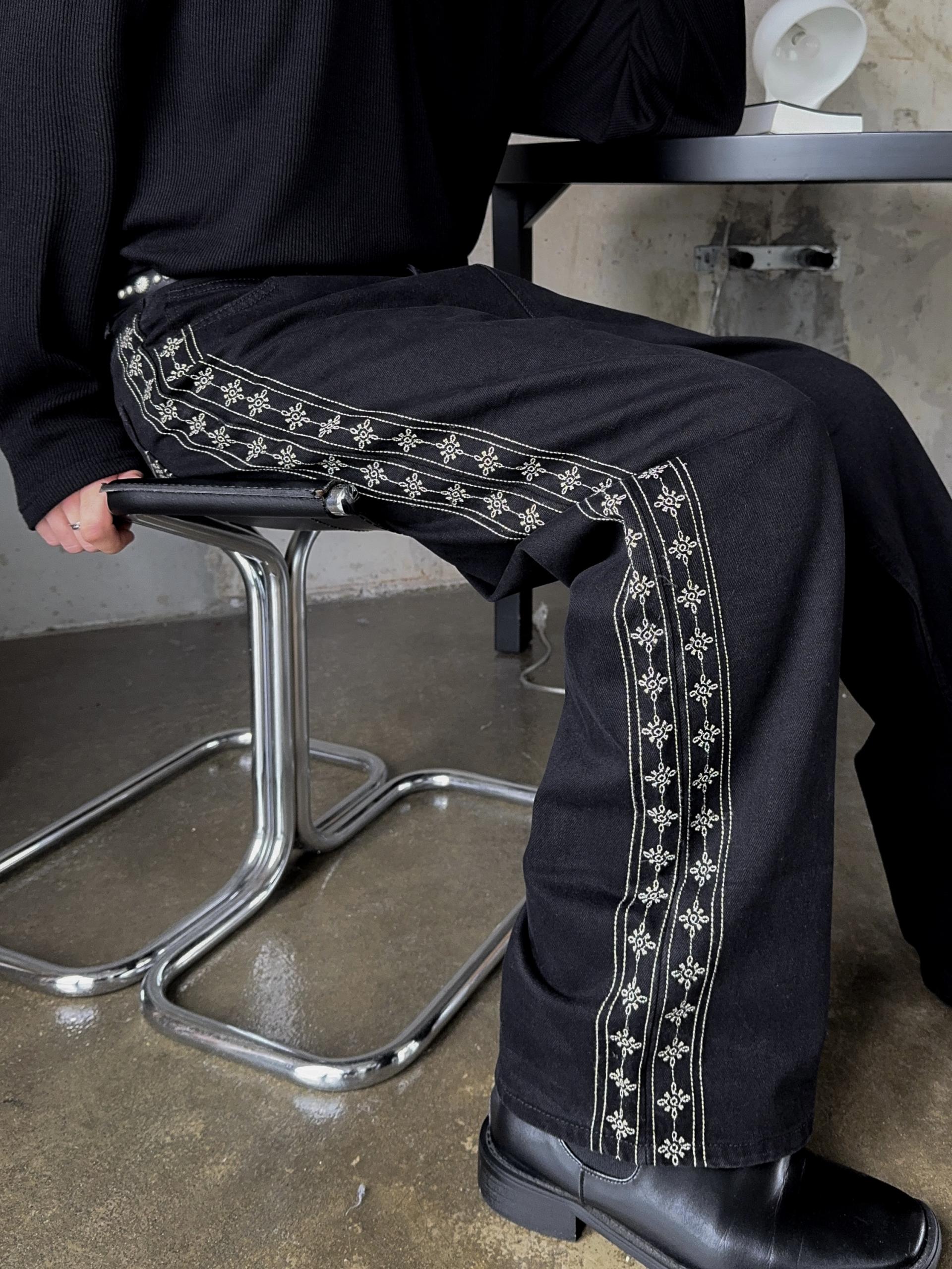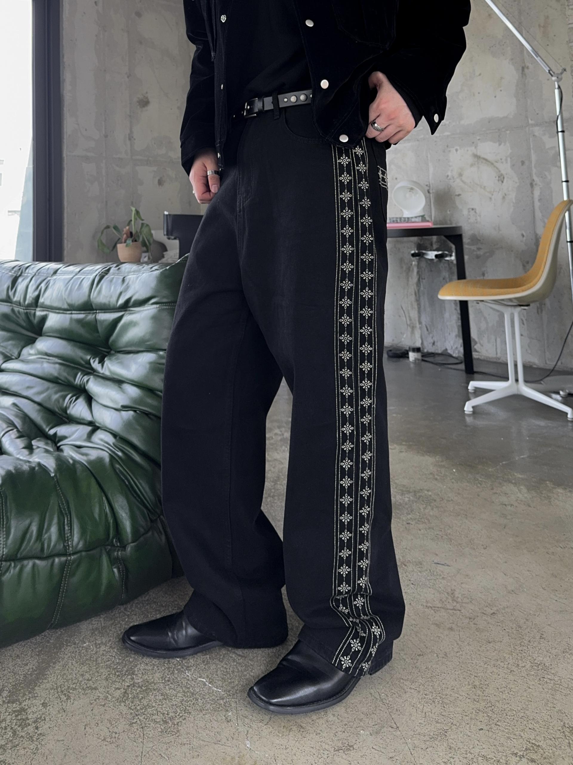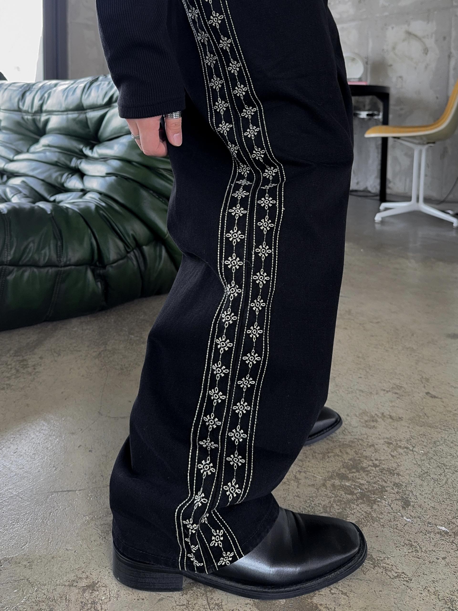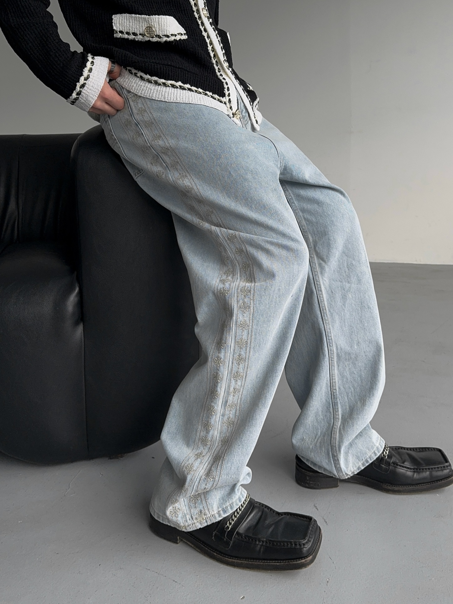 -핸드메이드 스티치 자수 포인트 디자인으로 제작된 데님 팬츠