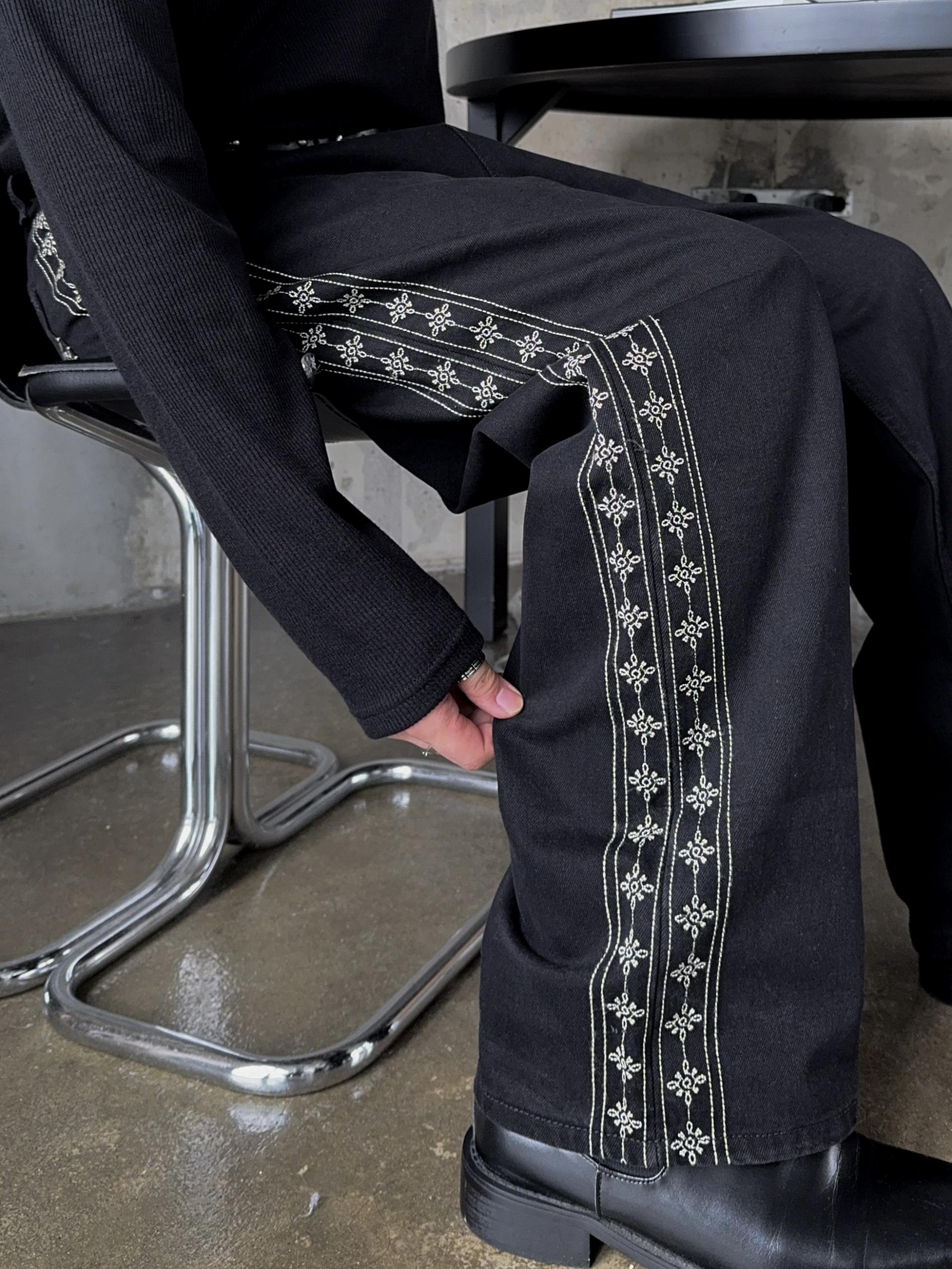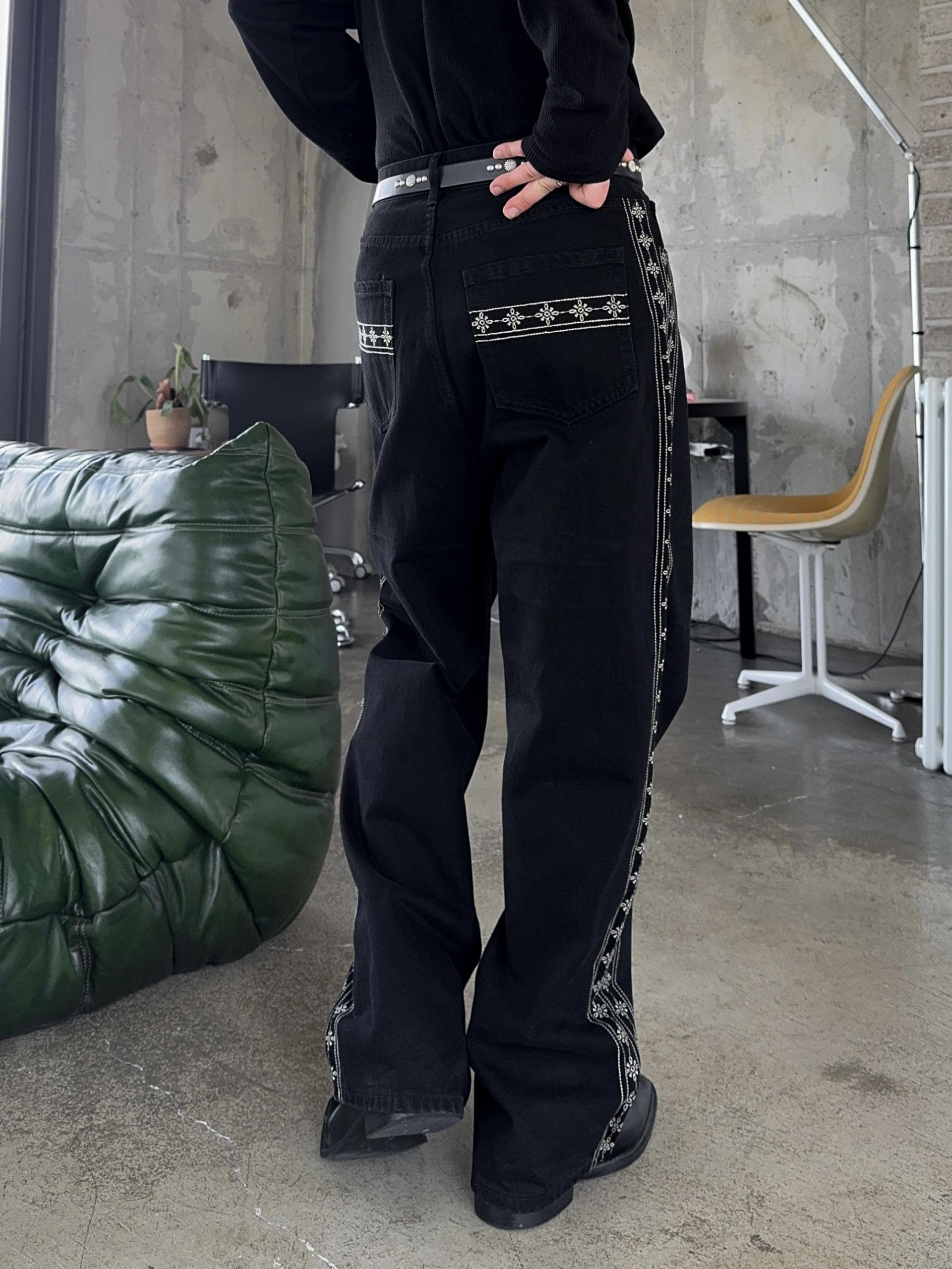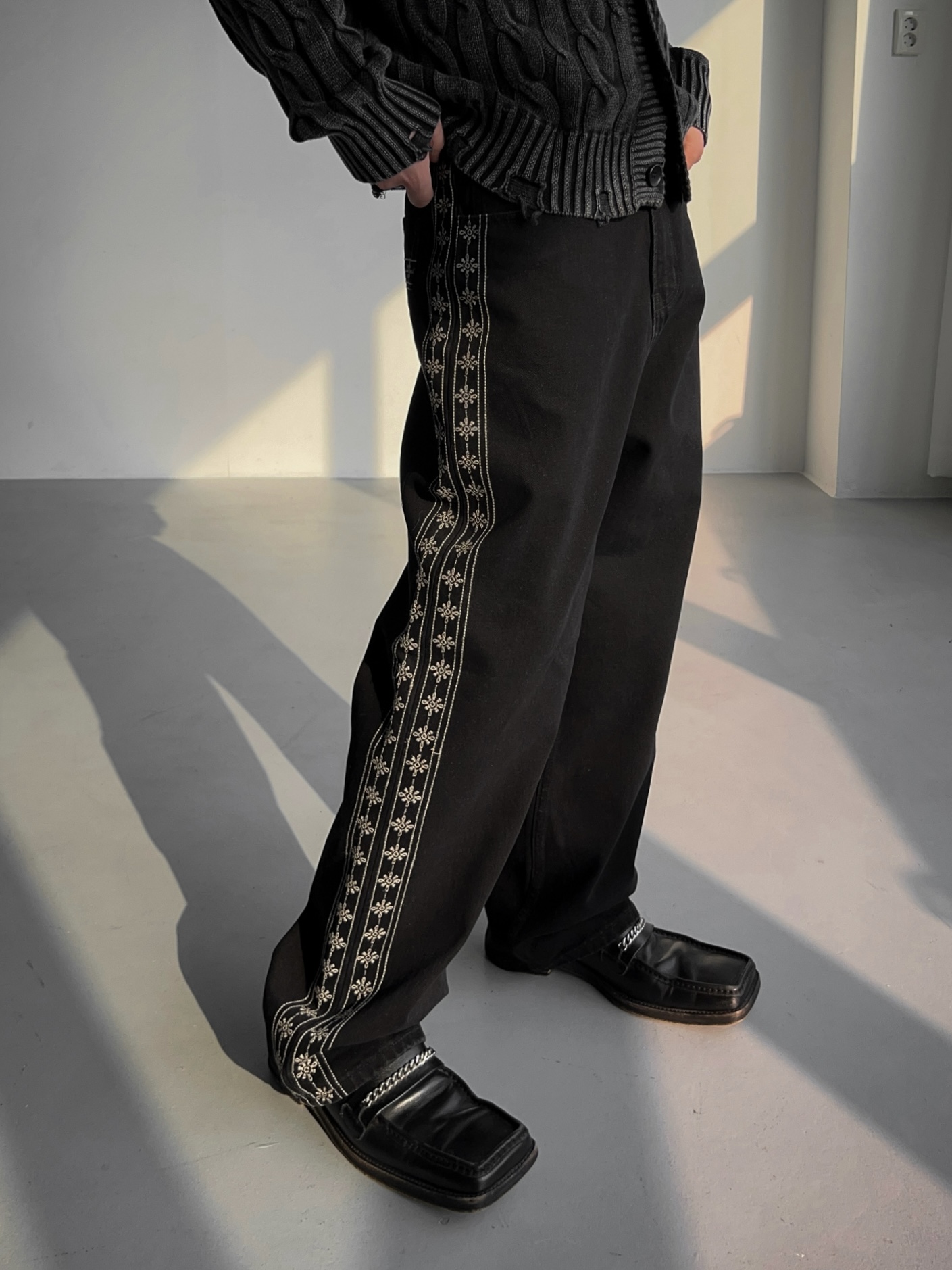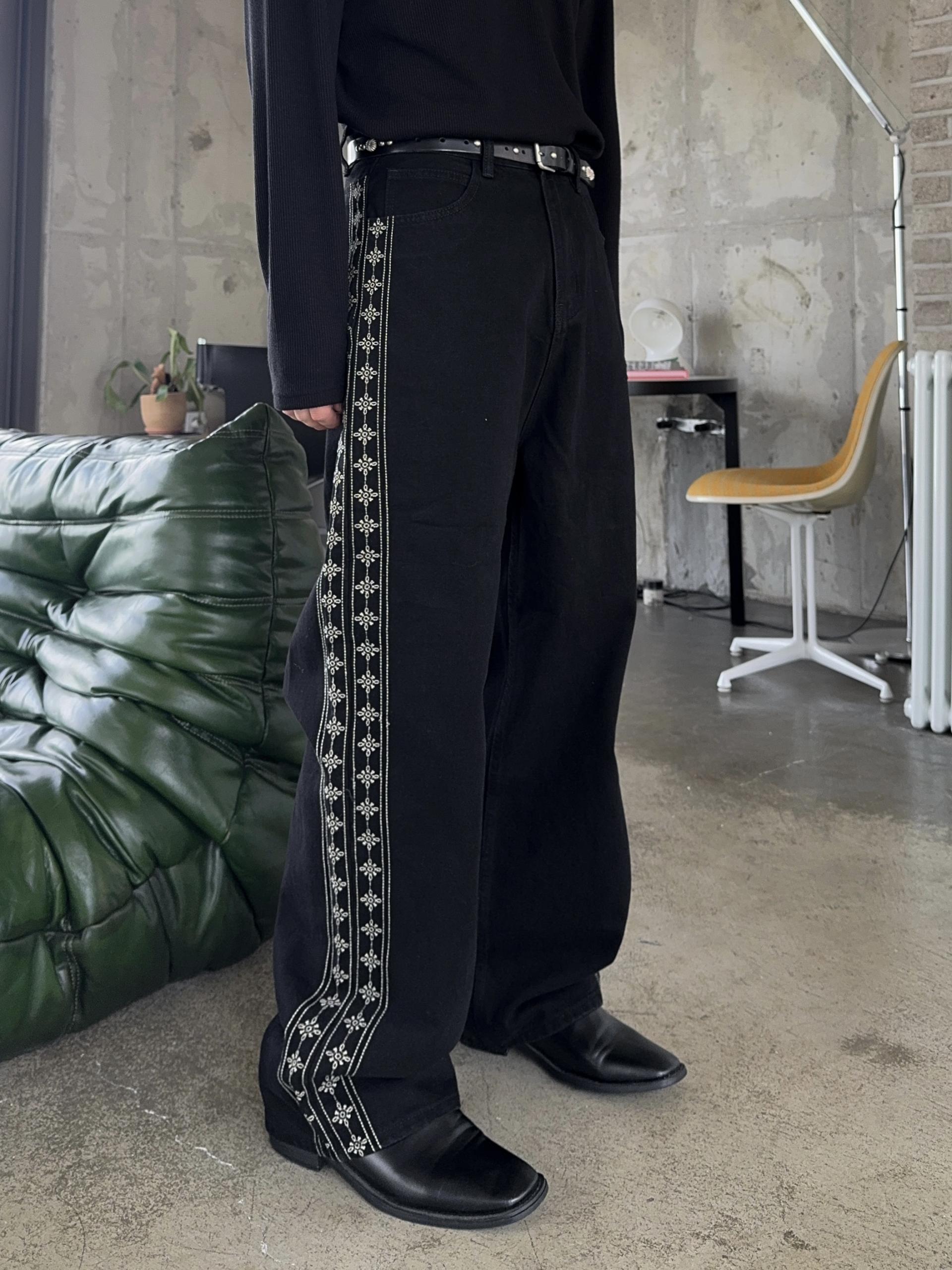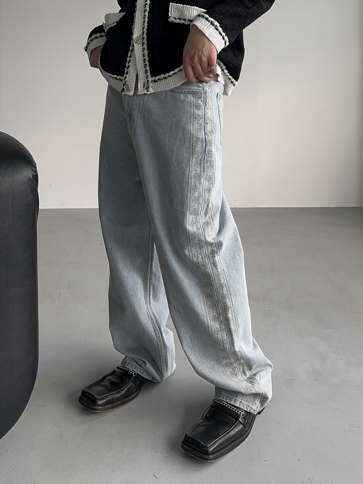 -핸드메이드 스티치 자수 포인트 디자인으로 제작된 데님 팬츠