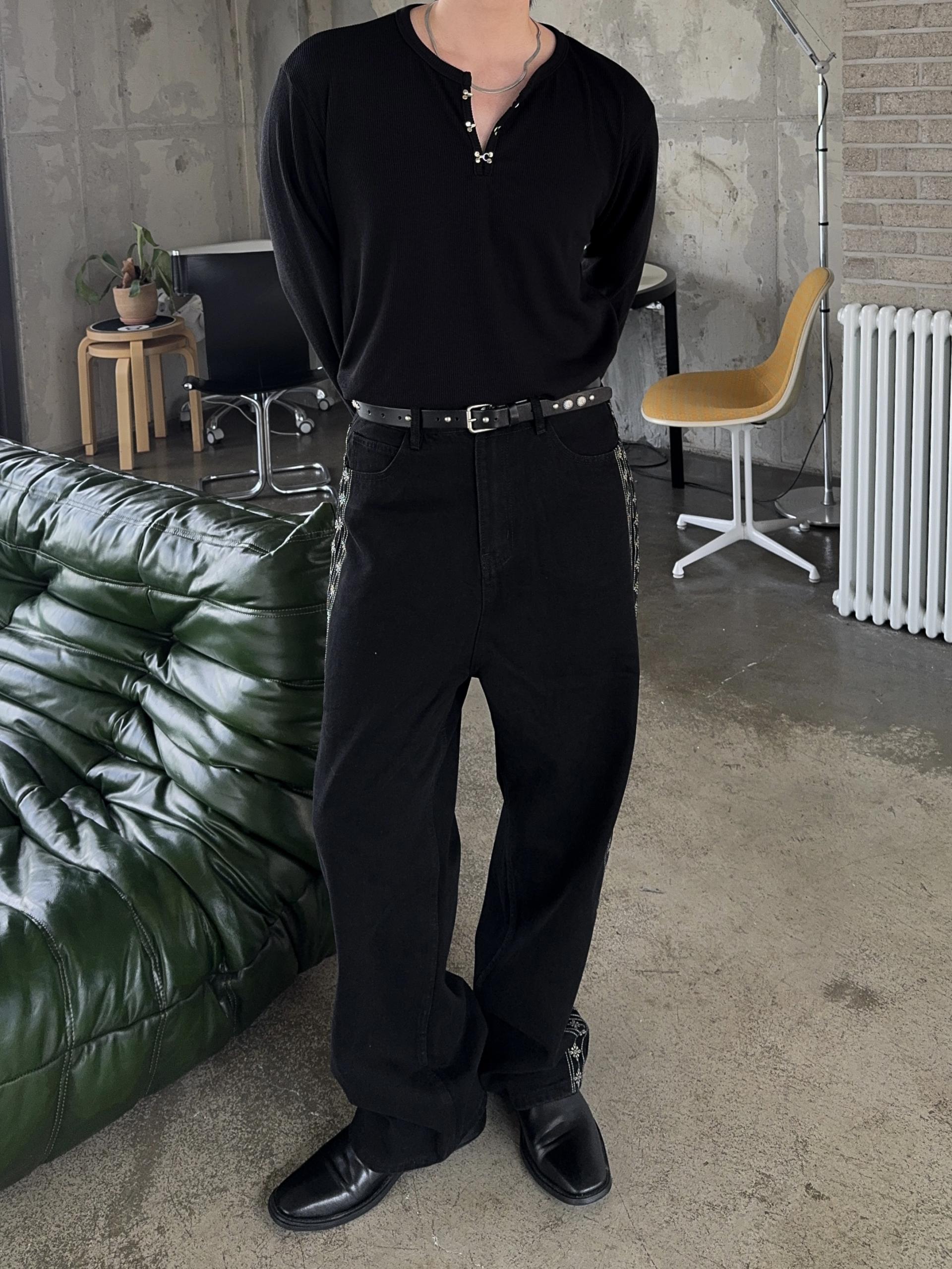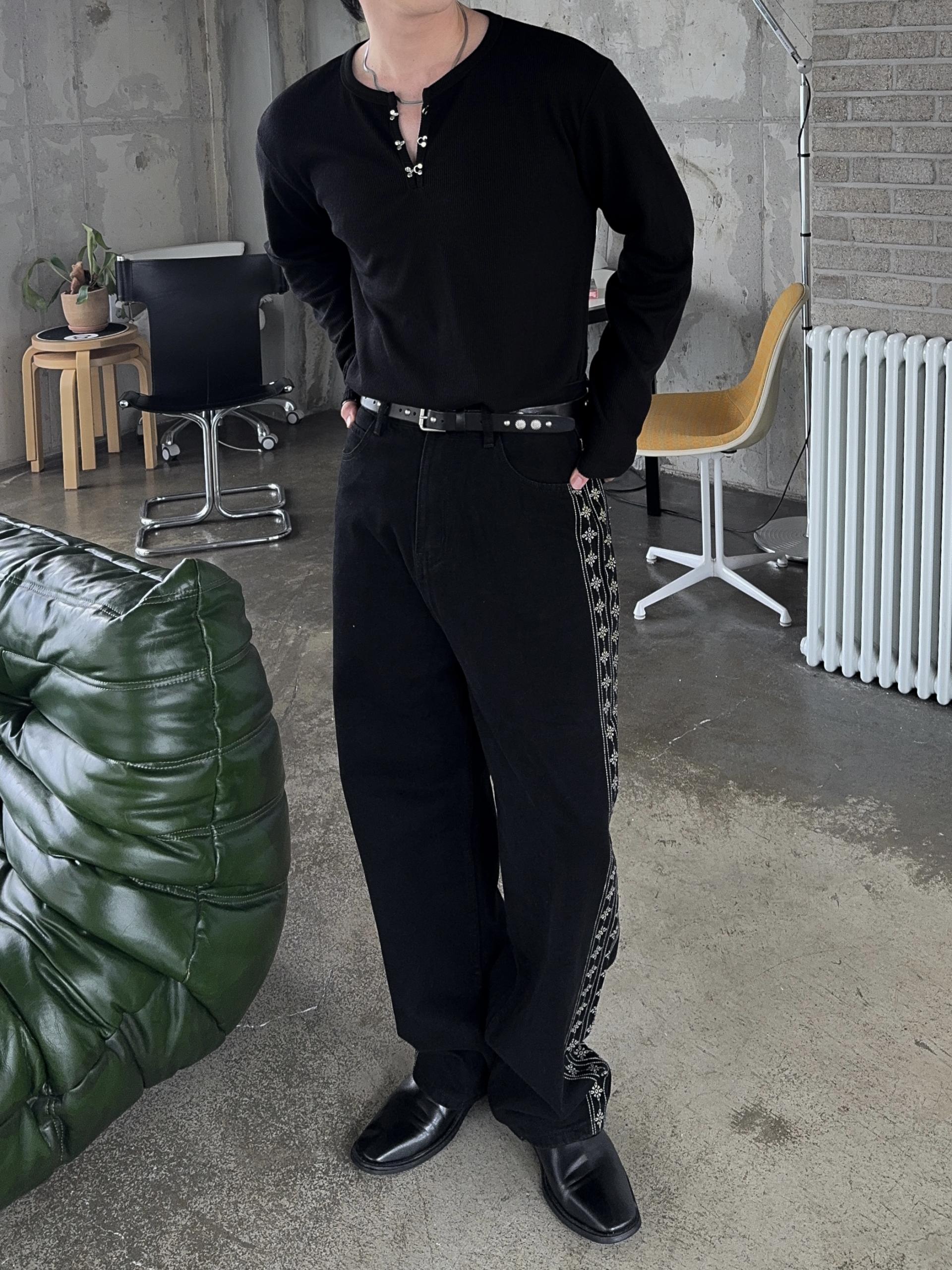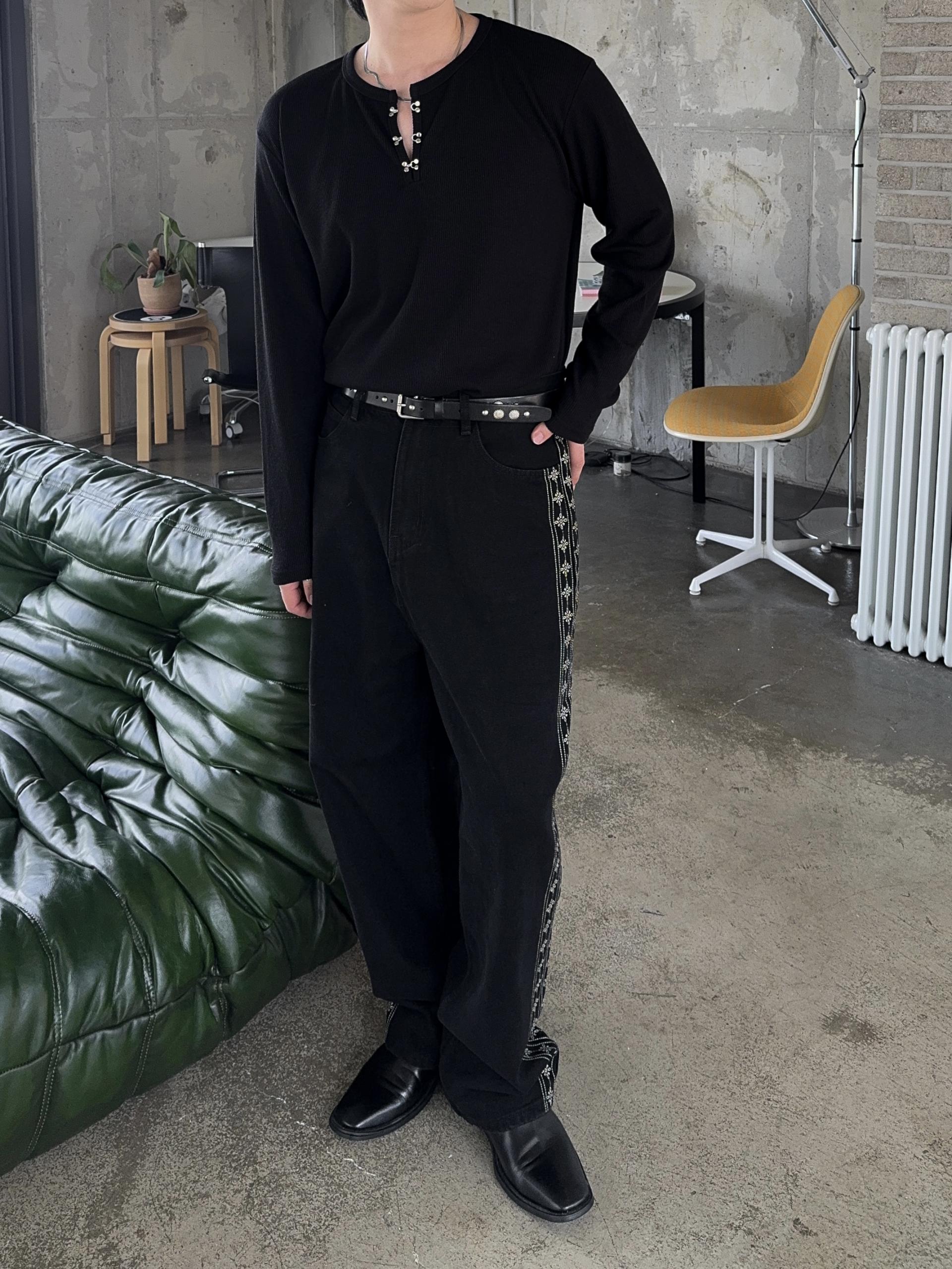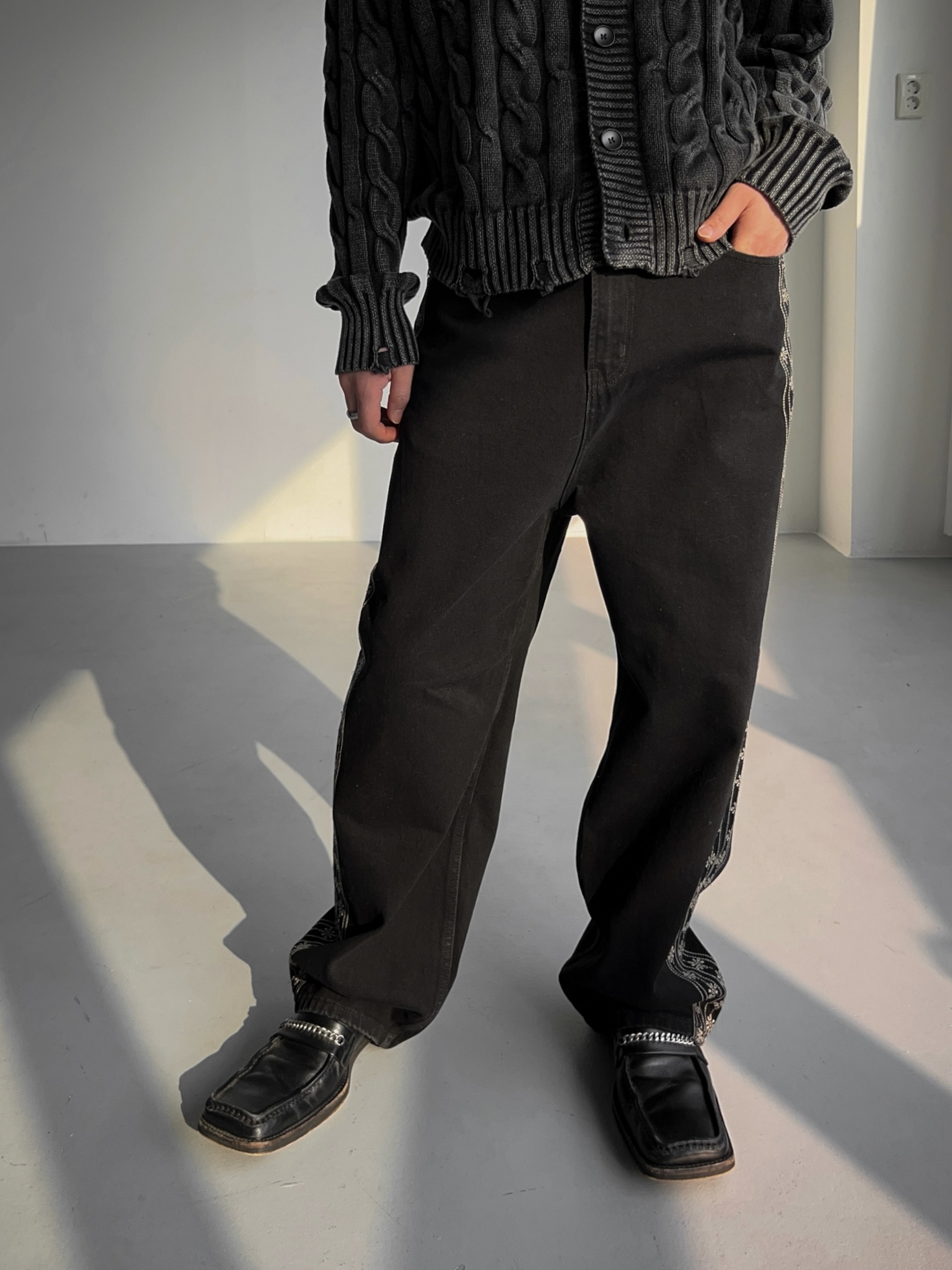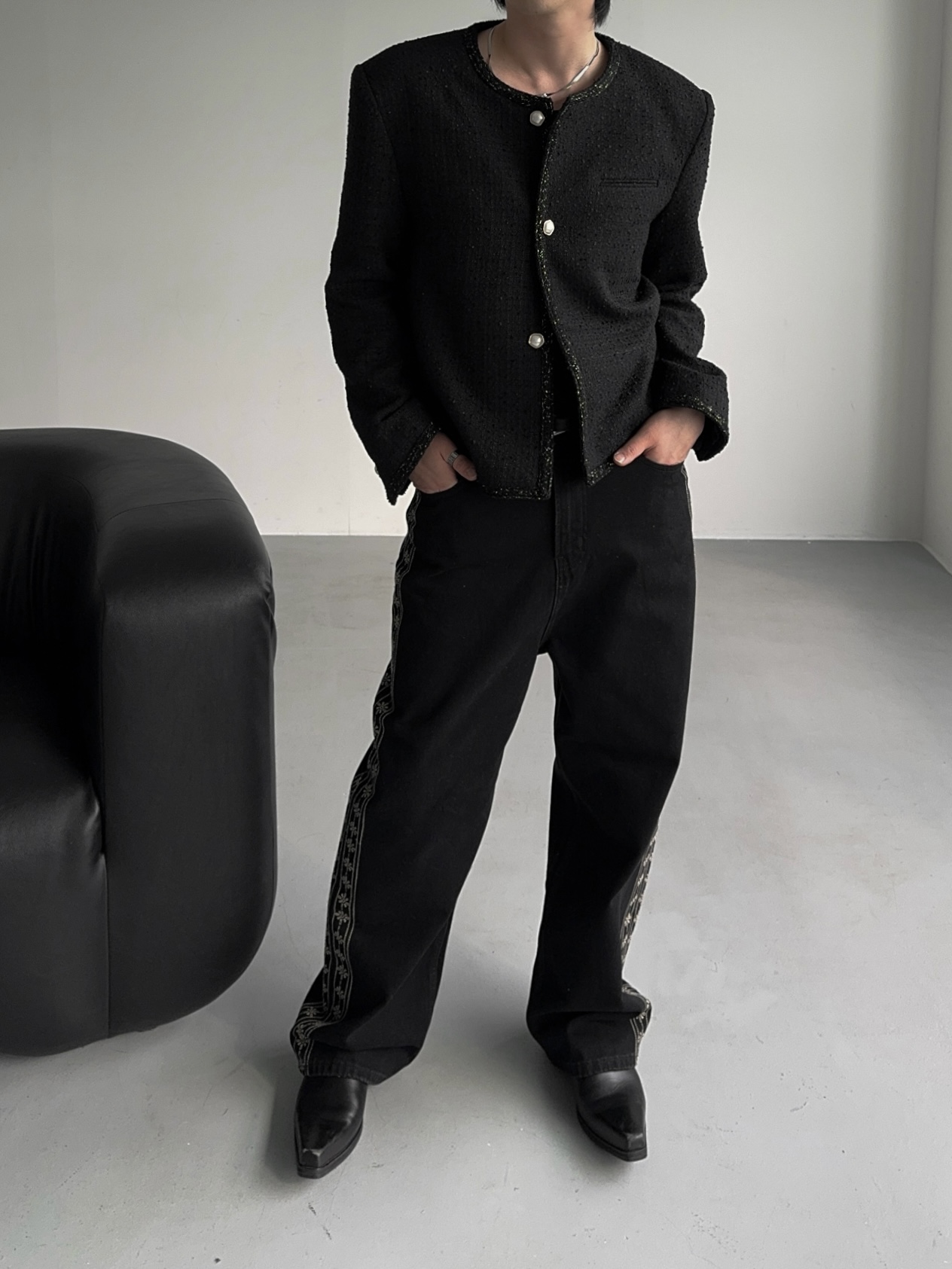 -핸드메이드 스티치 자수 포인트 디자인으로 제작된 데님 팬츠