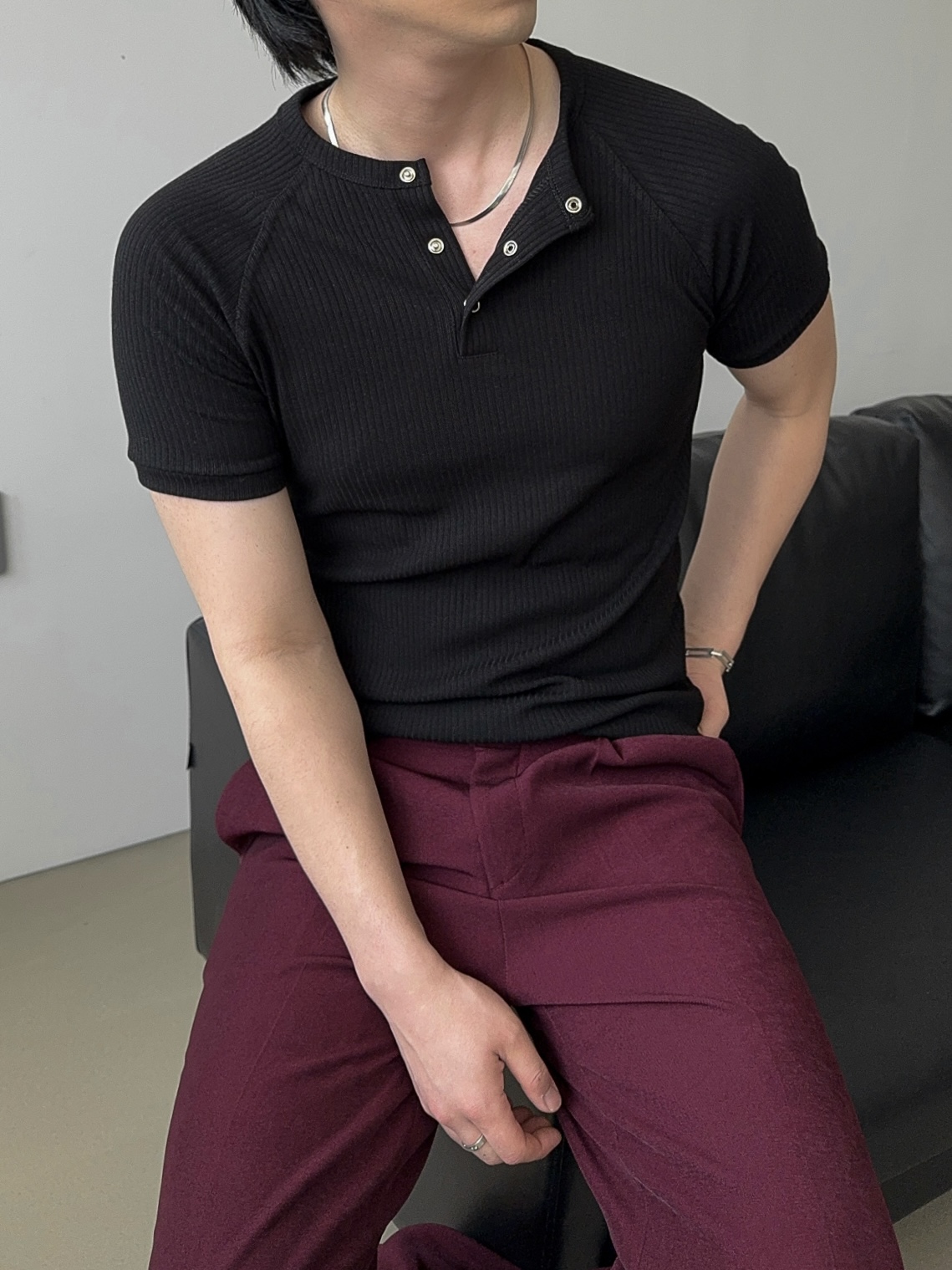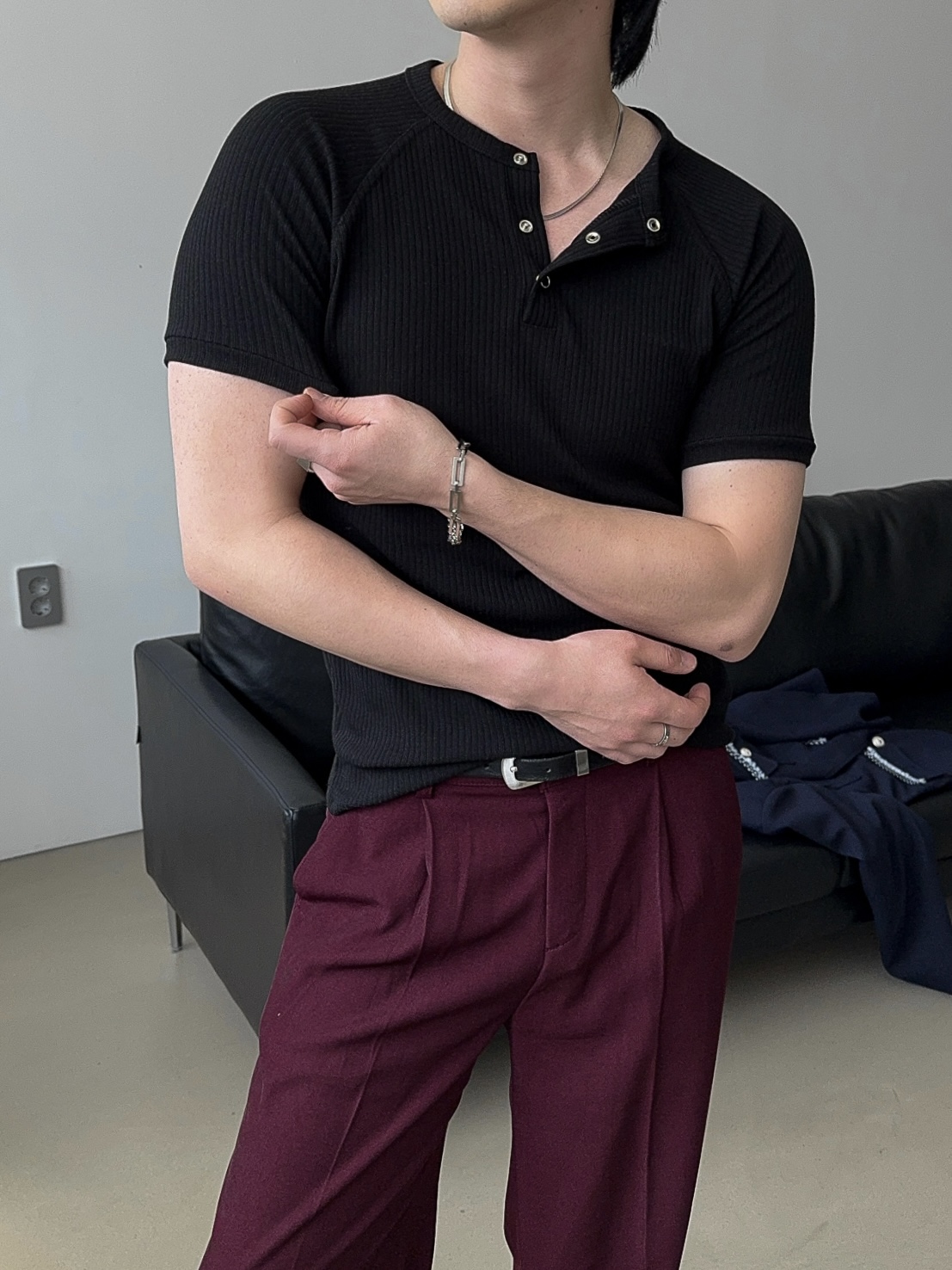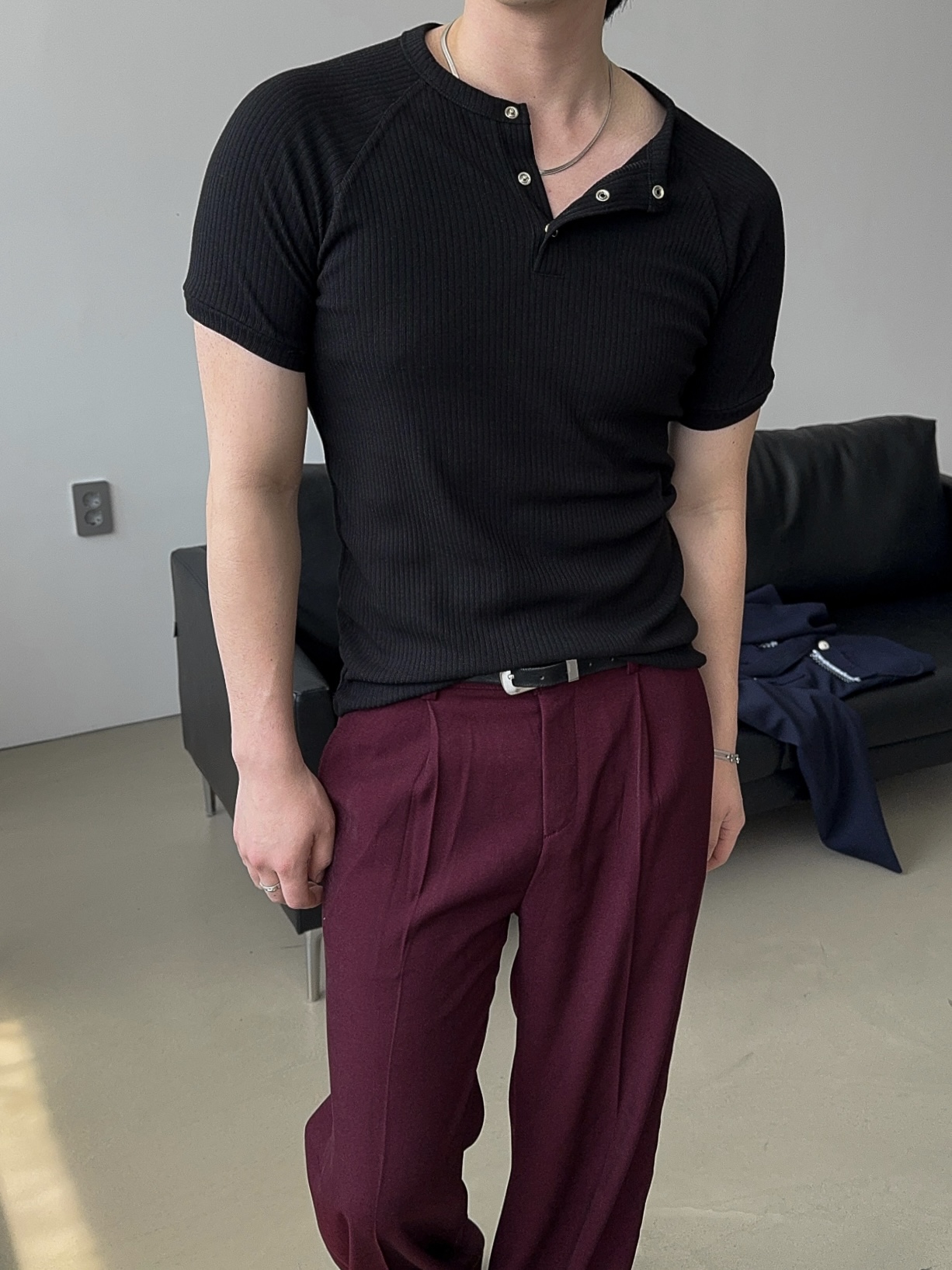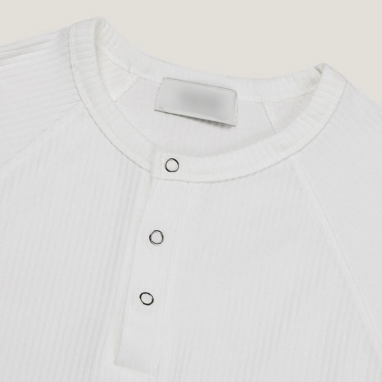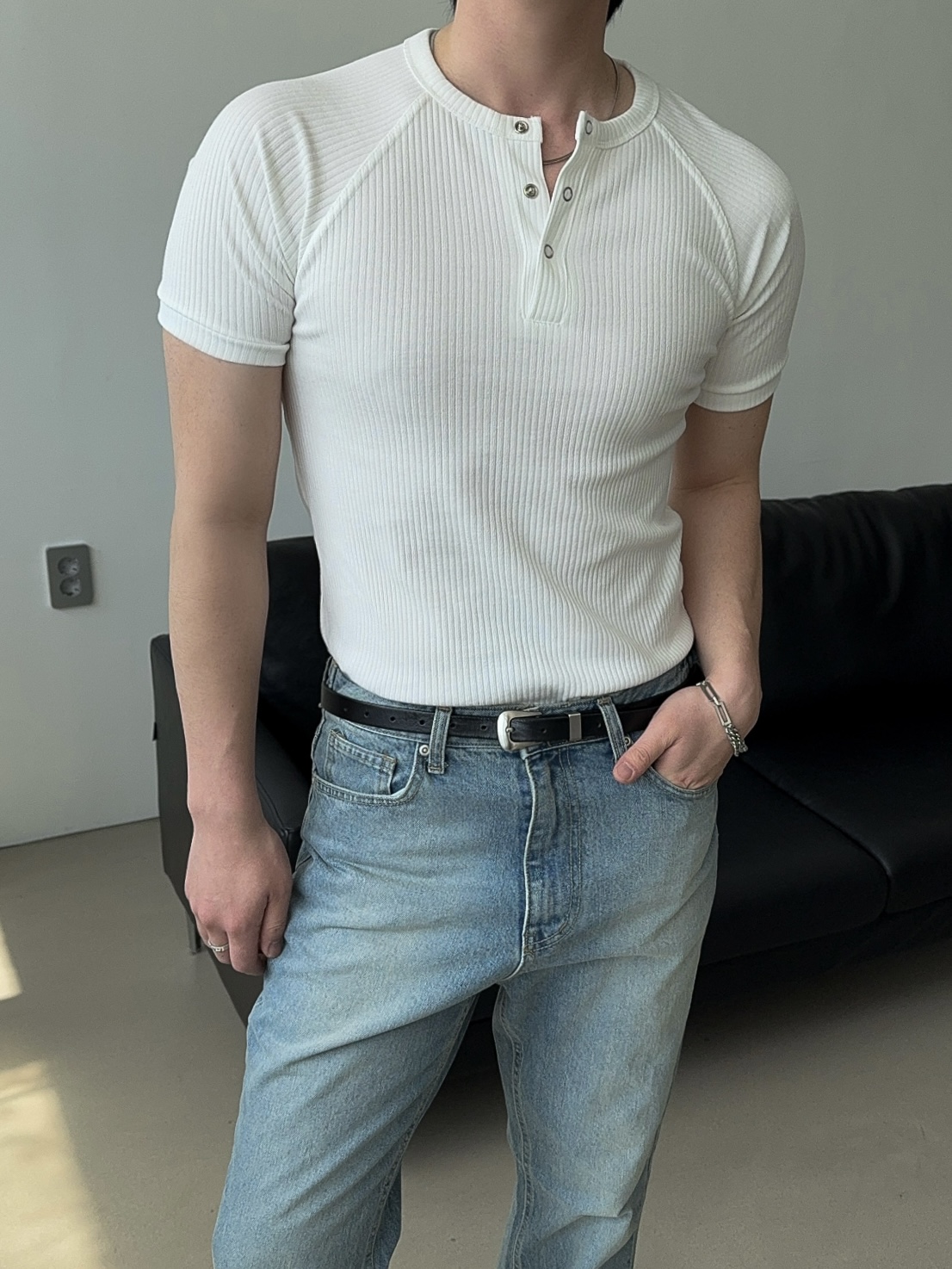 -쫀쫀한 골지 소재로 제작된 슬림 헨리넥 티셔츠