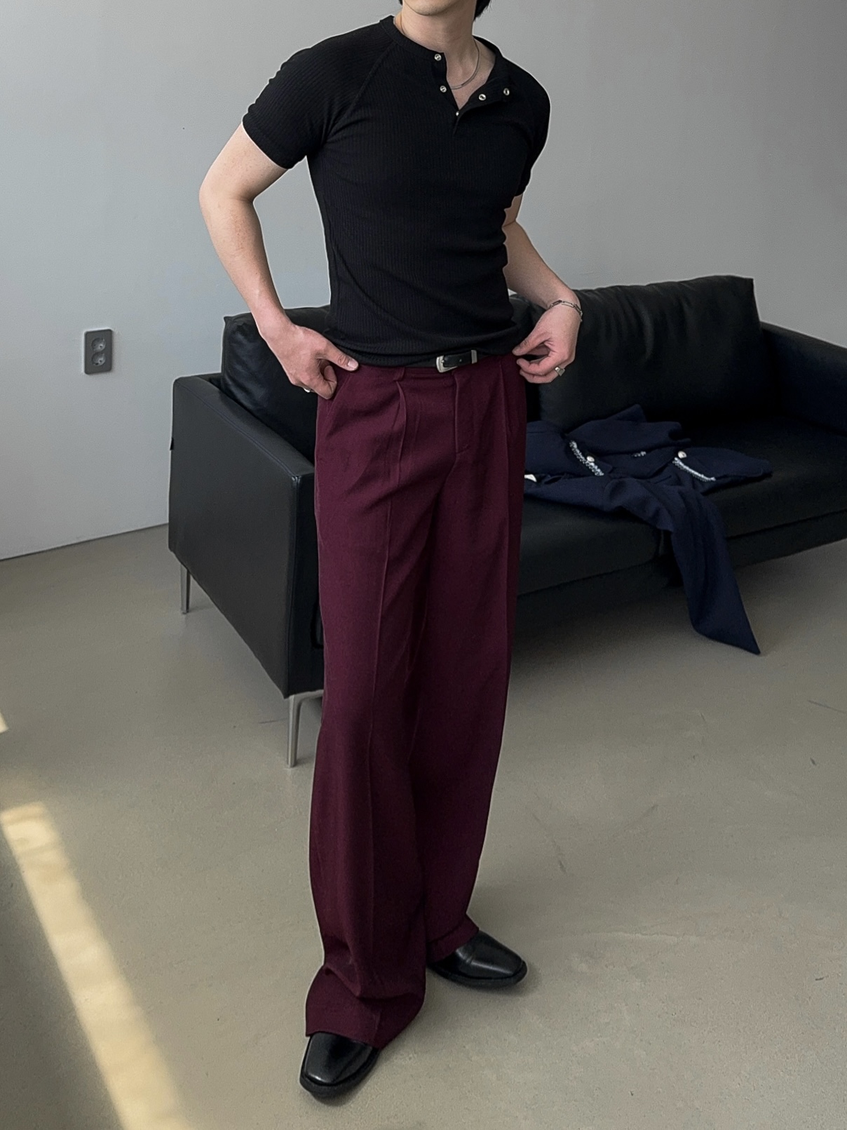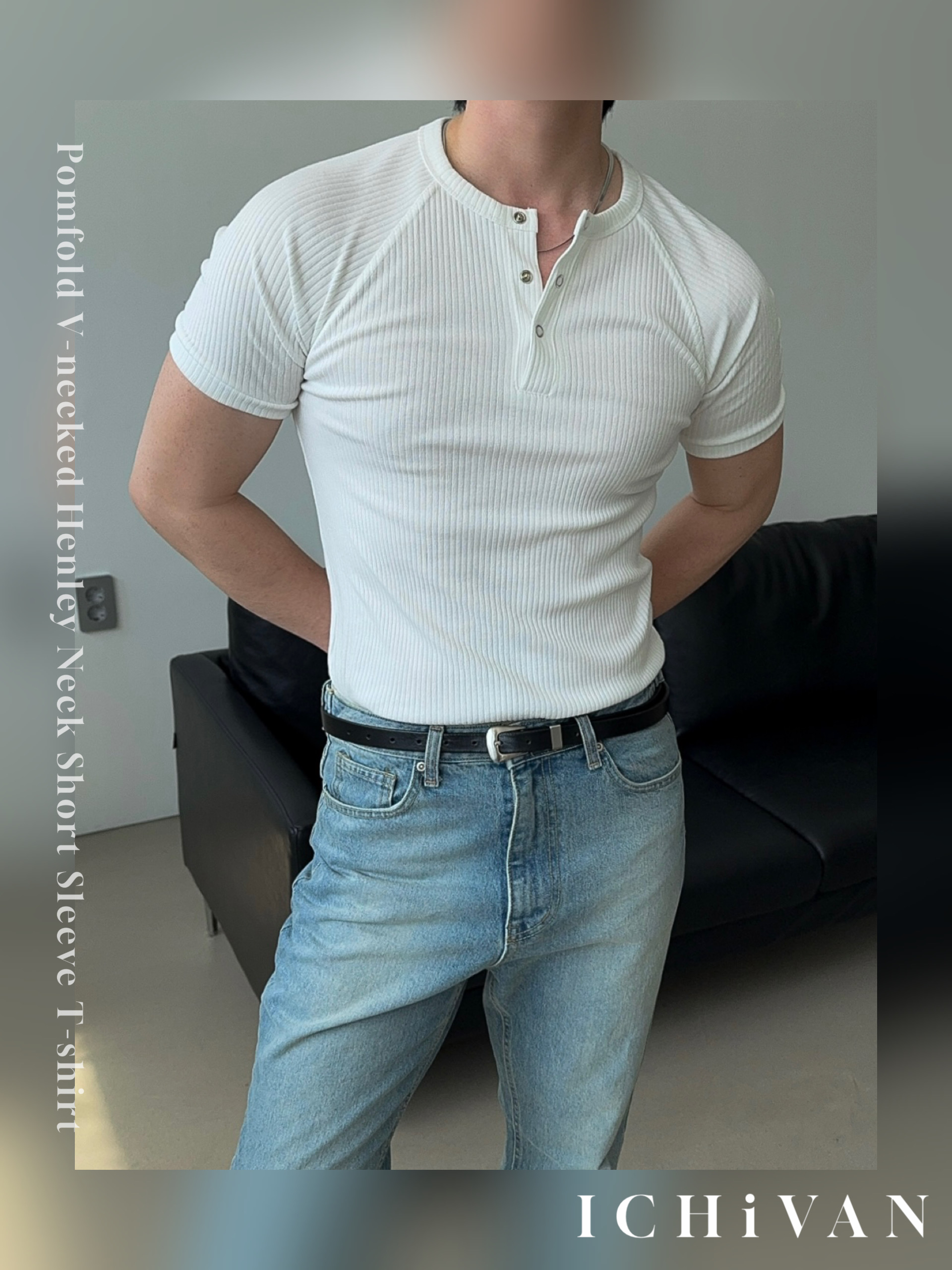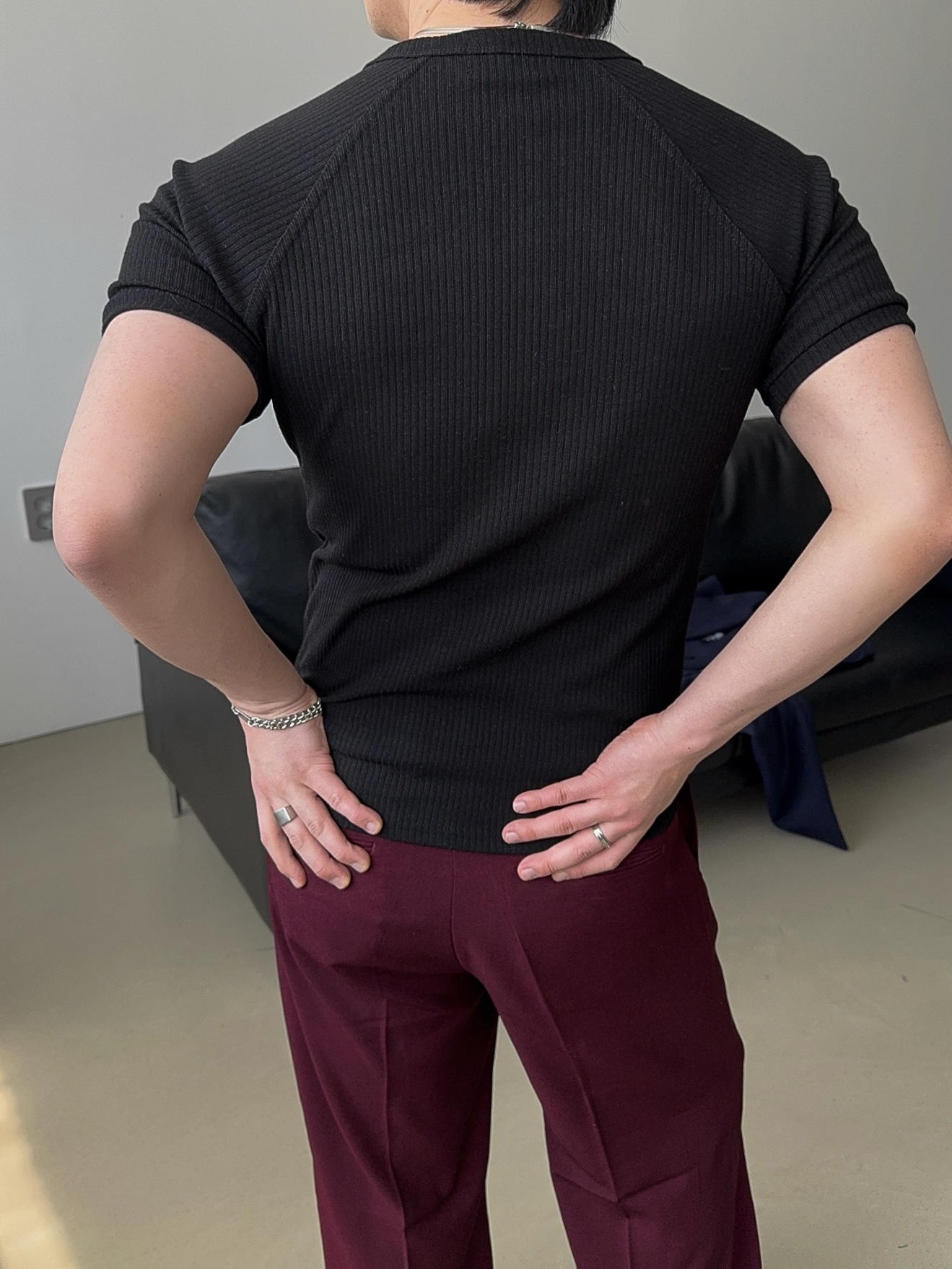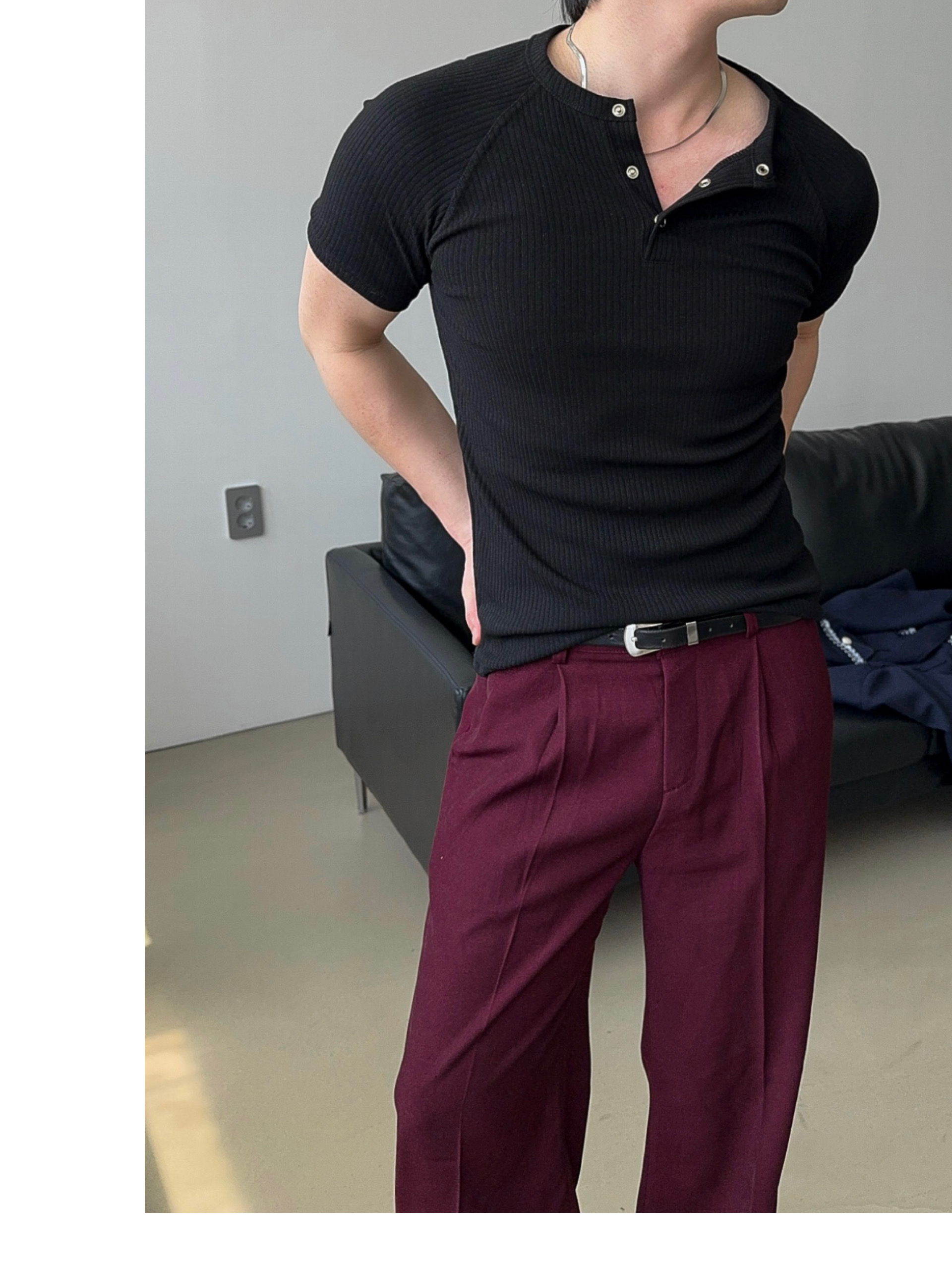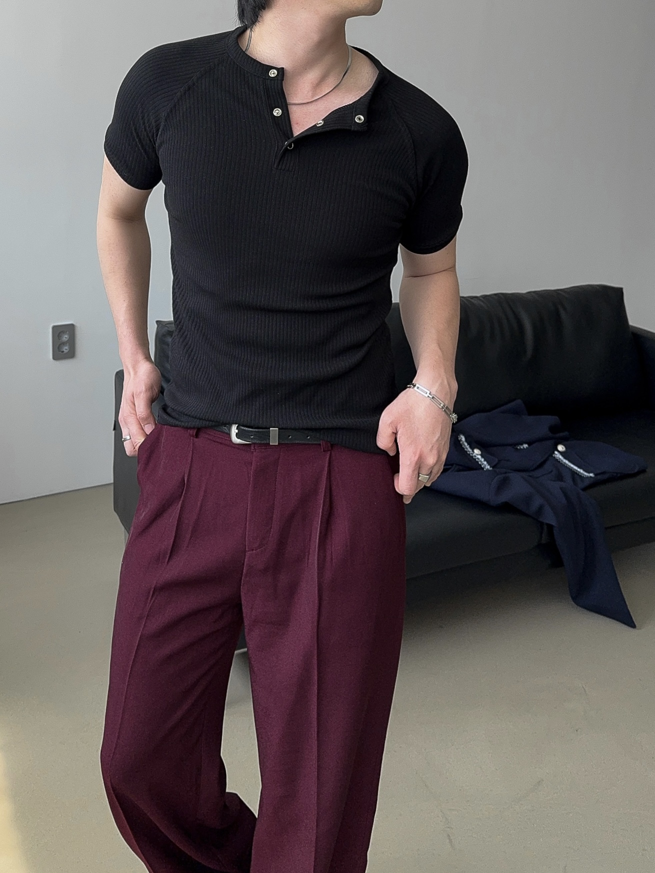 -쫀쫀한 골지 소재로 제작된 슬림 헨리넥 티셔츠