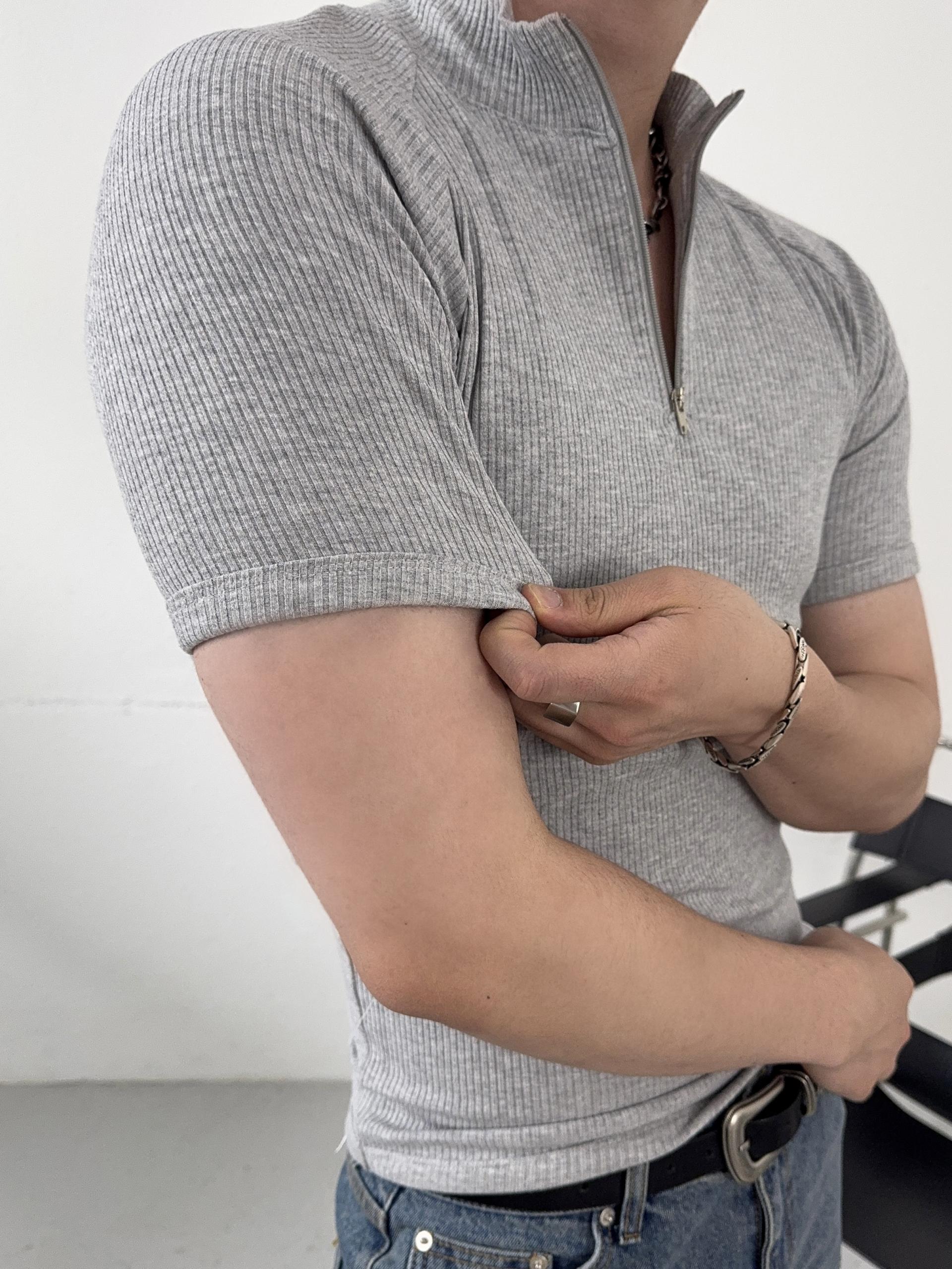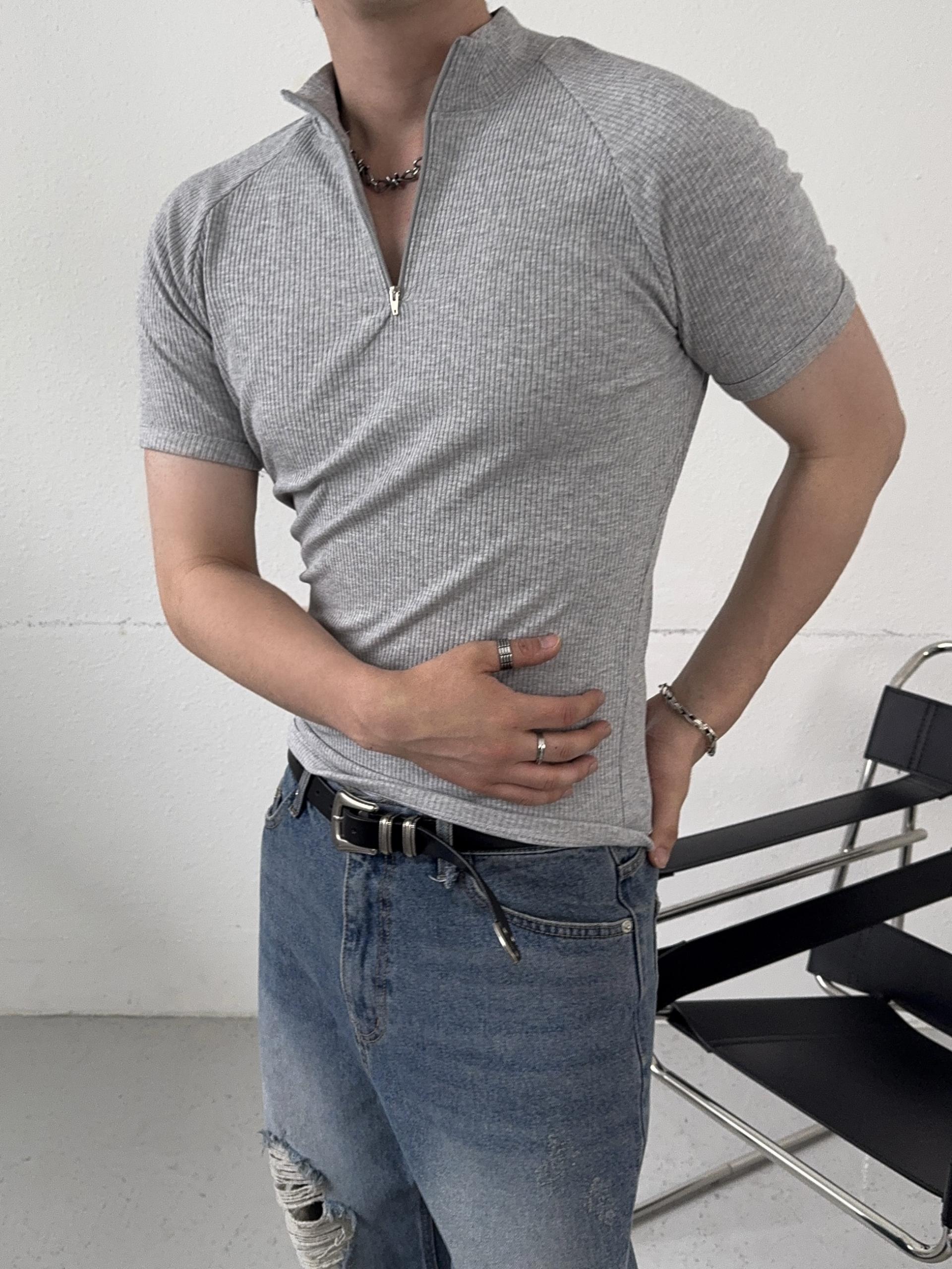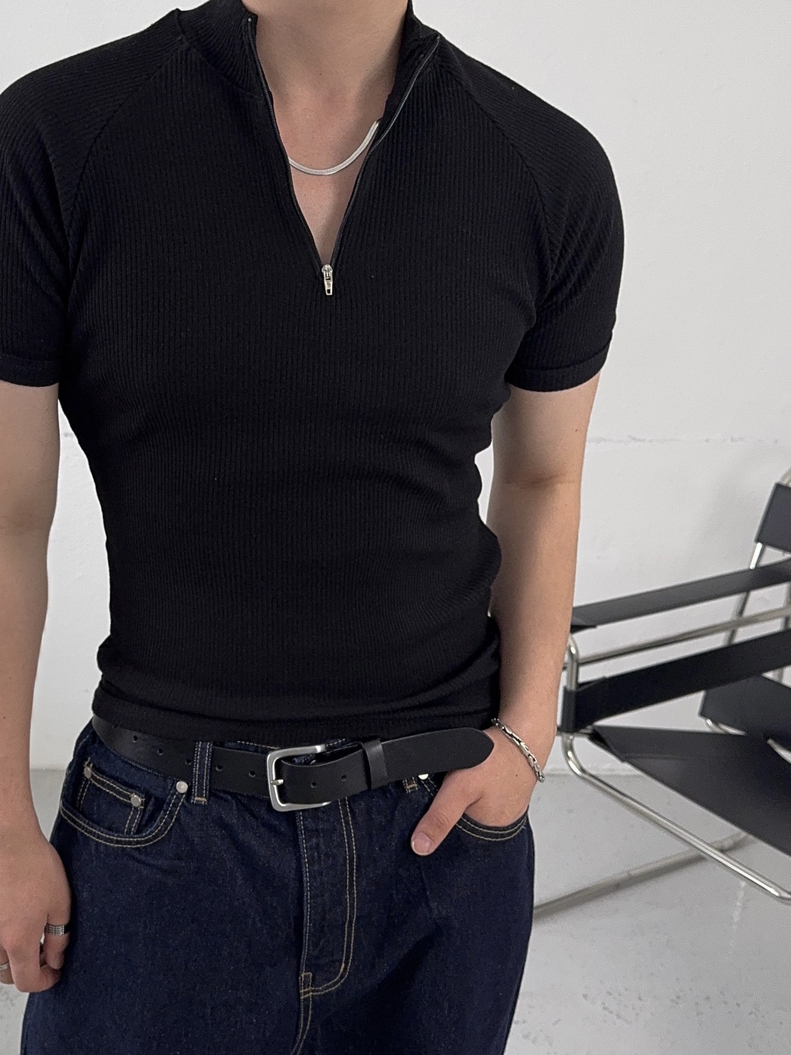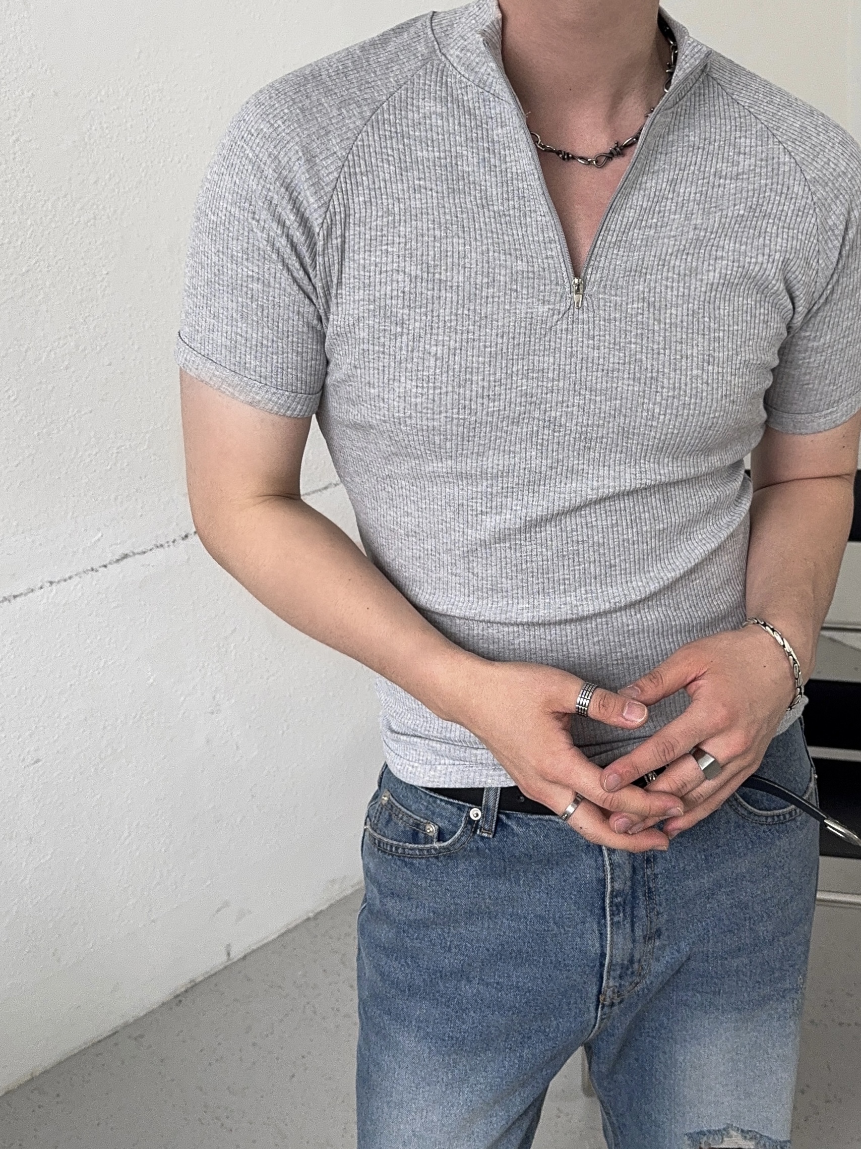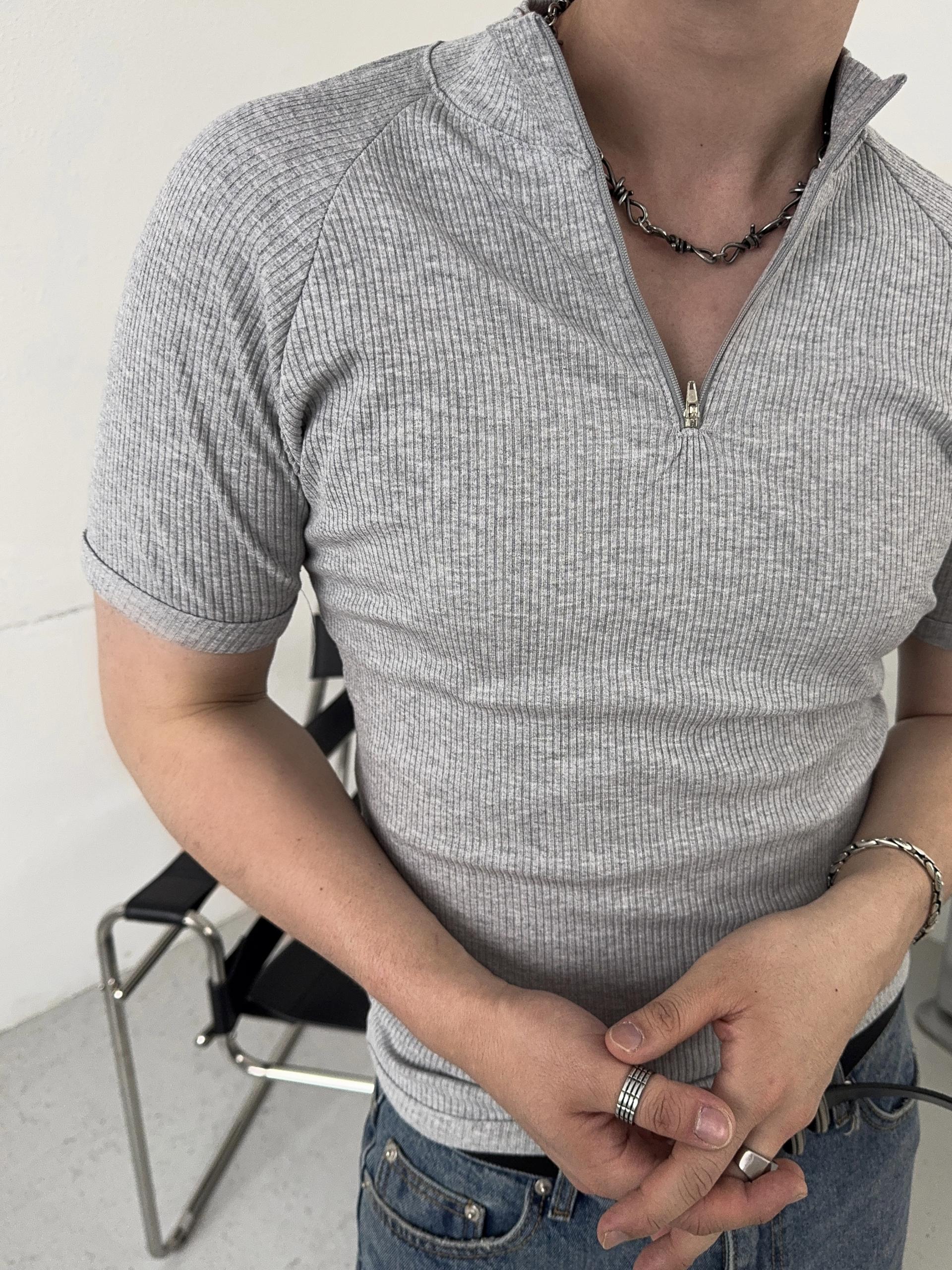-신축성이 좋은 골지 소재로 제작된 슬림한 실루엣의 반집업 티셔츠
