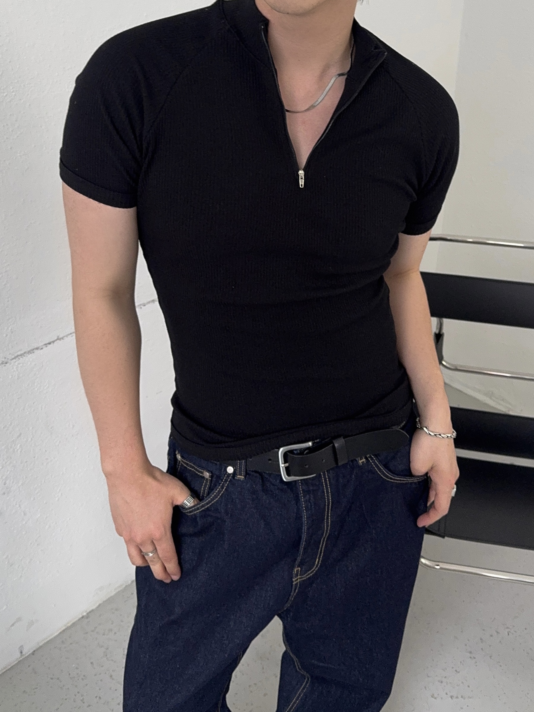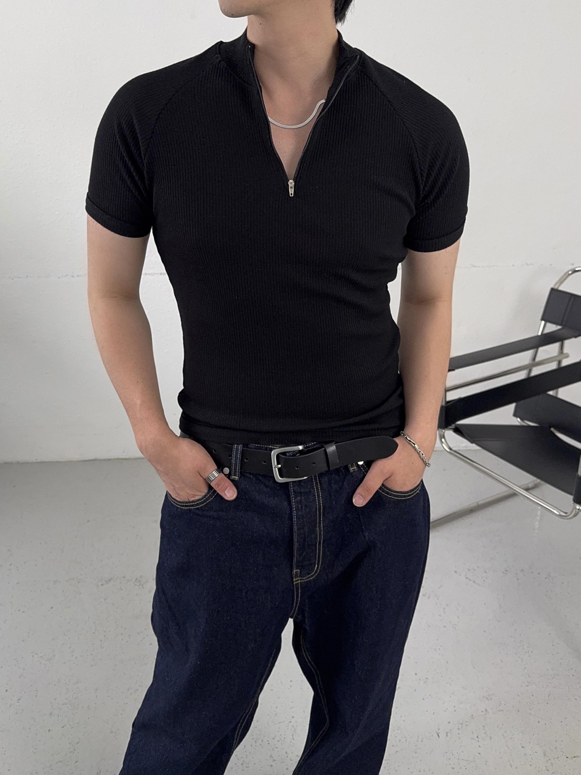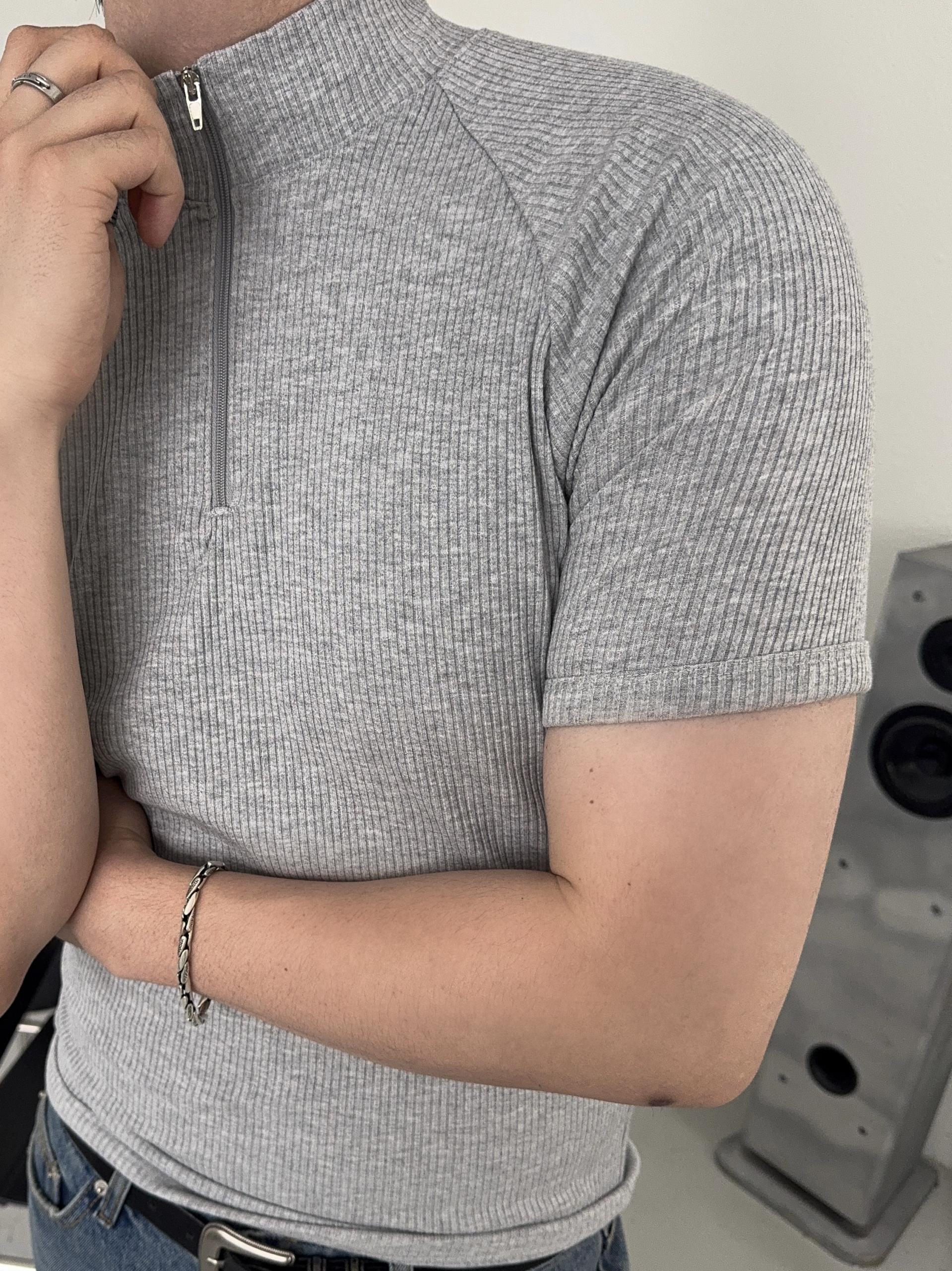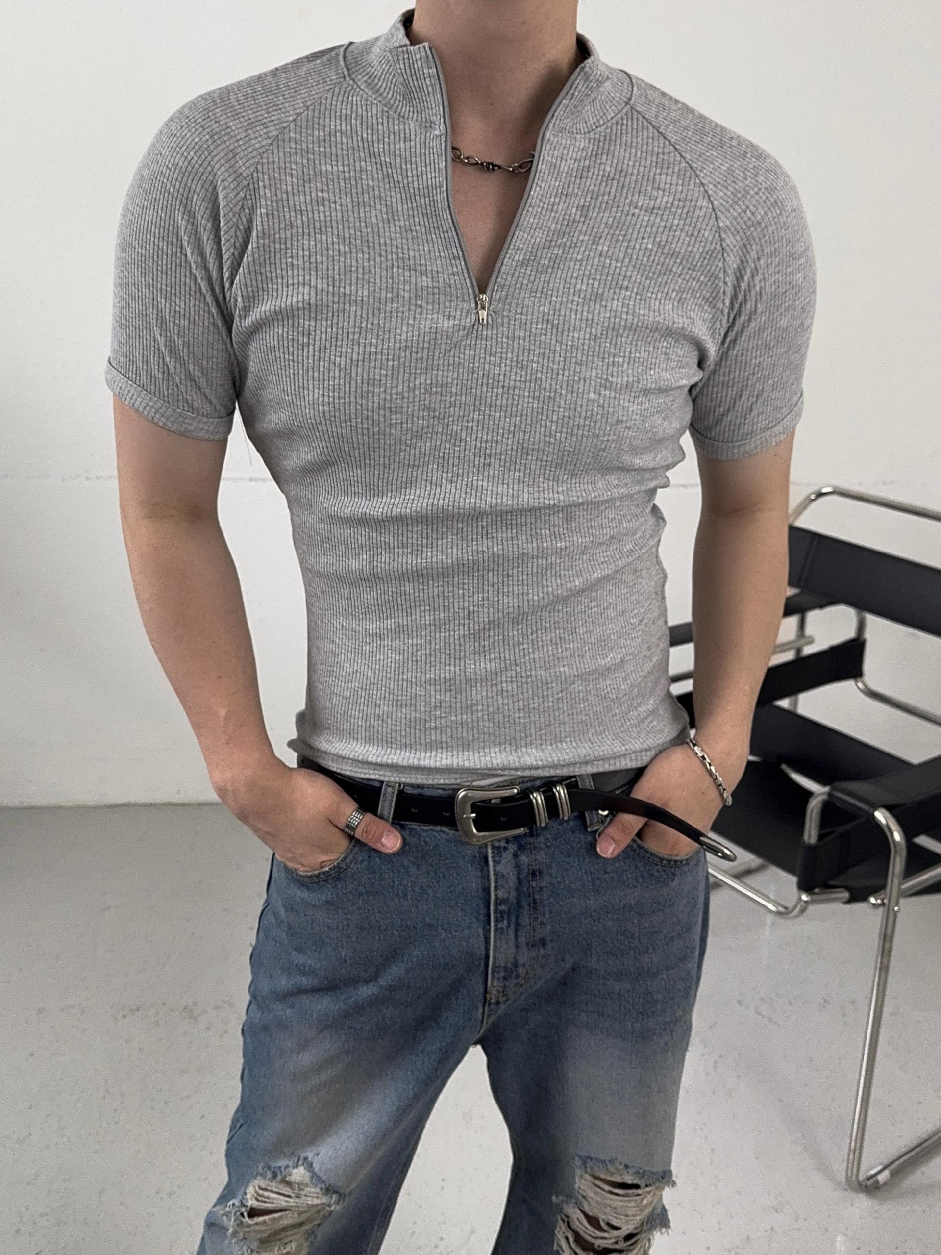 -신축성이 좋은 골지 소재로 제작된 슬림한 실루엣의 반집업 티셔츠