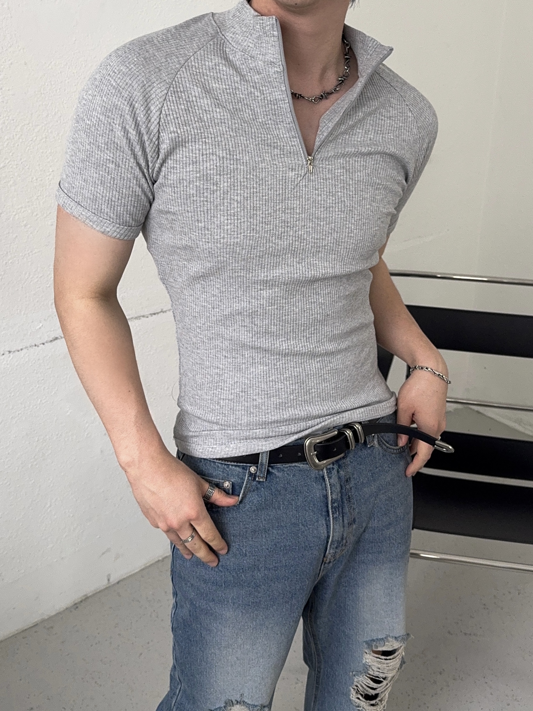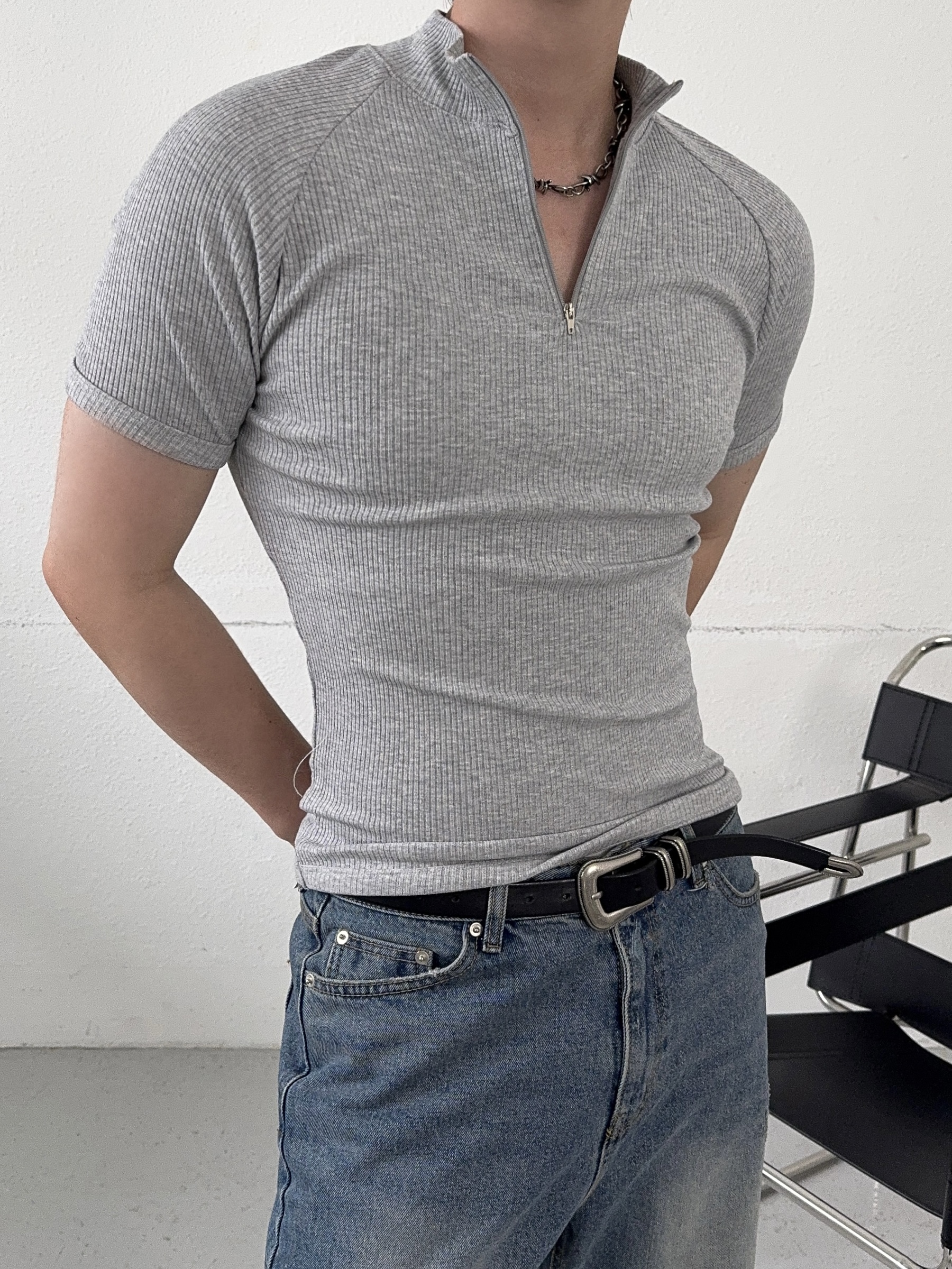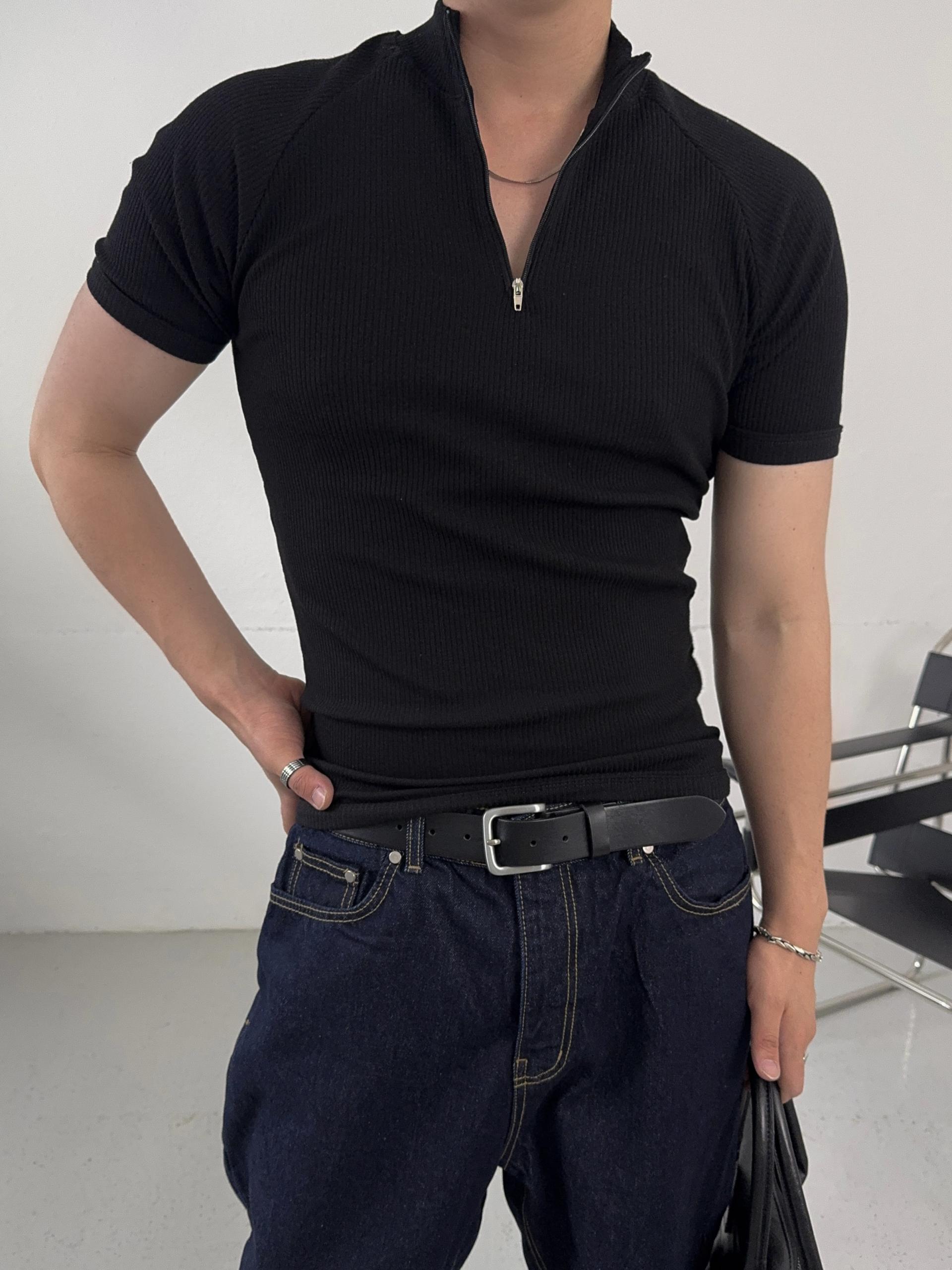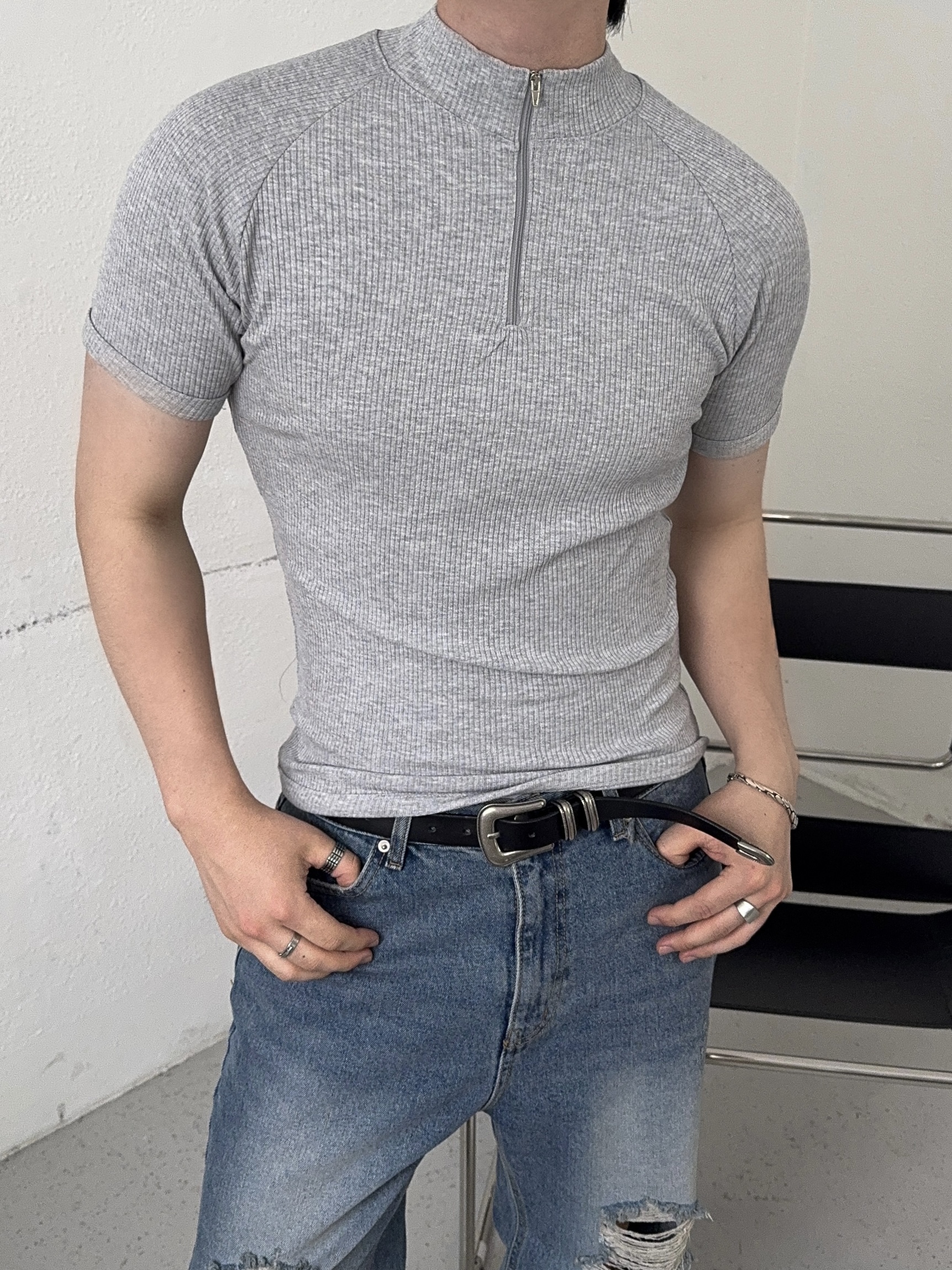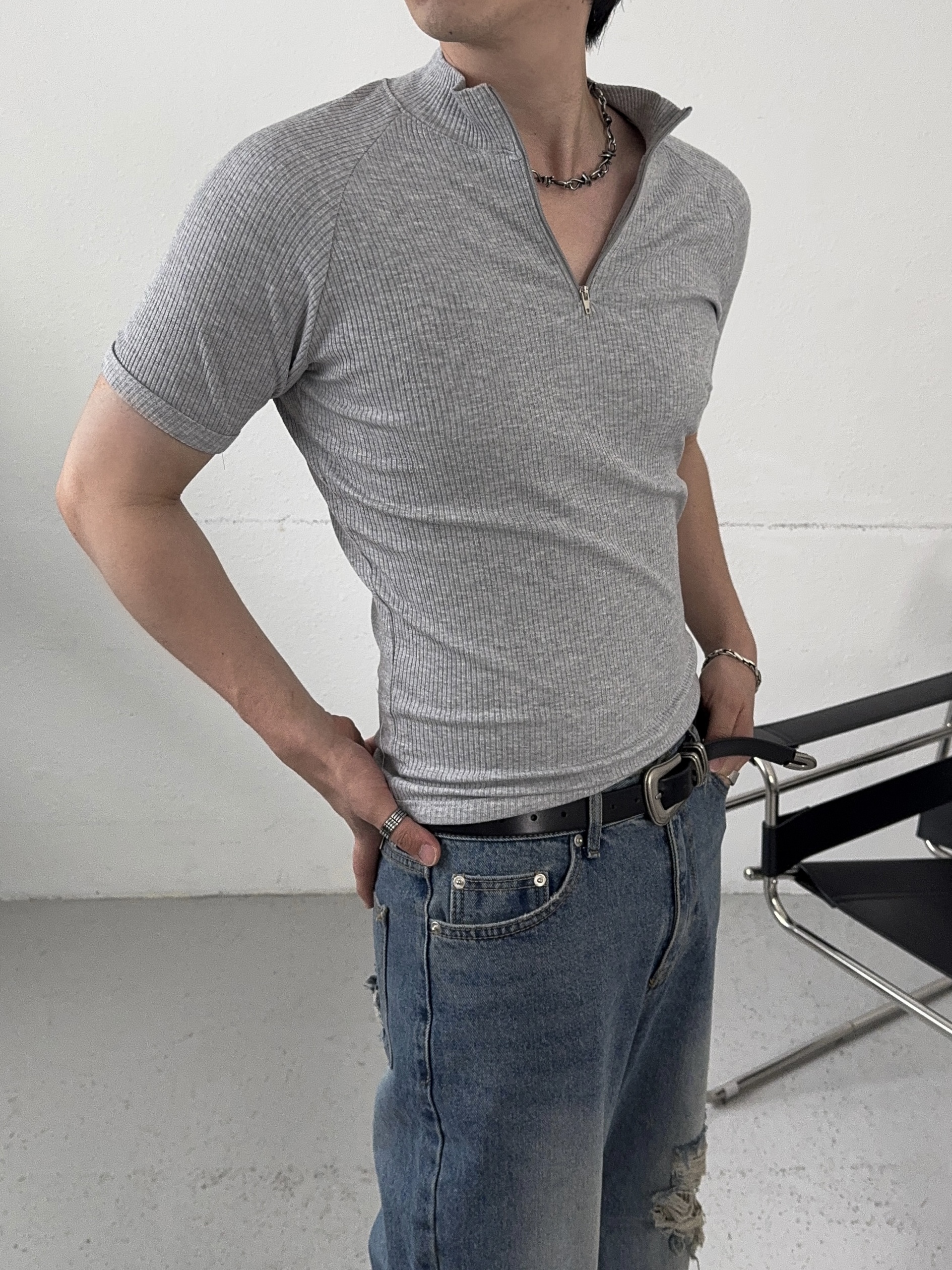 -신축성이 좋은 골지 소재로 제작된 슬림한 실루엣의 반집업 티셔츠
