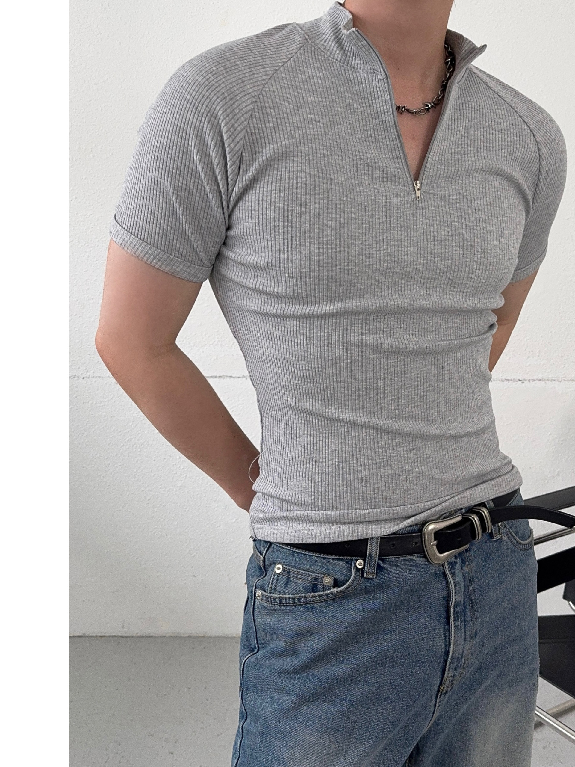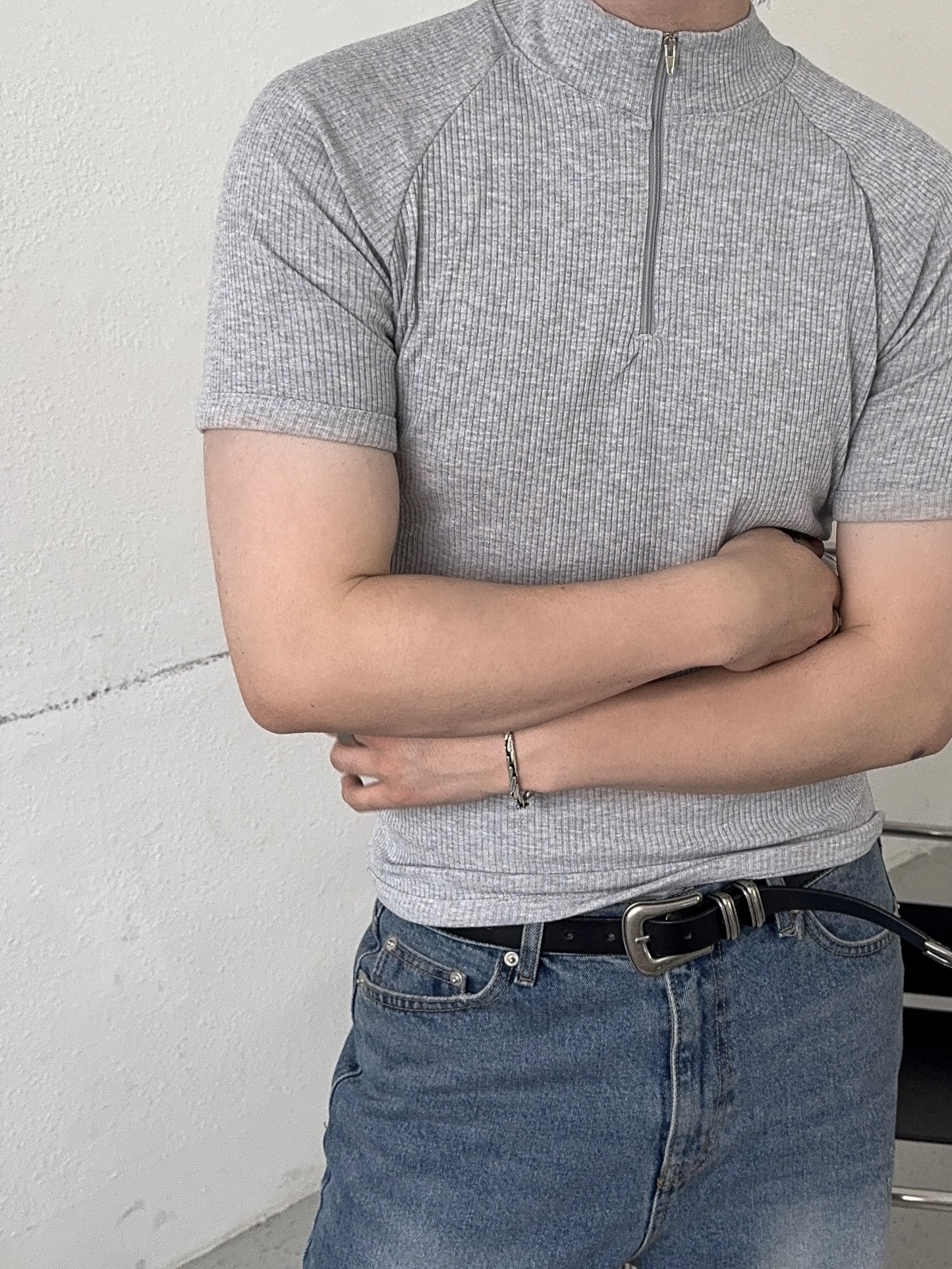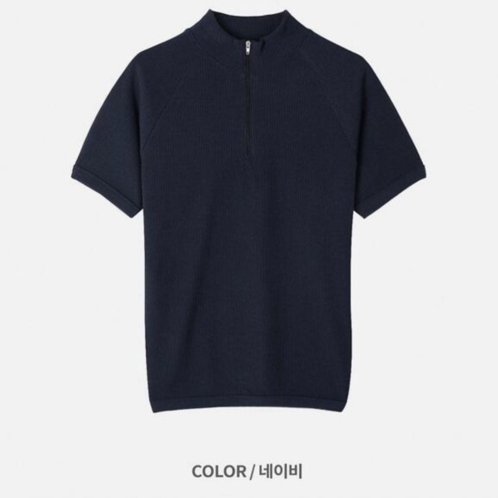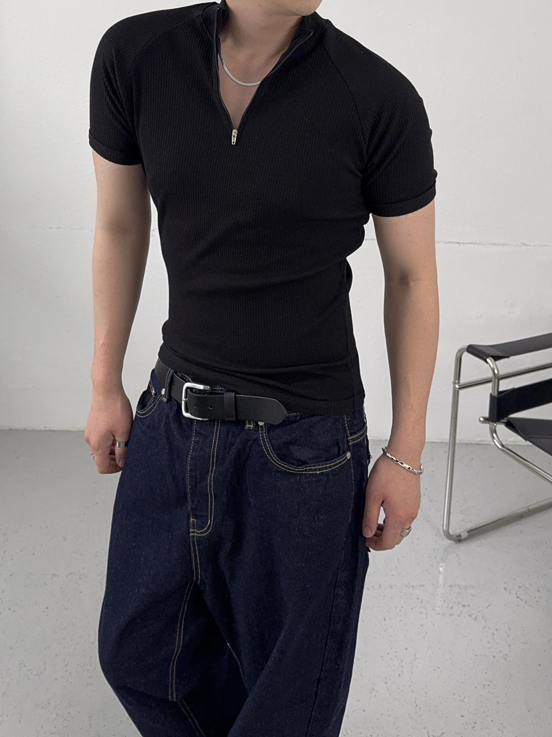 -신축성이 좋은 골지 소재로 제작된 슬림한 실루엣의 반집업 티셔츠
