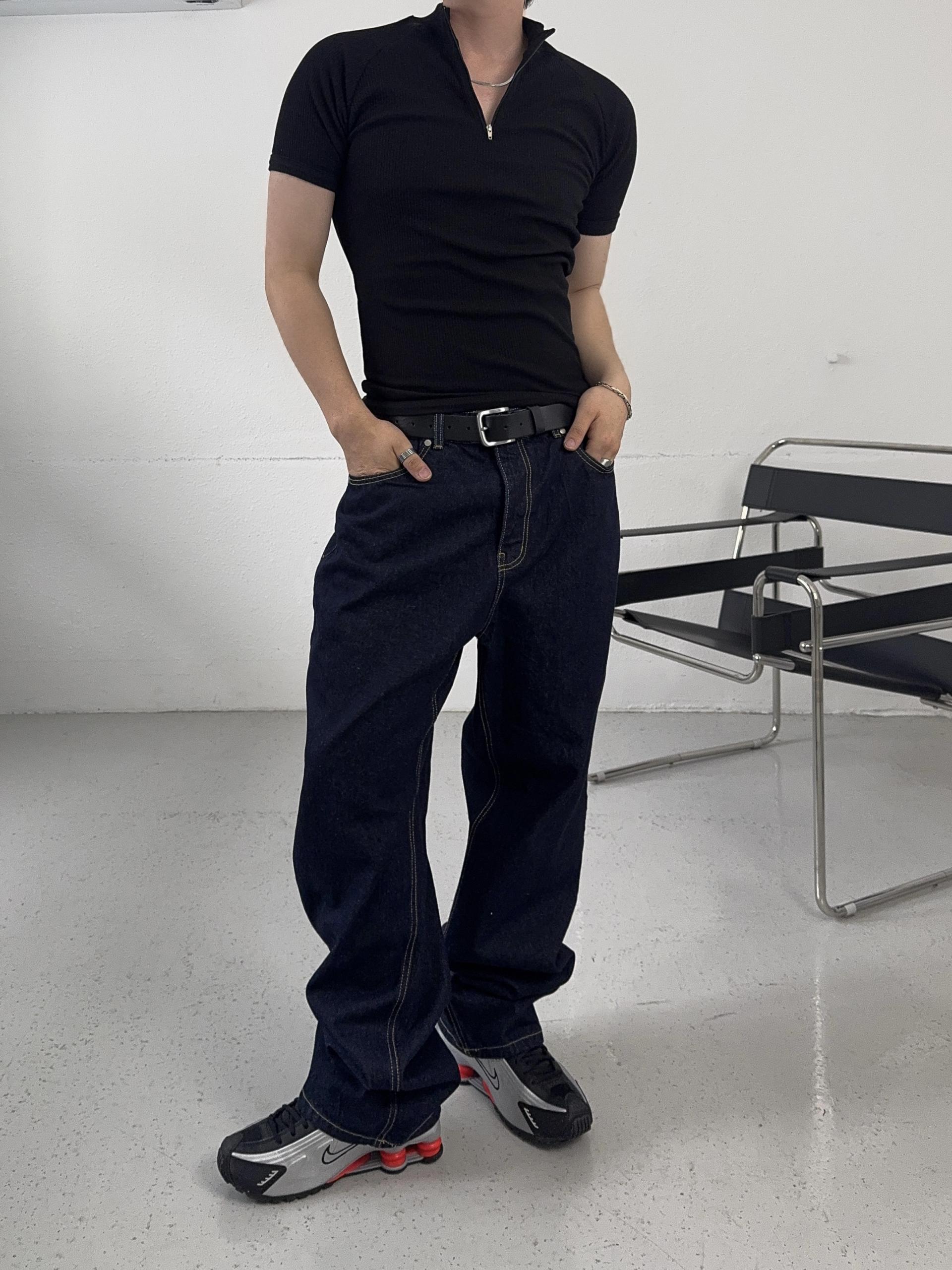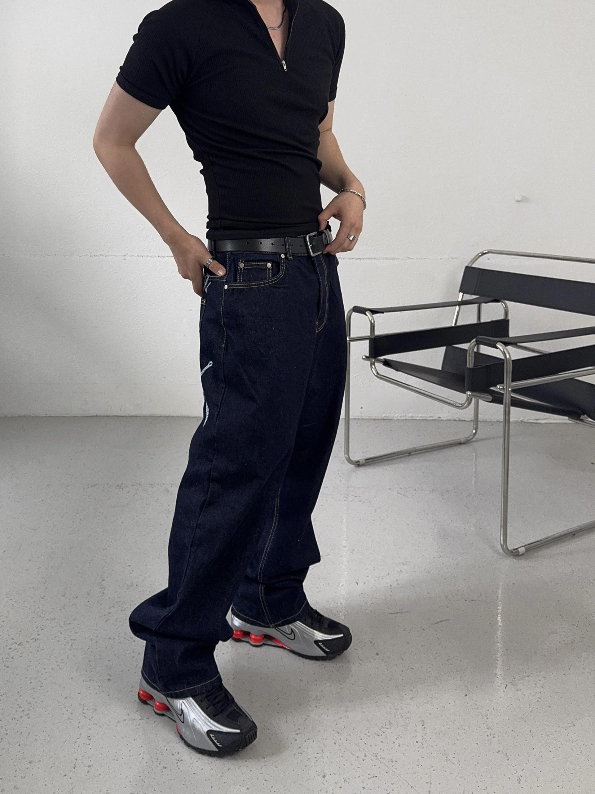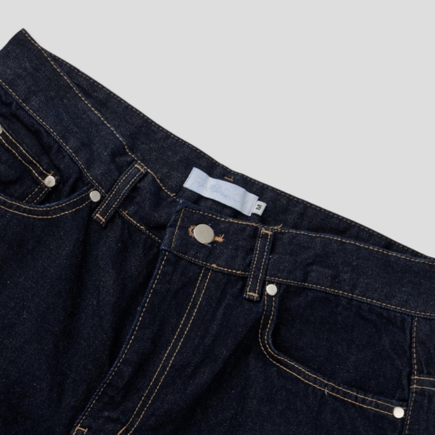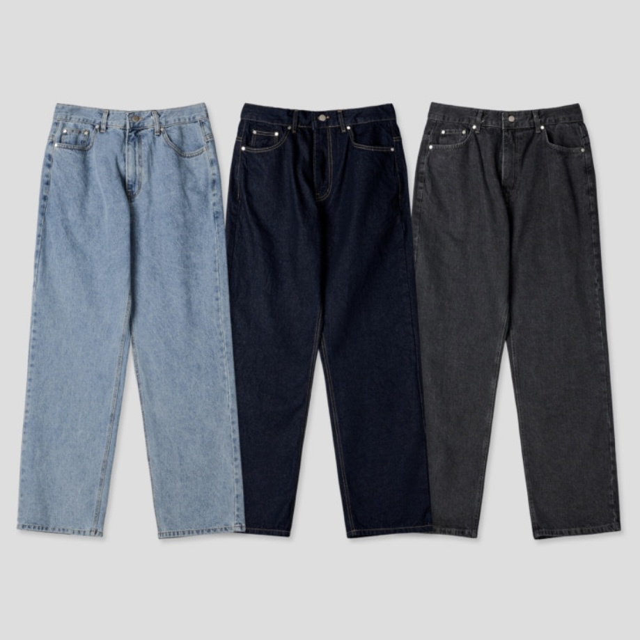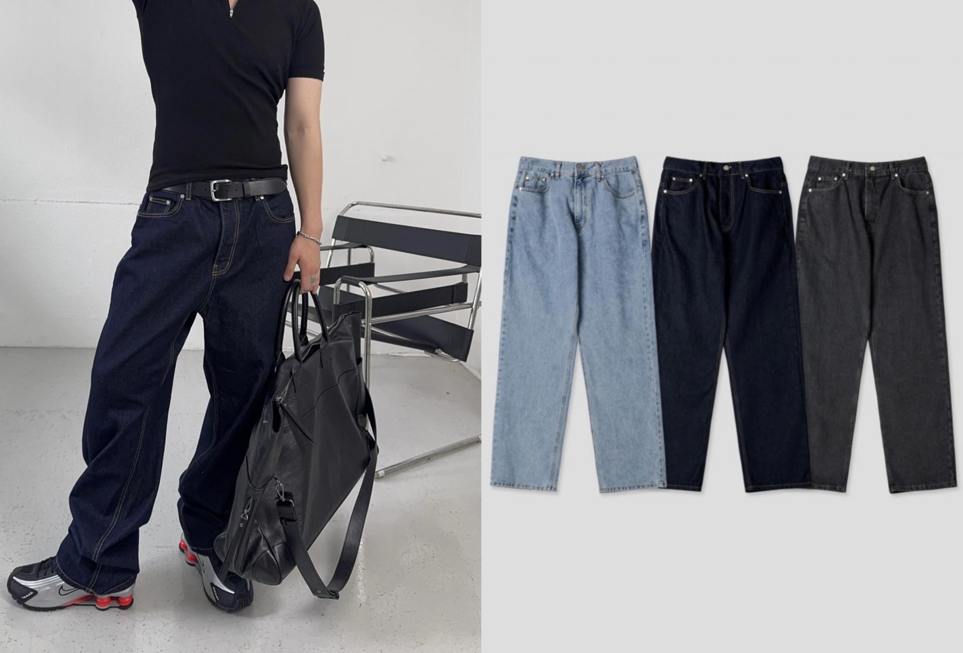 -탄탄한 데님 원단으로 제작된 와이드 팬츠