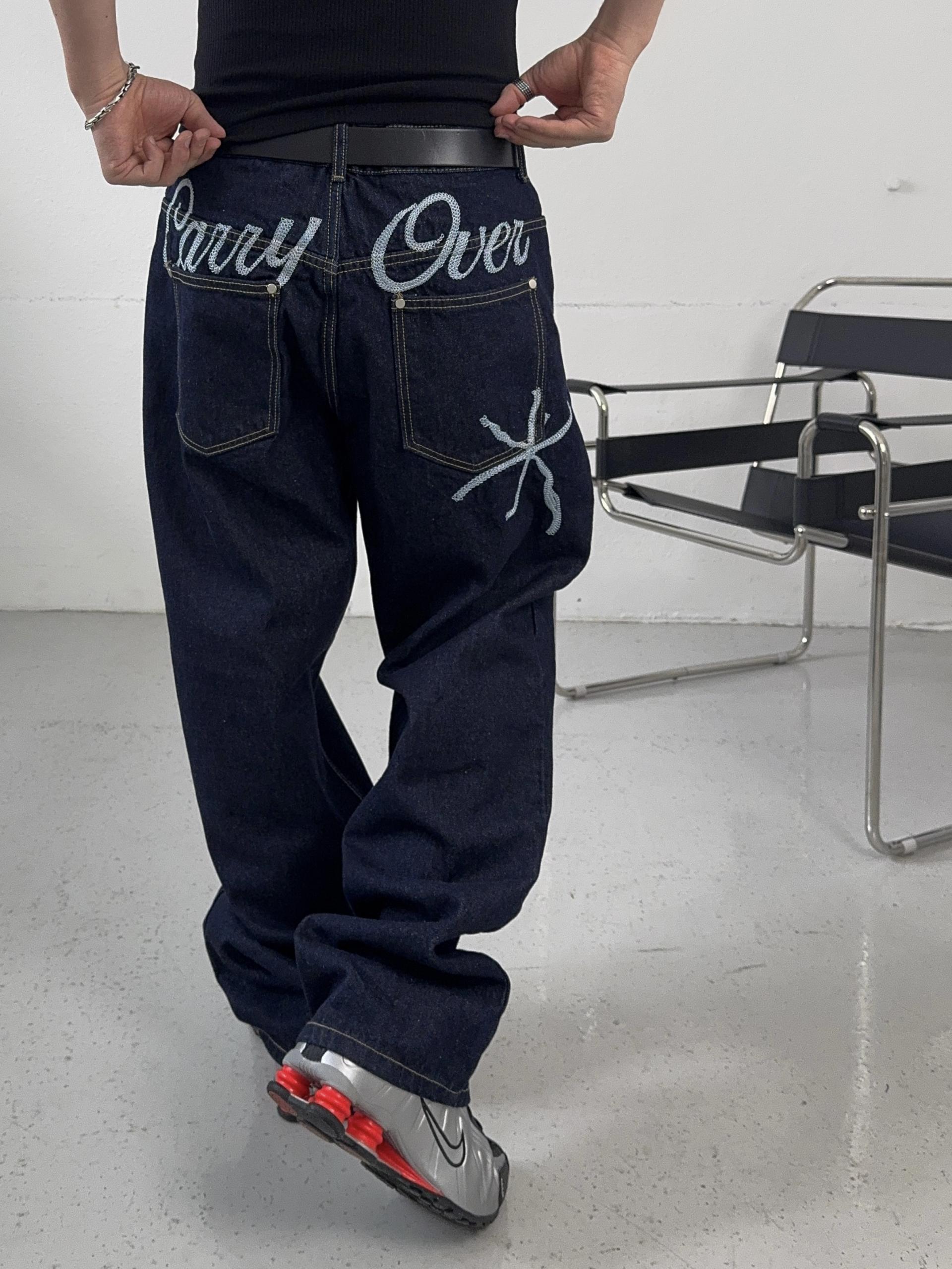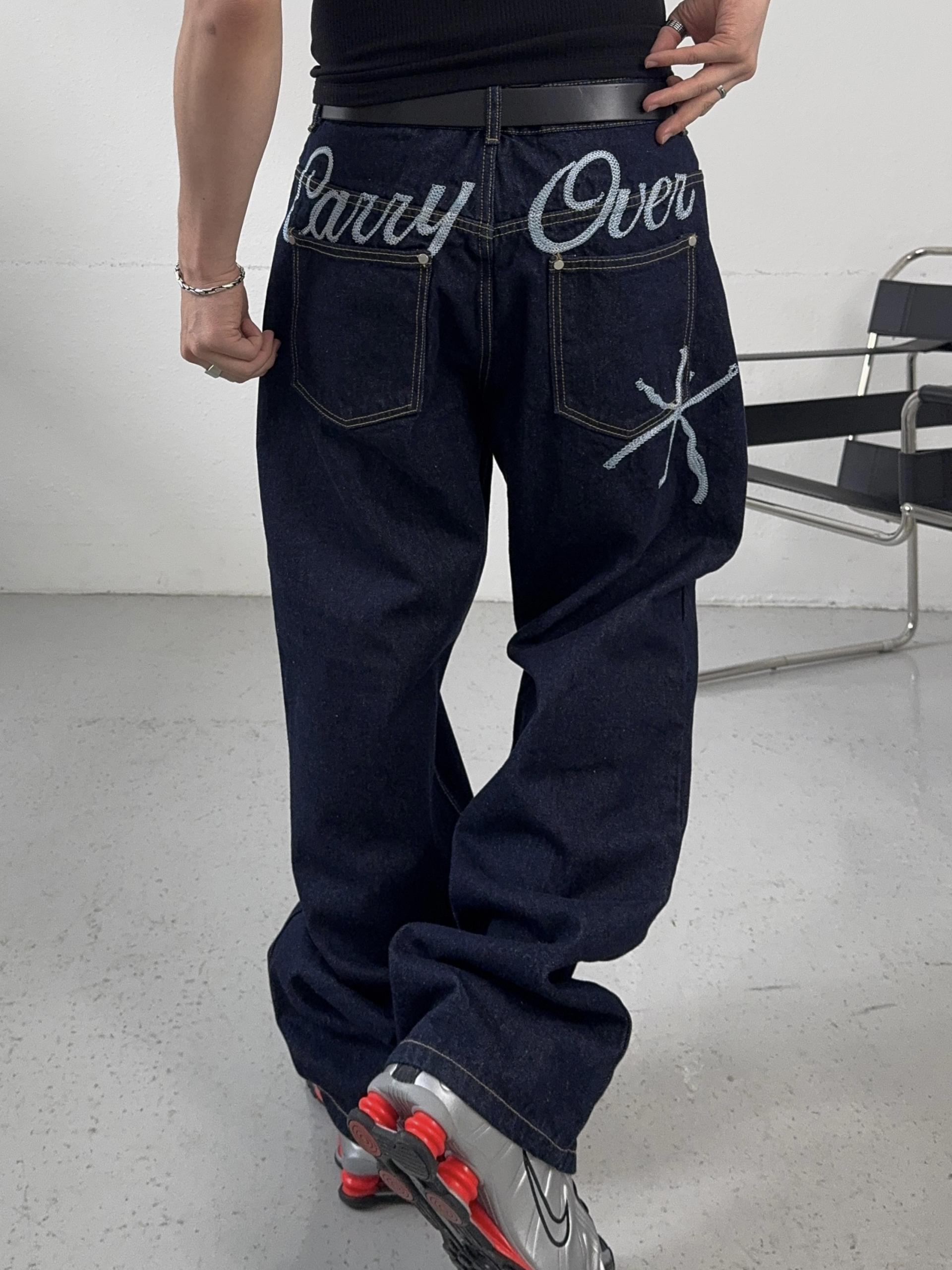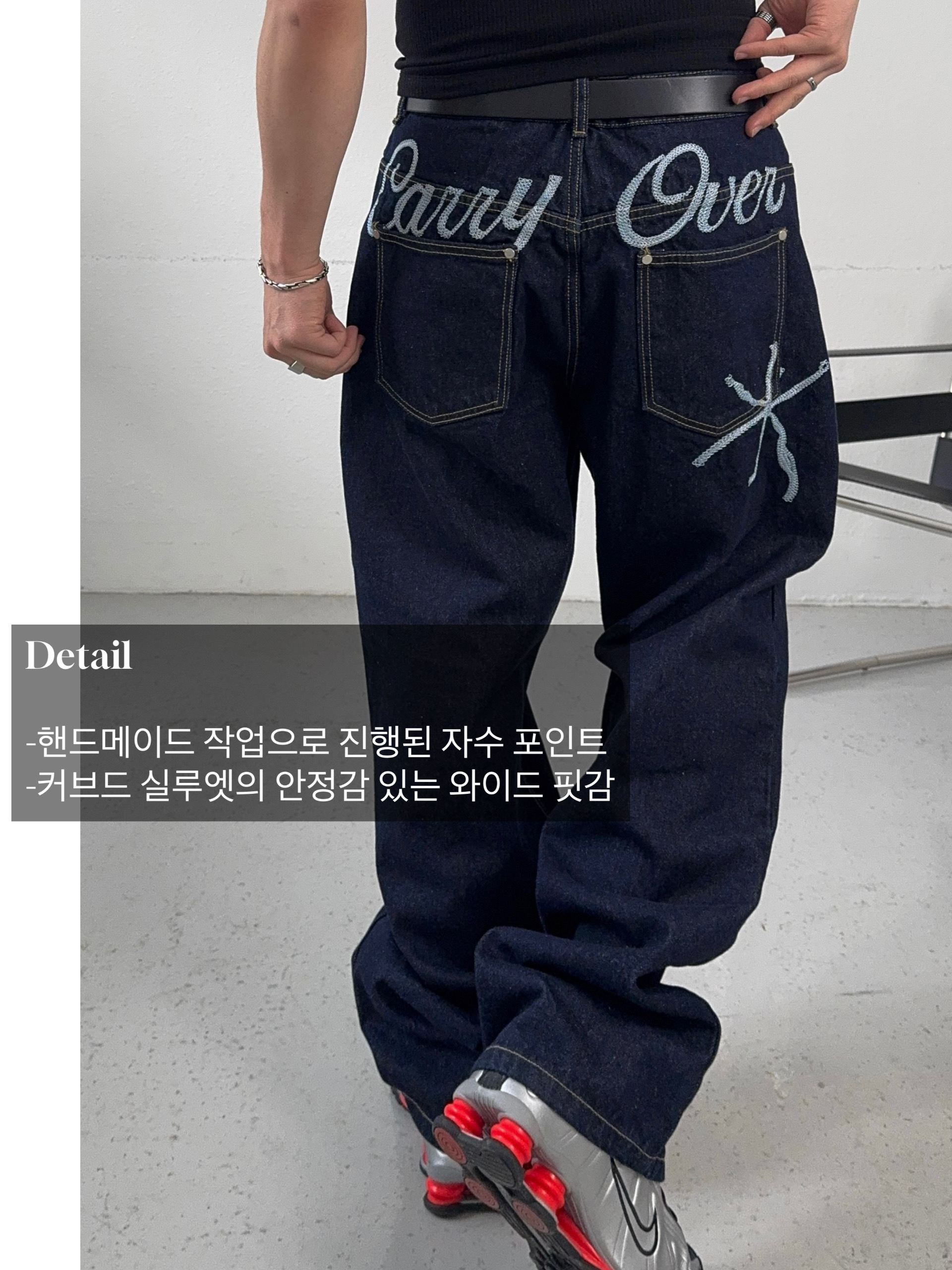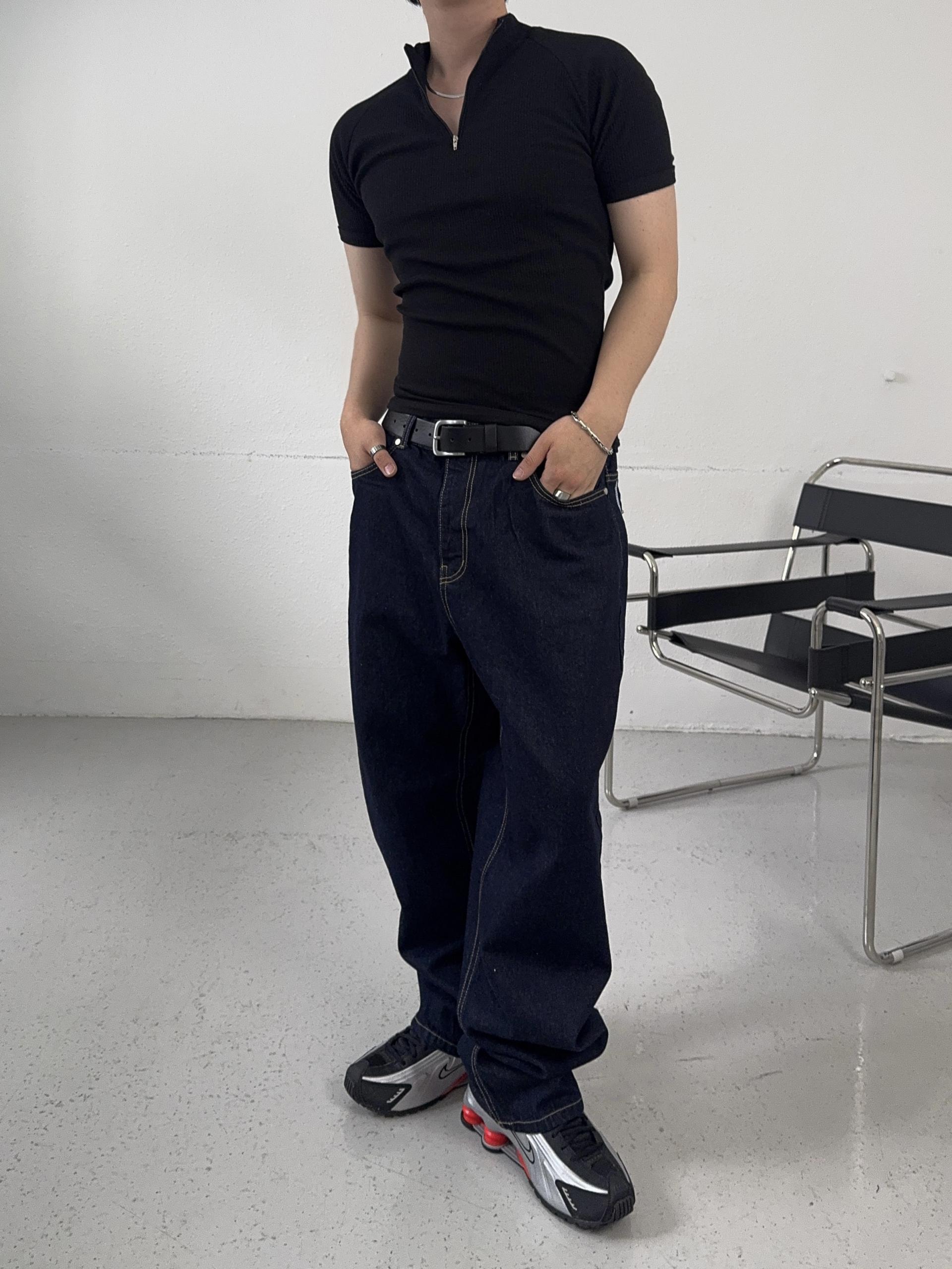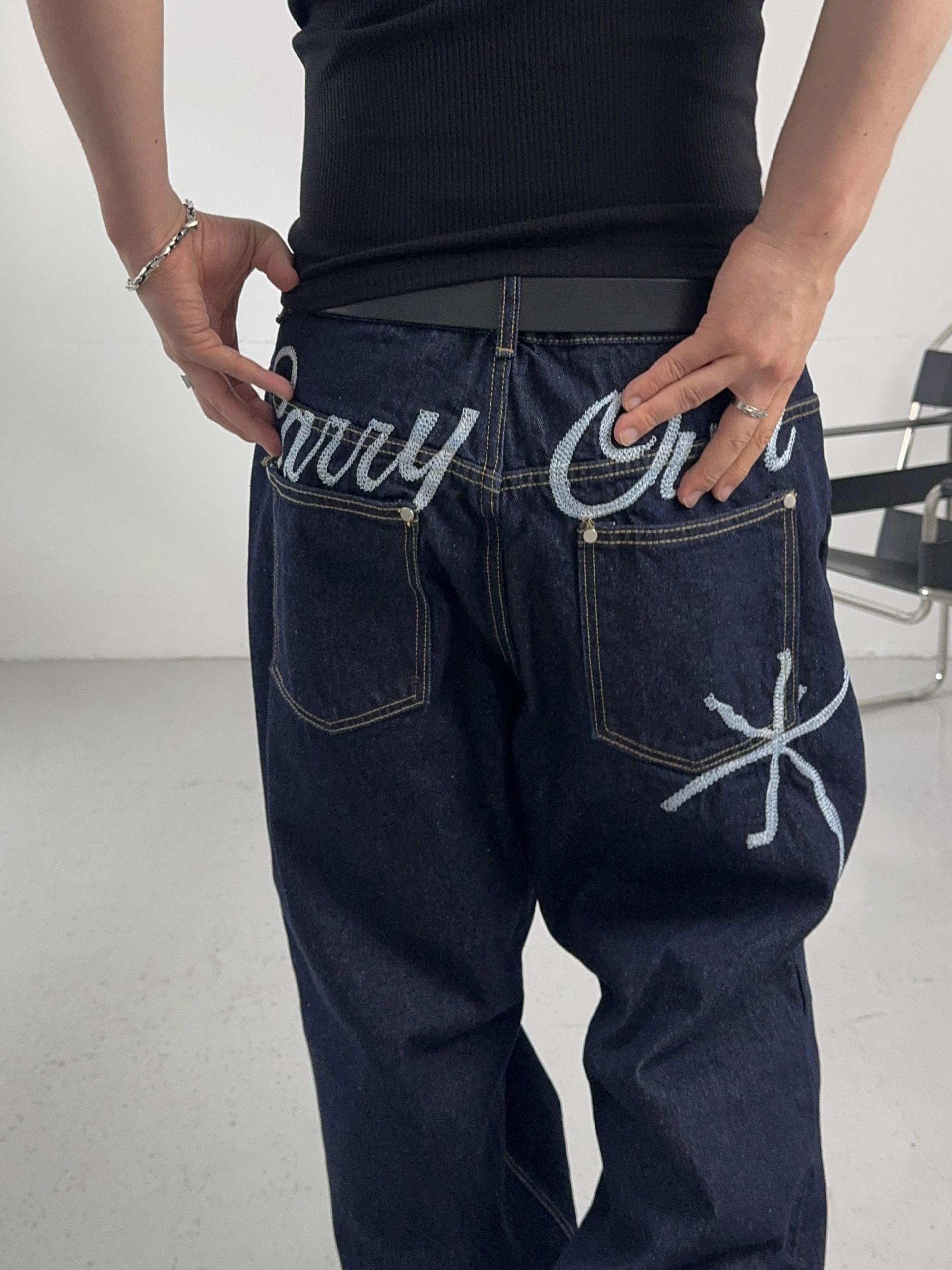 -탄탄한 데님 원단으로 제작된 와이드 팬츠